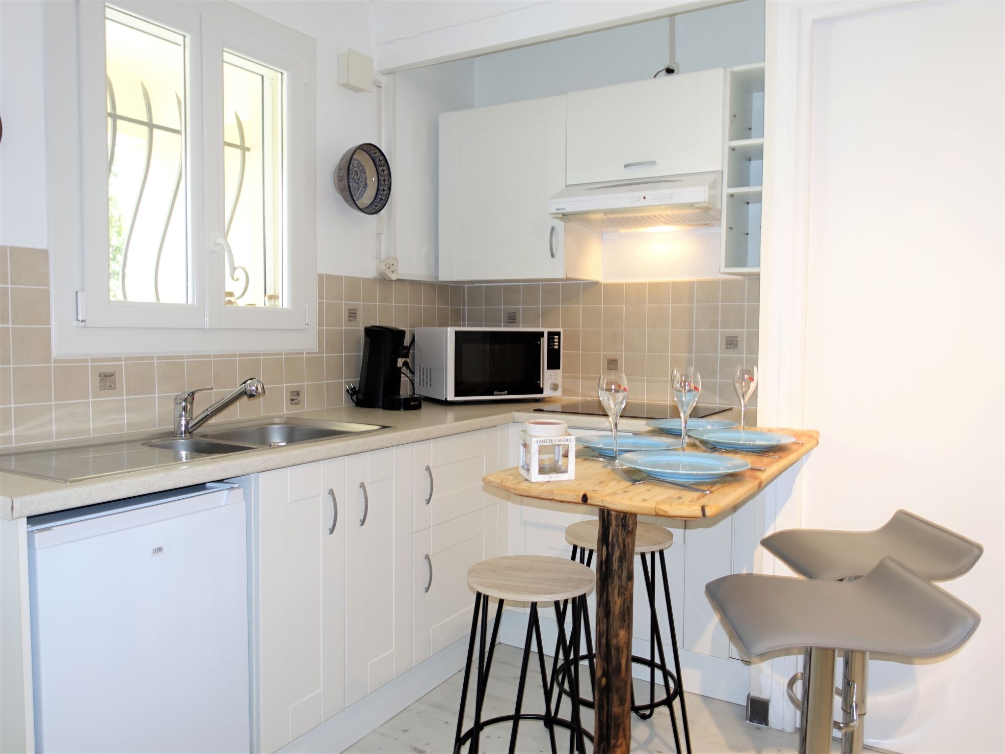 2-room apartment 30 m2, on the upper ground floor, east facing position. Beautiful furnishings: lounge with 1 double sofabed (1 x 140 cm, length 190 cm), TV (flat screen). Exit to the terrace, to the patio. 1 room with 2 beds (80 cm, length 190 cm). Exit to the balcony. Open kitchen (mini-oven, 4 induction hot plates, toaster, kettle, microwave, freezer, electric coffee machine, Capsules for coffee machine (Senseo) extra) with dining nook. Exit to the terrace, to the patio. Shower/WC. Terrace 20 m2, north facing position and, east facing position, patio 15 m2. Terrace furniture, deck chairs (1). Facilities: washing machine, iron. Internet (WiFi, free). Please note: no parking. 1 pet/ dog allowed. TV only FR. Smoke alarm. Offer by a private individual according to Art. 155, IV of CGI.