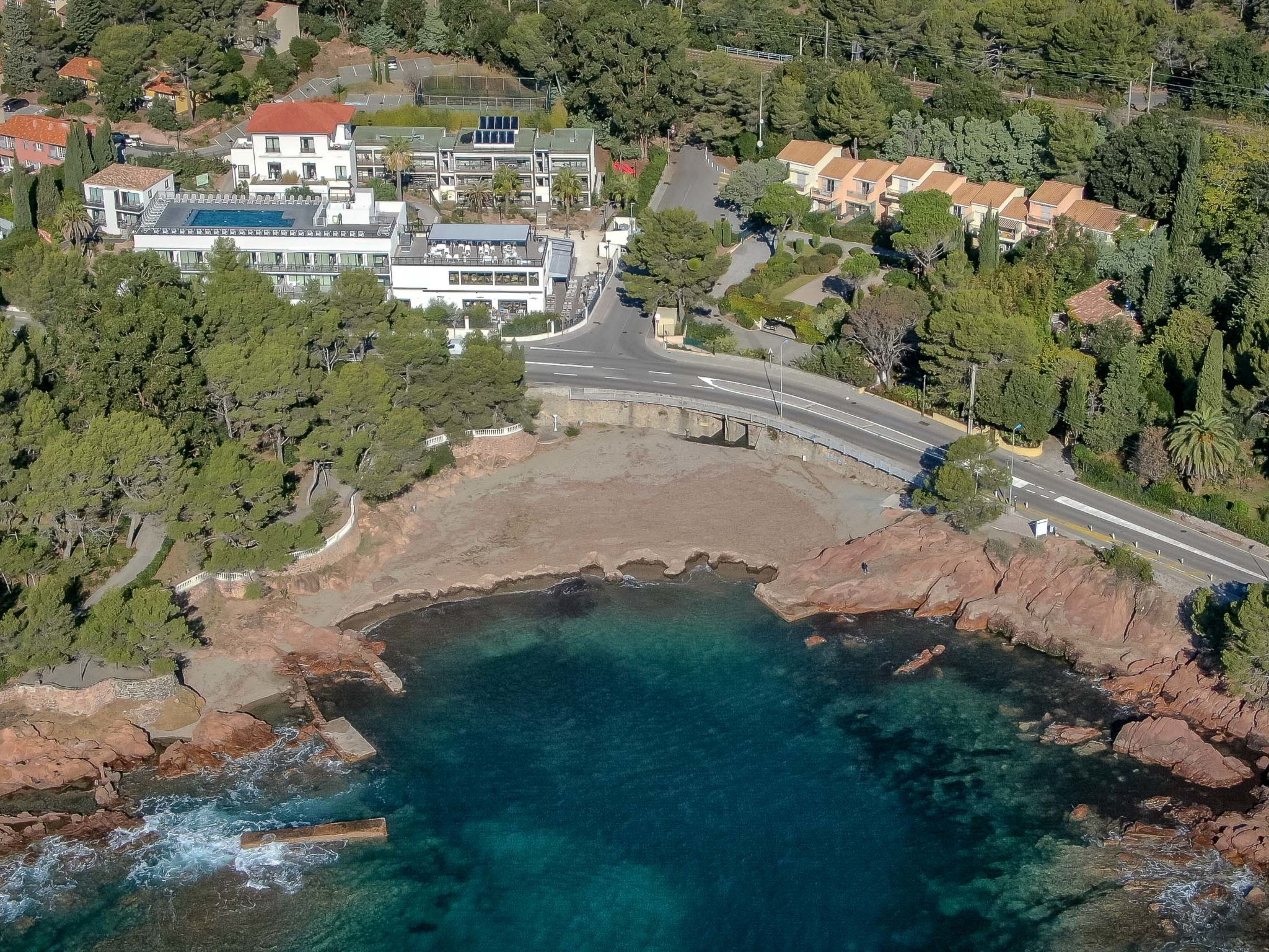 Resort "Sowell Résidences Les Chênes Verts". 116 apartments in the residence. In the district of Boulouris 5 km from the centre of Saint Raphaël, 8.5 km from the centre of Fréjus, 50 km from the centre of Cannes, on a slope, in the residential district, 100 m from the sea. For shared use: property 30'000 m2 (fenced), well-kept garden, 2 swimming pools heated (12 x 6 m, seasonal availability: 01.Apr. - 31.Oct. pool opening hours: 10:00-19:00). Outdoor shower, boccia, children's playground. In the complex: reception, restaurant, bar, WiFi, bicycle rental. Parking (extra). Shop 1 km, bus stop 50 m, pebble beach 100 m. Please note: main road 100 m from the property. Railway line 30 m from the property. The photograph shows a typical example. The holiday properties may differ in living space, floorplan, equipment and furnishing.