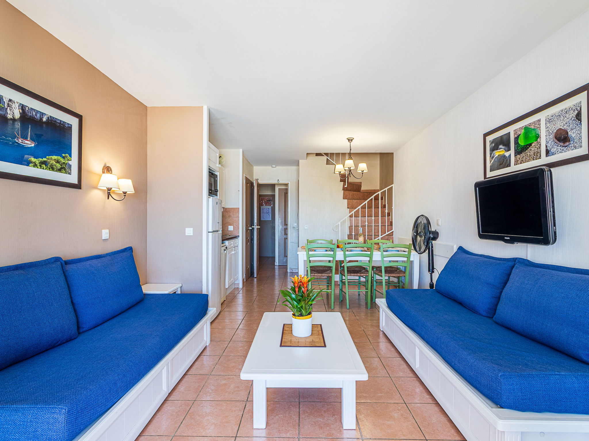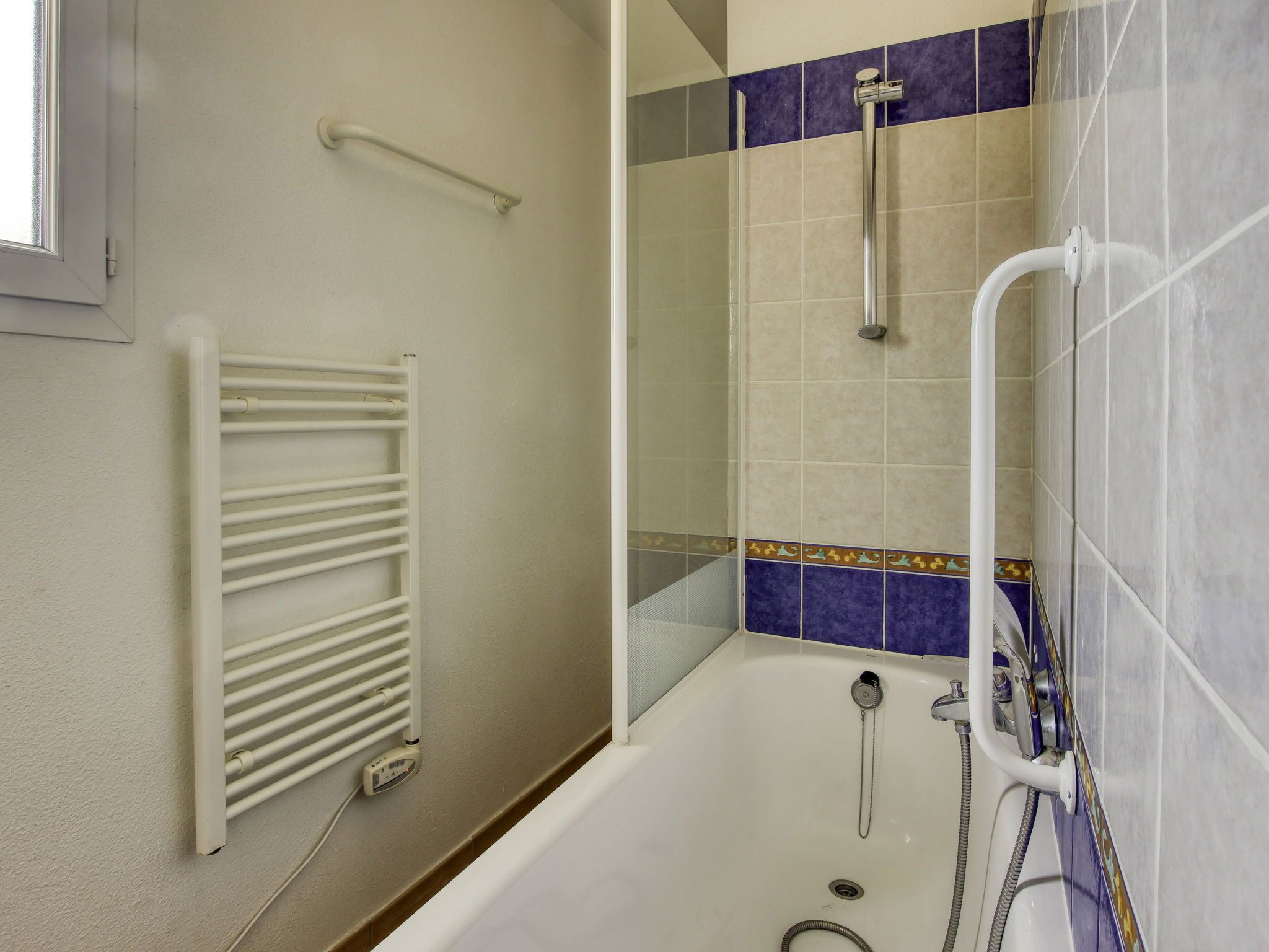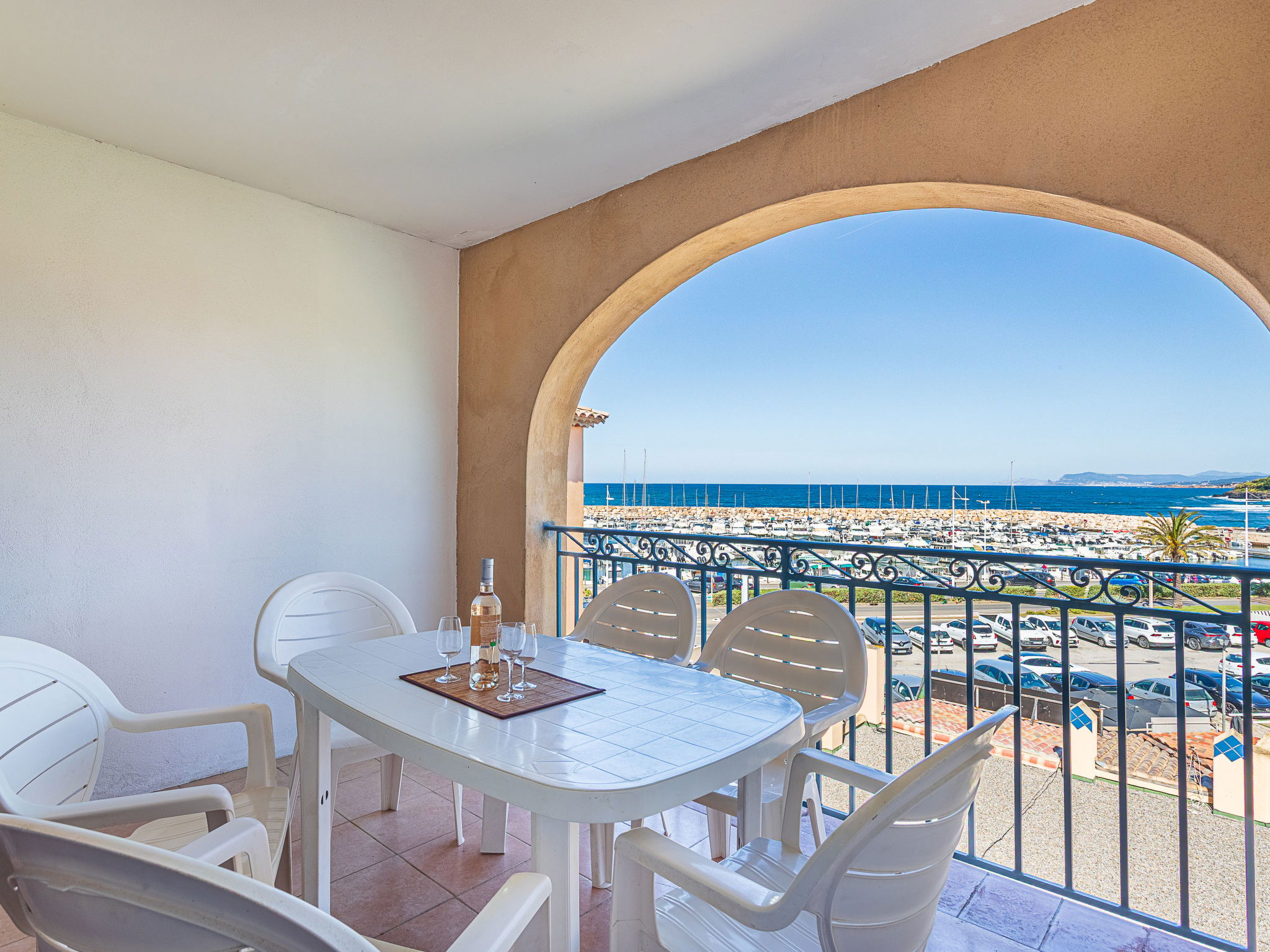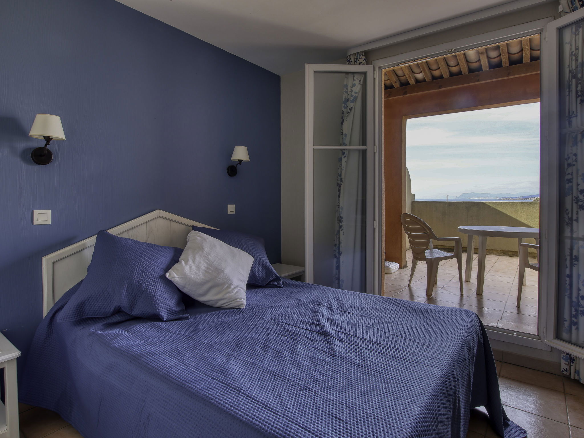 3-room apartment 45 m2 on 2 levels on 2nd floor. Practical and beautiful furnishings: living/dining room with 2 beds (80 cm, length 190 cm), TV (flat screen). Exit to the terrace. Sleeping alcove with 1 x 2 bunk beds (80 cm, length 190 cm). Kitchenette (dishwasher, 4 ceramic glass hob hotplates, toaster, kettle, freezer, electric coffee machine, combination microwave). Shower/WC. Upper floor: 1 room with 1 french bed (140 cm, length 190 cm). Exit to the balcony. Bath/WC. Electric heating. Balcony 12 m2, west facing position, terrace 7 m2, roofed, west facing position. Terrace furniture. Beautiful view of the sea. Facilities: washing machine. Internet (WiFi, extra). Parking space n 549 (niveau 2) (roofed), height 190 cm, width 249 cm. Please note: non-smokers only. Maximum 1 pet/ dog allowed. TV only FR. Smoke alarm, no lift. Instead of an enclosed bedroom, some sleeping areas are located in an open-plan area (gallery, alcove, etc.).