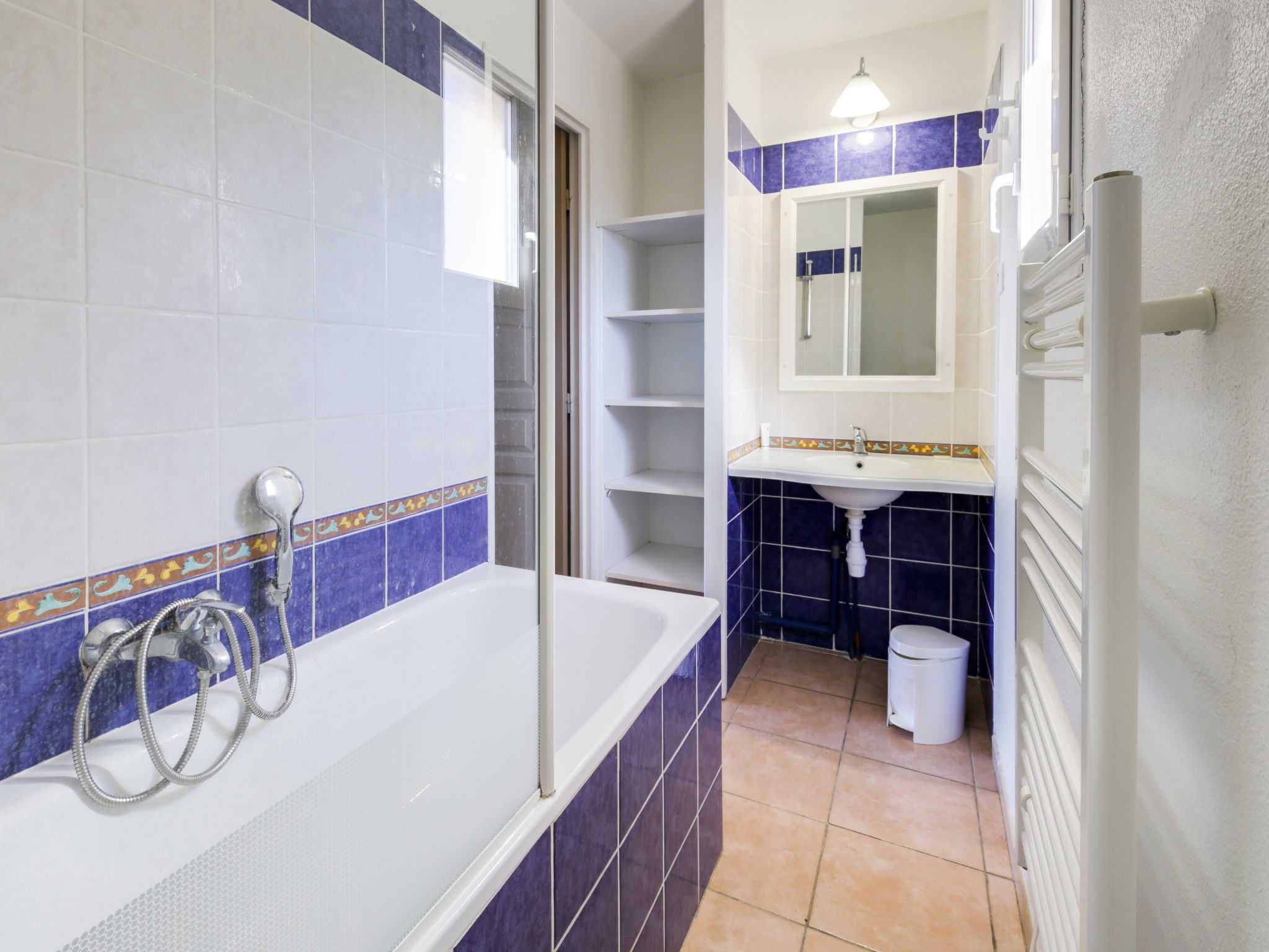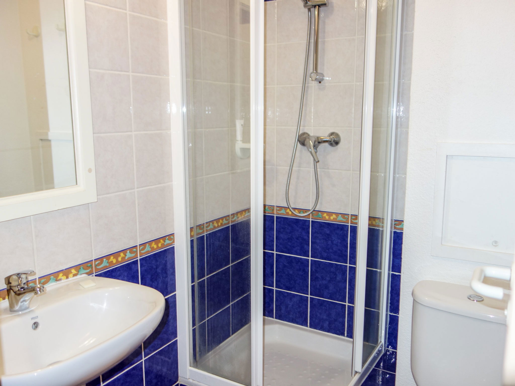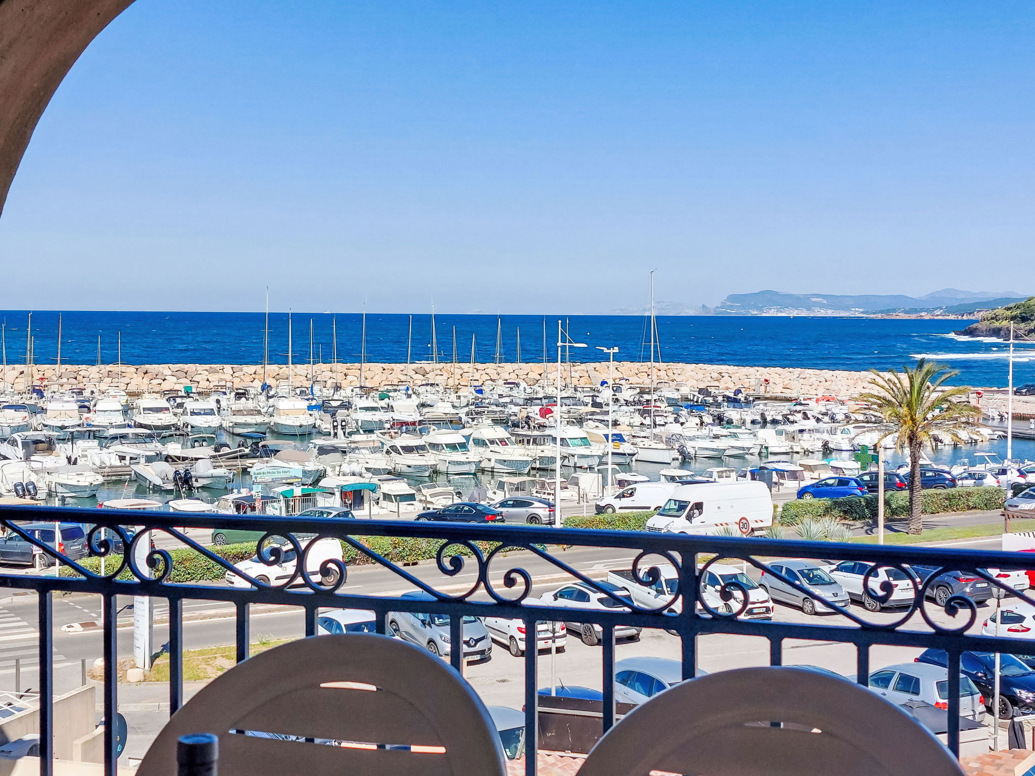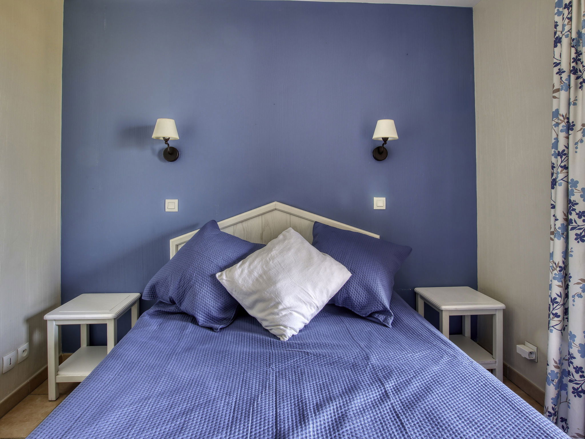 3-room apartment 45 m2 on 2 levels on 2nd floor. Practical and beautiful furnishings: living/dining room with 2 beds (80 cm, length 190 cm), TV (flat screen). Exit to the terrace. Sleeping alcove with 1 x 2 bunk beds (80 cm, length 190 cm). Kitchenette (dishwasher, 4 ceramic glass hob hotplates, toaster, kettle, freezer, electric coffee machine, combination microwave). Shower/WC. Upper floor: 1 room with 1 french bed (140 cm, length 190 cm). Exit to the balcony. Bath/WC. Electric heating. Balcony 12 m2, west facing position, terrace 7 m2, roofed, west facing position. Terrace furniture. Beautiful view of the sea. Facilities: washing machine. Internet (WiFi, extra). Parking space n 549 (niveau 2) (roofed), height 190 cm, width 249 cm. Please note: non-smokers only. Maximum 1 pet/ dog allowed. TV only FR. Smoke alarm, no lift. Instead of an enclosed bedroom, some sleeping areas are located in an open-plan area (gallery, alcove, etc.).