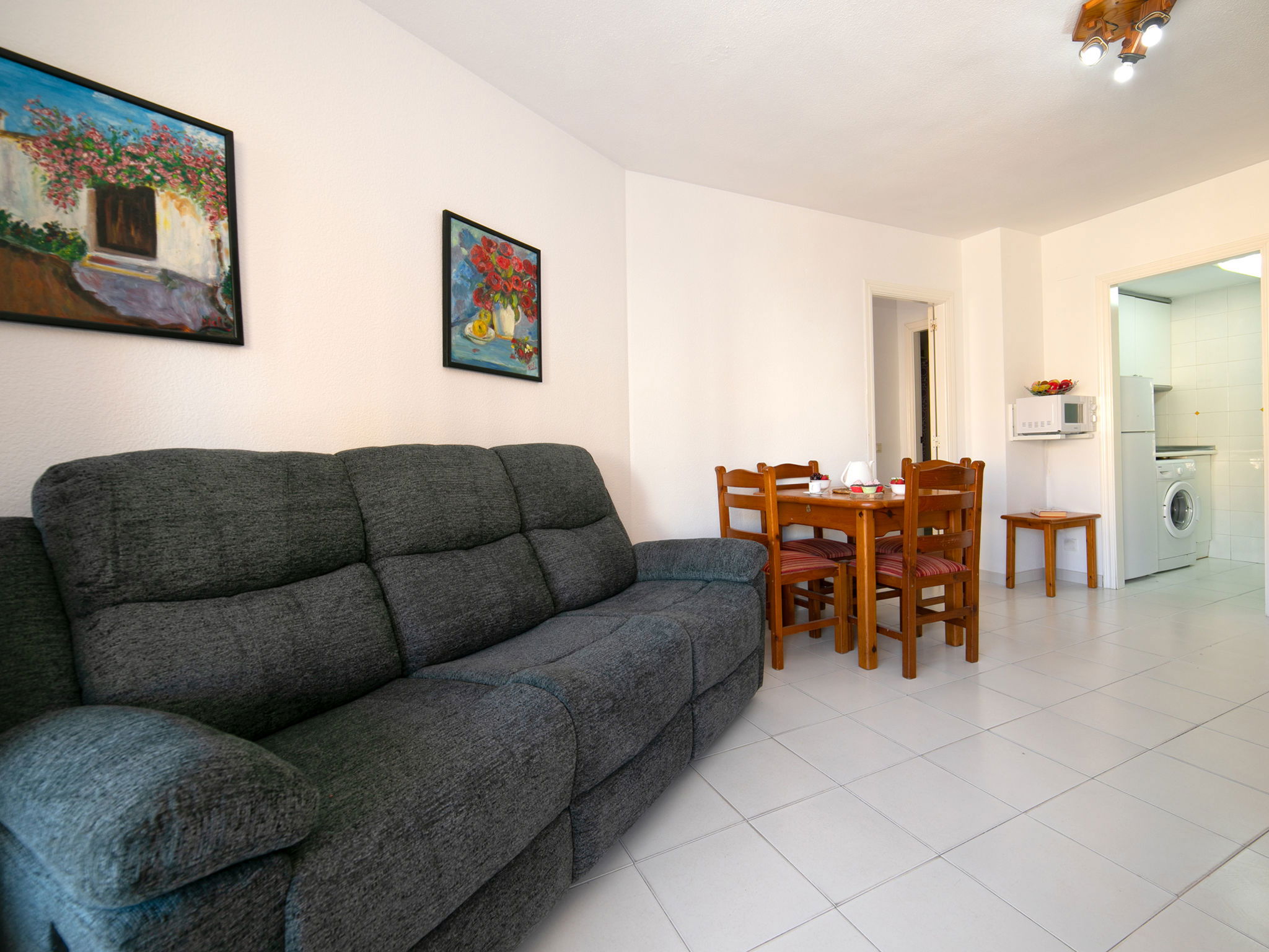 "Apolo VII", 3-room apartment 60 m2. Practical and comfortable furnishings: living/dining room with digital TV, air conditioning and forced-air heating. Exit to the terrace. 1 room with 1 french bed and bath/WC. 1 room with 2 beds. Small kitchen (oven, 4 ceramic glass hob hotplates, toaster, kettle, microwave, electric coffee machine). Shower/WC. Terrace. Terrace furniture. View of the swimming pool and the town. Facilities: washing machine, iron, children's high chair, baby cot for up to 2 year olds. Internet (WiFi, free). Parking space n 72 (roofed, 1 car). 1 small pet/ dog allowed. AT-438393-A // Reg. Nr.: ESFCTU00000302900044681300000000000000000AT-438393-A8