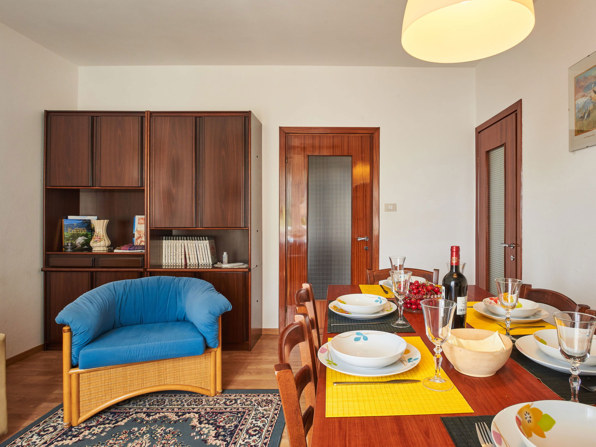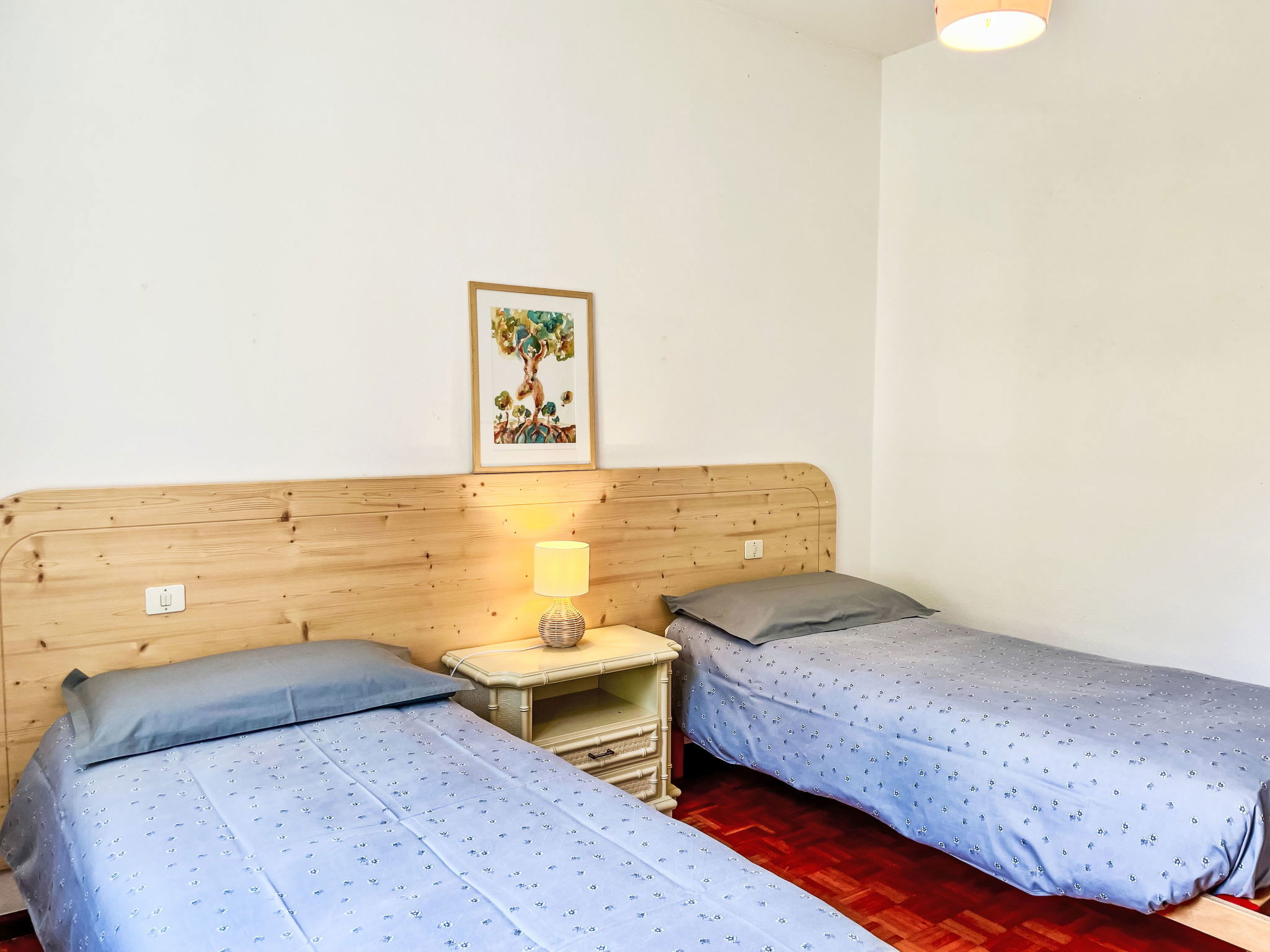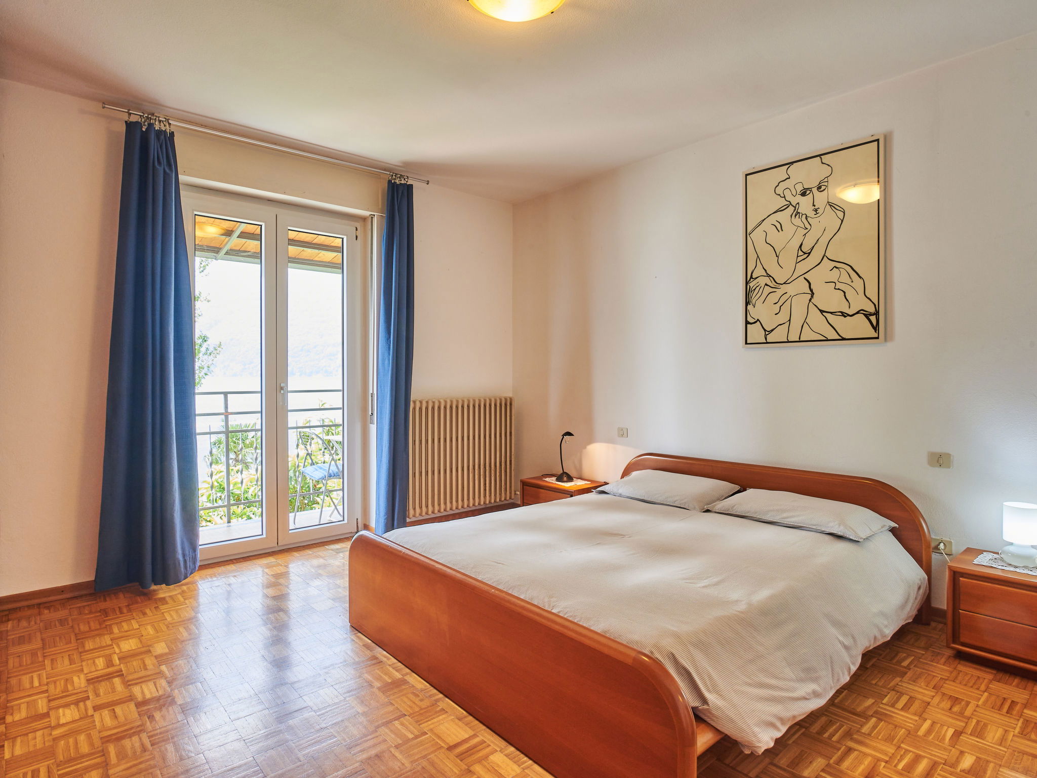 4-room apartment 100 m2 on 2nd floor, west facing position. Practical furnishings: living/dining room with dining table and satellite TV. 1 room with 1 french bed (160 cm). 2 rooms, each room with 2 beds. Kitchen (oven, dishwasher, 4 gas rings, toaster, kettle, freezer, electric coffee machine) with dining table. Shower/WC. Oil heating. Parquet floors. Balcony, patio, lawn 80 m2. Balcony furniture, deck chairs (4). View of the lake and the mountains. Facilities: washing machine, iron, children's high chair, baby cot for up to 2 year olds. Please note: non-smokers only. Maximum 2 pets/ dogs allowed. No lift. IT014075C2QJSTEJPF
