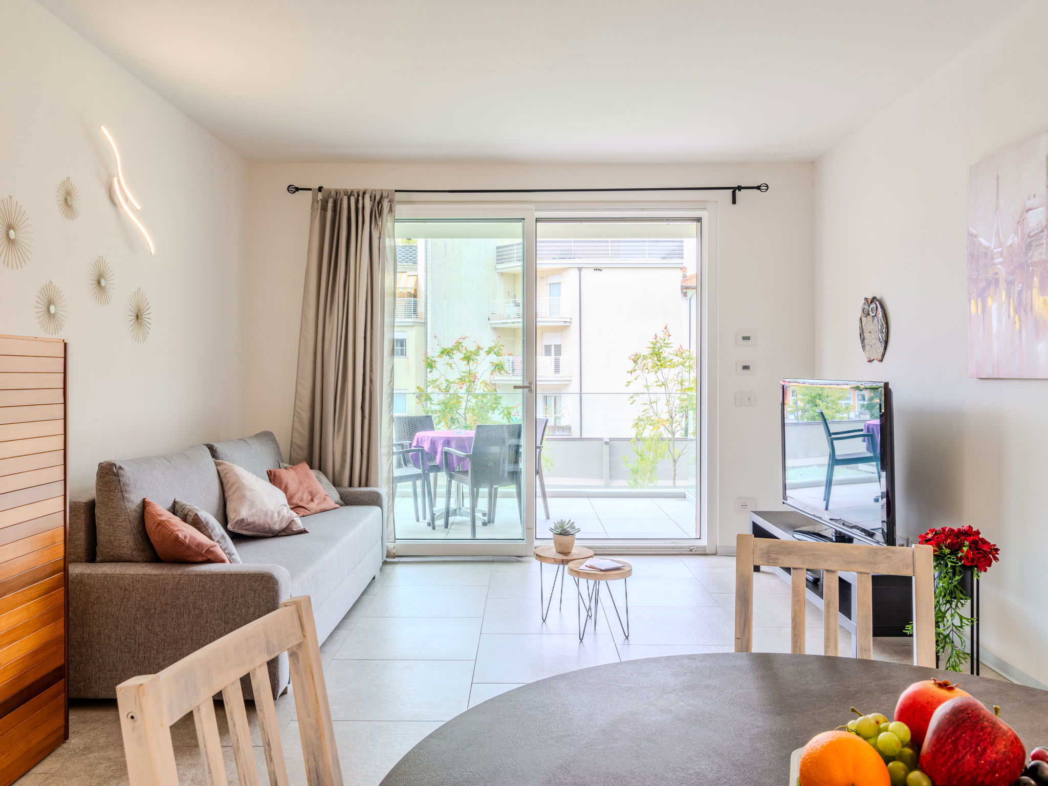 "Arianna", 3-room apartment 83 m2 on 2nd floor. Spacious, modern and cosy furnishings: living room with 1 double sofabed (138 cm, length 193 cm), TV. Exit to the terrace. 1 room with 1 bed. 1 double bedroom. Open kitchen in the entrance (oven, 4 induction hot plates, freezer) with dining table. Exit to the terrace. Shower/bidet/WC. Heating, air-conditioning. Large terrace. Terrace furniture, sitting area. Beautiful view of the town. Facilities: iron, hair dryer. Parking space n 145 (roofed, 1 car). Please note: non-smokers only. Maximum 1 pet/ dog allowed. IT022006C25D99ACCV