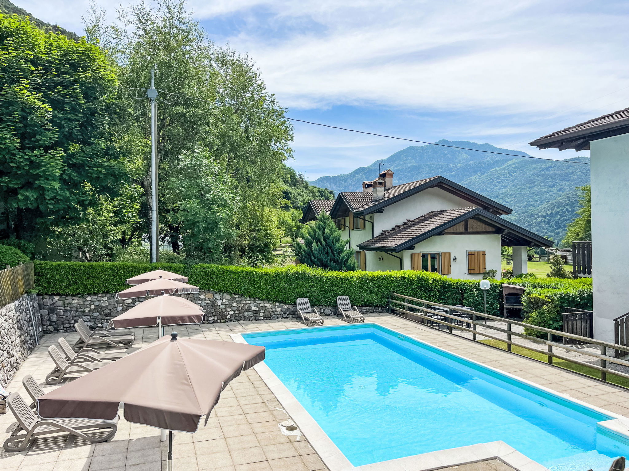 Apartment house "Dromaè", 2 storeys. 3 houses in the residence. 9 apartments in the property. In the hamlet Mezzolago, in a quiet position, 600 m from the lake. For shared use: garden, swimming pool (10 x 5 m, seasonal availability: 15.May. - 15.Sep. pool opening hours: 09:00-20:00). Barbecue. In the house: storage room for bicycles. Parking. Supermarket 1.5 km, bus stop 600 m. Please note: the photograph shows a typical example. Additional accommodations can be booked. One Trentino Guest Card is included for each reservation (on request).