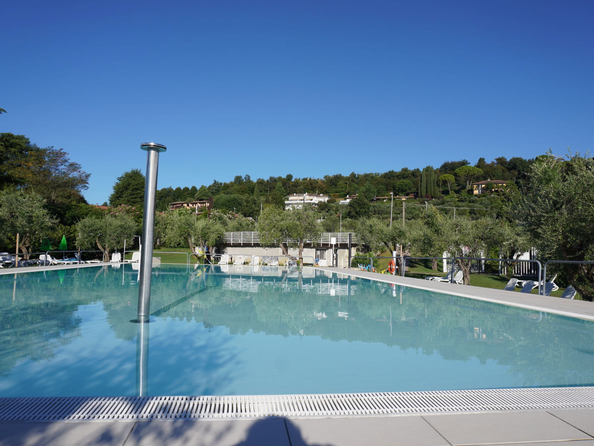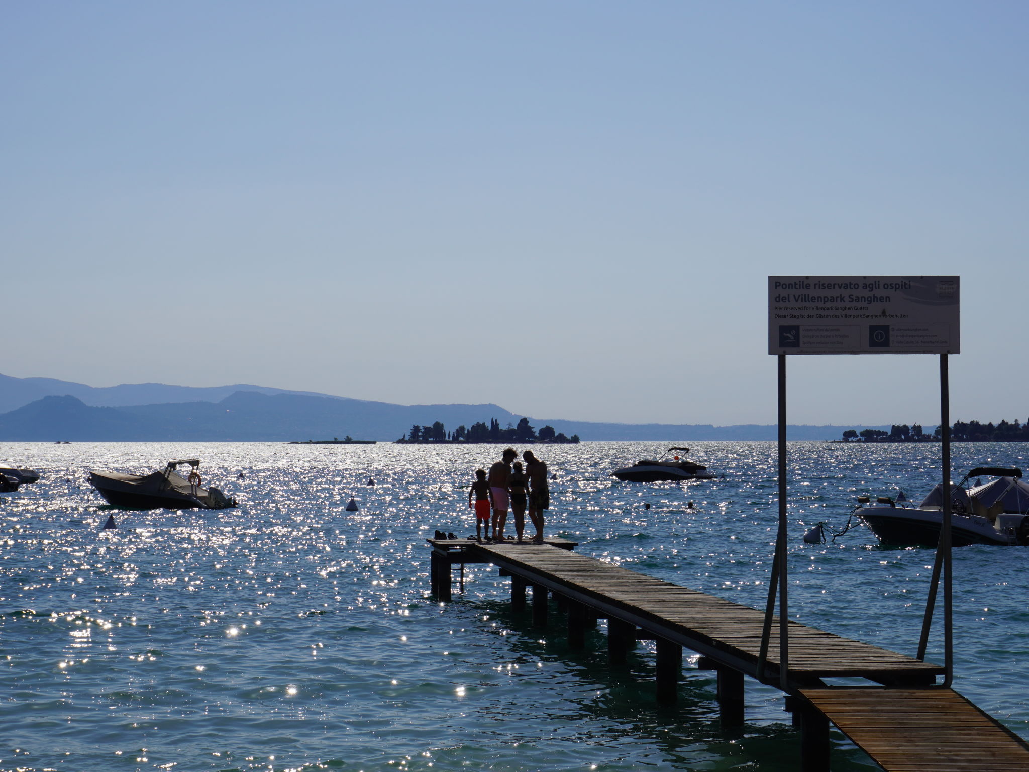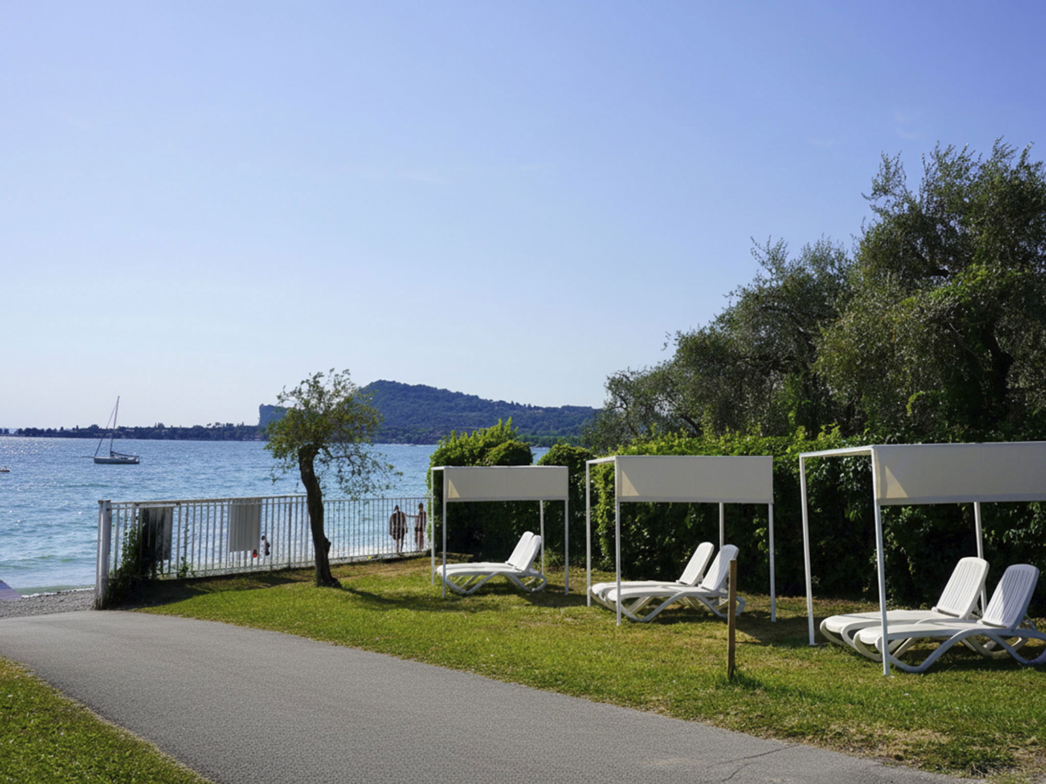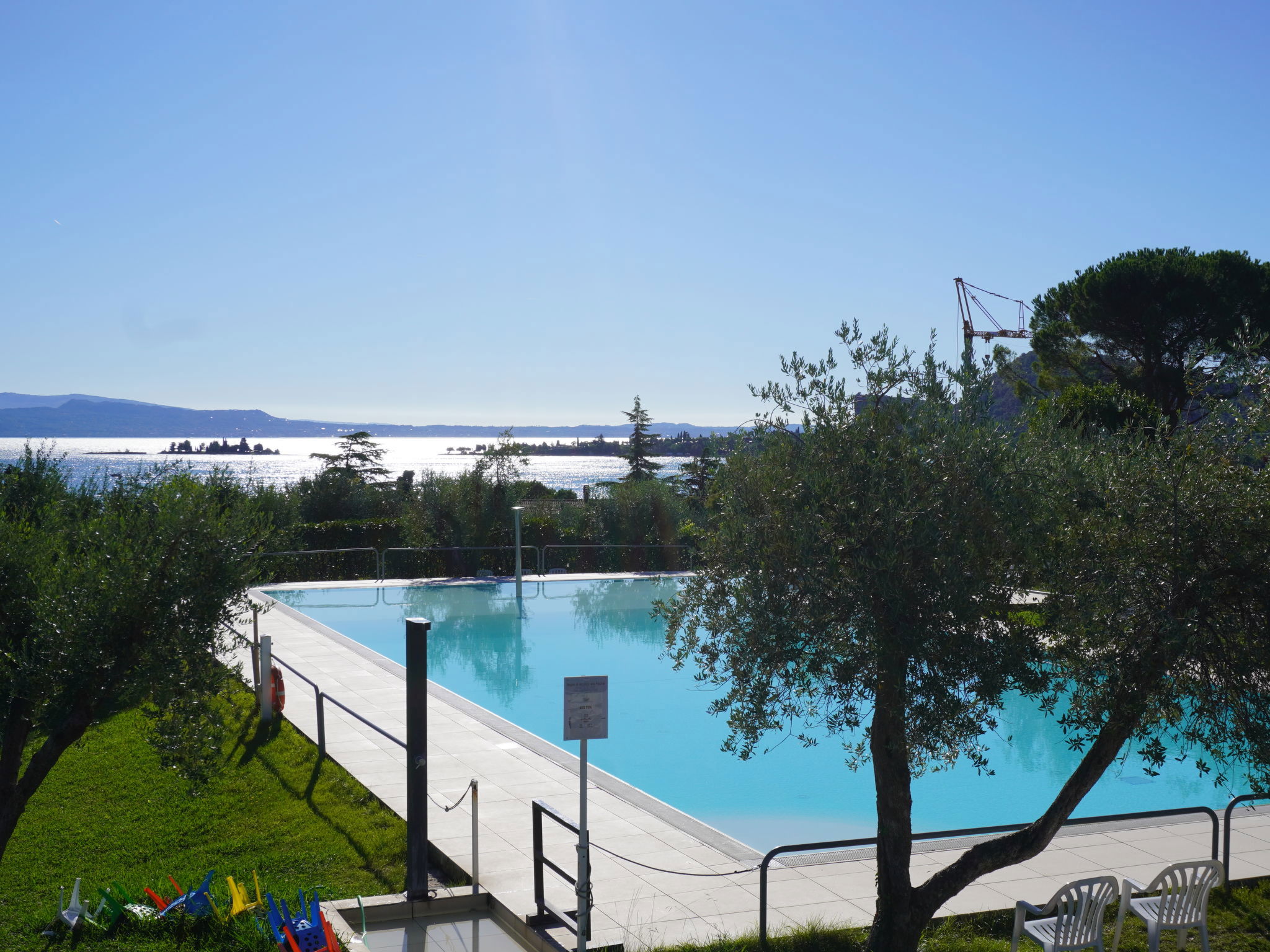 Large, child friendly resort "Sanghen". In the district of Pieve di Manerba 3.5 km from the centre of Manerba del Garda, on a slope, 250 m from the lake, 250 m from the beach, direct access to the beach. For shared use: property 70'000 m2 (fenced), trees, lawn for sunbathing, 3 swimming pools (seasonal availability: 01.May. - 30.Sep. and 01.Jul. - 31.Aug. pool opening hours: 08:30-13:00 and 15:30-19:30). Children's pool, outdoor shower, hot tub, tennis, children's playground. In the complex: reception, restaurant, bar, WiFi, washing machine (extra), tumble dryer (for shared use, extra). Bread roll service, breakfast and half board possible (extra). Stepped path to the house. Parking (limited number of spaces) on the premises. Bus stop 50 m, pebble beach 250 m. Golf course (27 hole) 6 km. Nearby attractions: Salò 9 km, Desenzano del Garda 15 km, Brescia 38 km. Please note: entertainment in the season. Suitable for families. Private mooring (extra) on request.