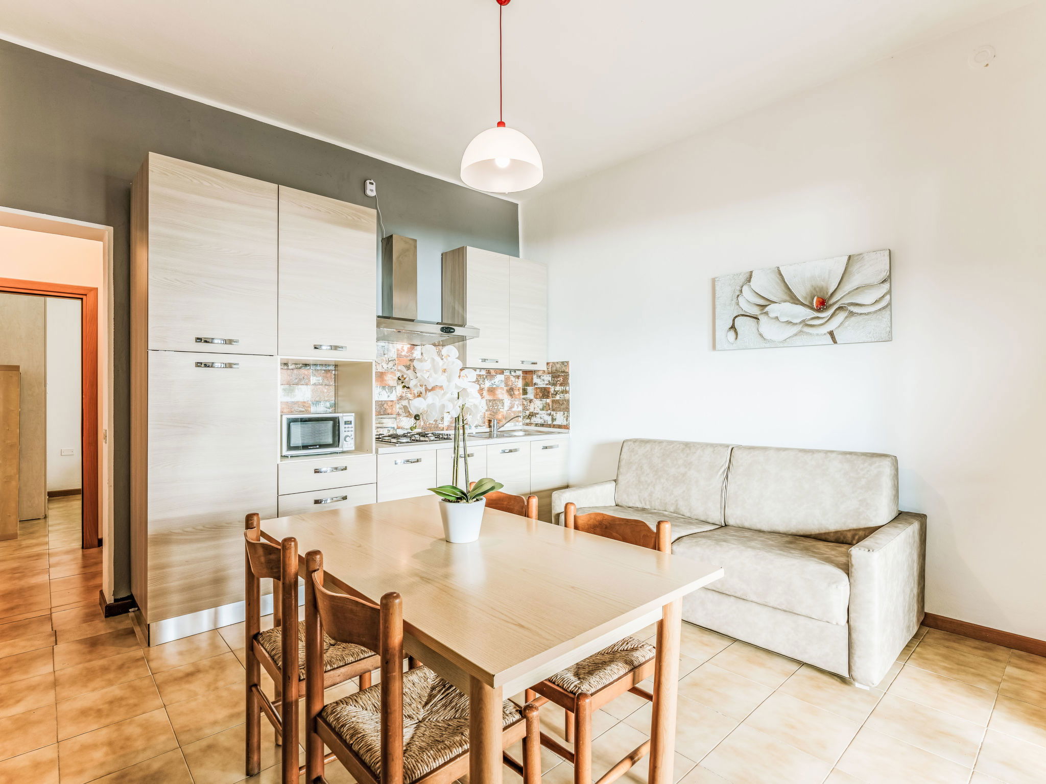 "Casa Centrale", 2-room apartment 40 m2. Comfortable furnishings: living/sleeping room with 1 double sofabed, dining table and satellite TV. 1 double bedroom. Open kitchen (4 hot plates, kettle, microwave, electric coffee machine). Shower/bidet/WC. Air-conditioning (extra). No heating option. Balcony or terrace. Terrace furniture, deck chairs (2). Facilities: safe. Parking (1 car). Maximum 1 pet/ dog allowed. IT017102B4BAME32DL