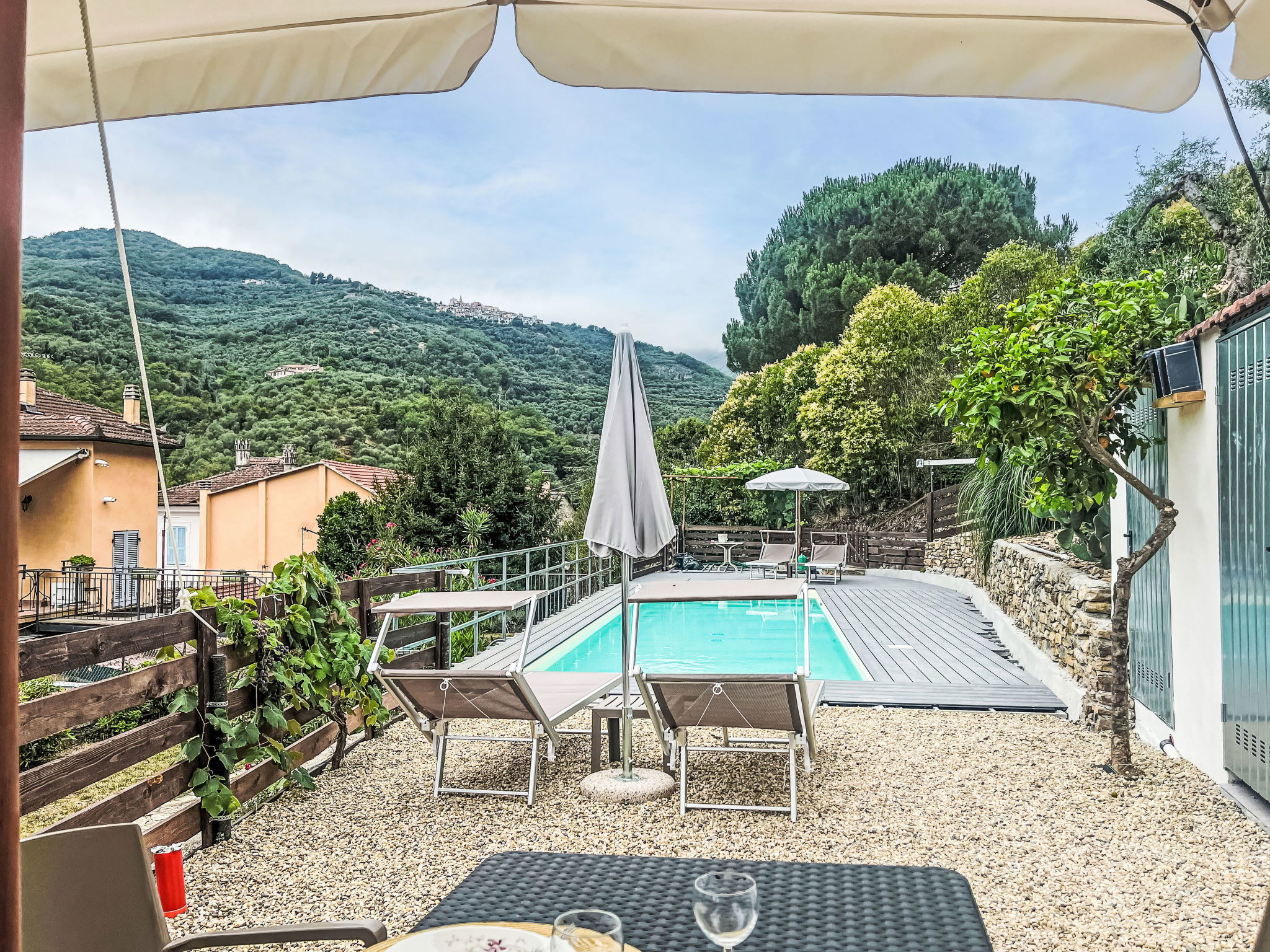 Agriturismo "Borgo Olimpo", 2 storeys, renovated in 2024, surrounded by trees and vineyards. 4 apartments in the property. In the centre of Molini di Prelá 3 km from the centre of Dolcedo, 12 km from the centre of Imperia, in a quiet, sunny position, 12 km from the sea. For shared use: property 1'000 m2, large, beautiful terraced garden (fenced), lawn for sunbathing, swimming pool secured, fenced (10 x 3 m, depth 140 - 140 cm, seasonal availability: 01.May. - 10.Oct.). Shower/WC in the pool area, outdoor shower, patio, terrace, garden furniture. Private: natural garden, orchard. In the house: internet access, WiFi, storage room for bicycles. Cook on request (extra). 10 m footpath to the house. Public parking 20 m. Grocery 200 m, supermarket 1 km, shopping centre 12 km, restaurant, bar 20 m, bakery 200 m, café 20 m, bicycle rental 4 km, bus stop 20 m, railway station "Imperia Oneglia" 7 km, sandy beach "Borgo Marina Imperia" 15 km pebble beach "Borgo Prino" 12 km, shingle beach "Borgo Foce Imperia" 12 km, bathing lake "laghetti" 500 m. Walking paths from the house 10 m, cycle lane 12 km, children's playground 50 m. Nearby attractions: Valloria (160 bemalte Türen) 4 km, Porto Maurizio Altstadt Parasio 12 km, Bussana Vecchia Erdbebendorf 25 km. Hiking paths: Monte Faudo. Please note: car recommended.