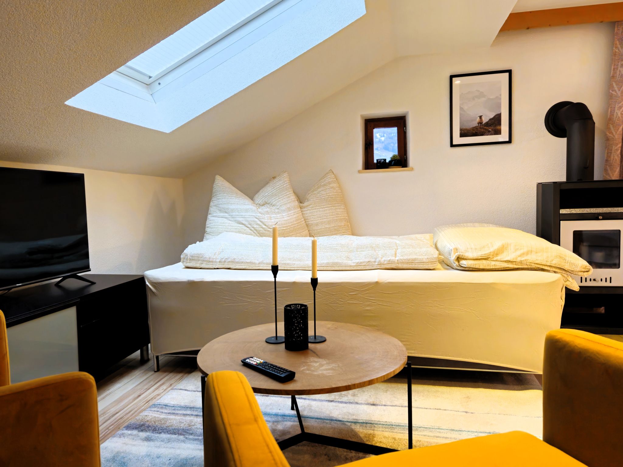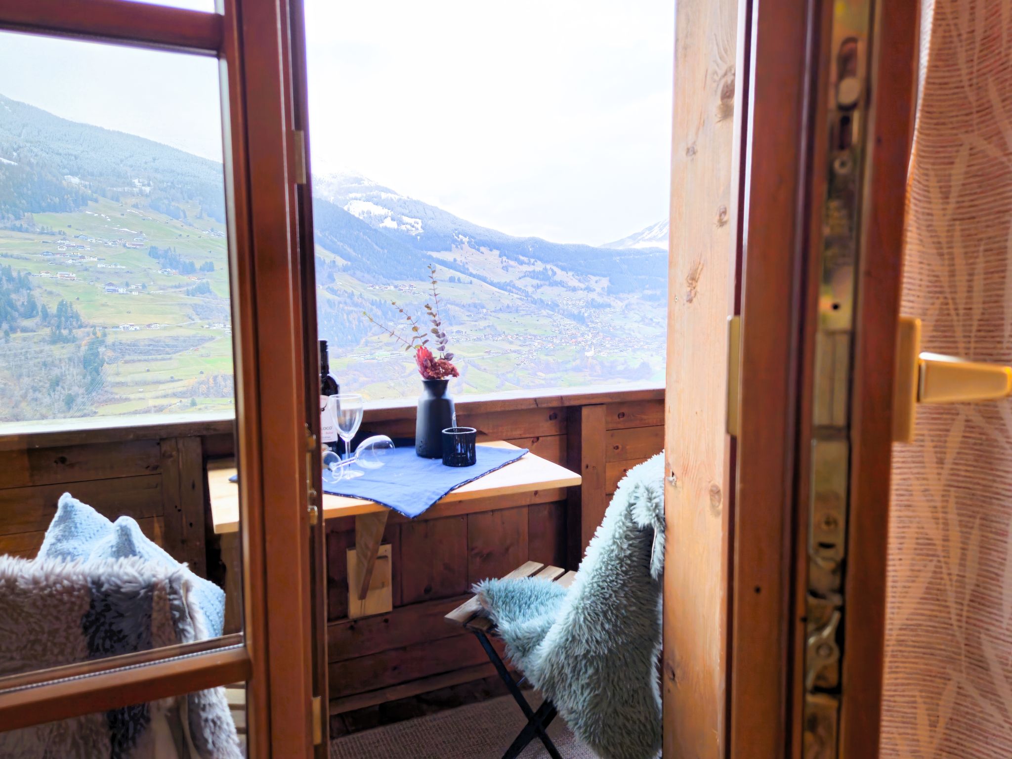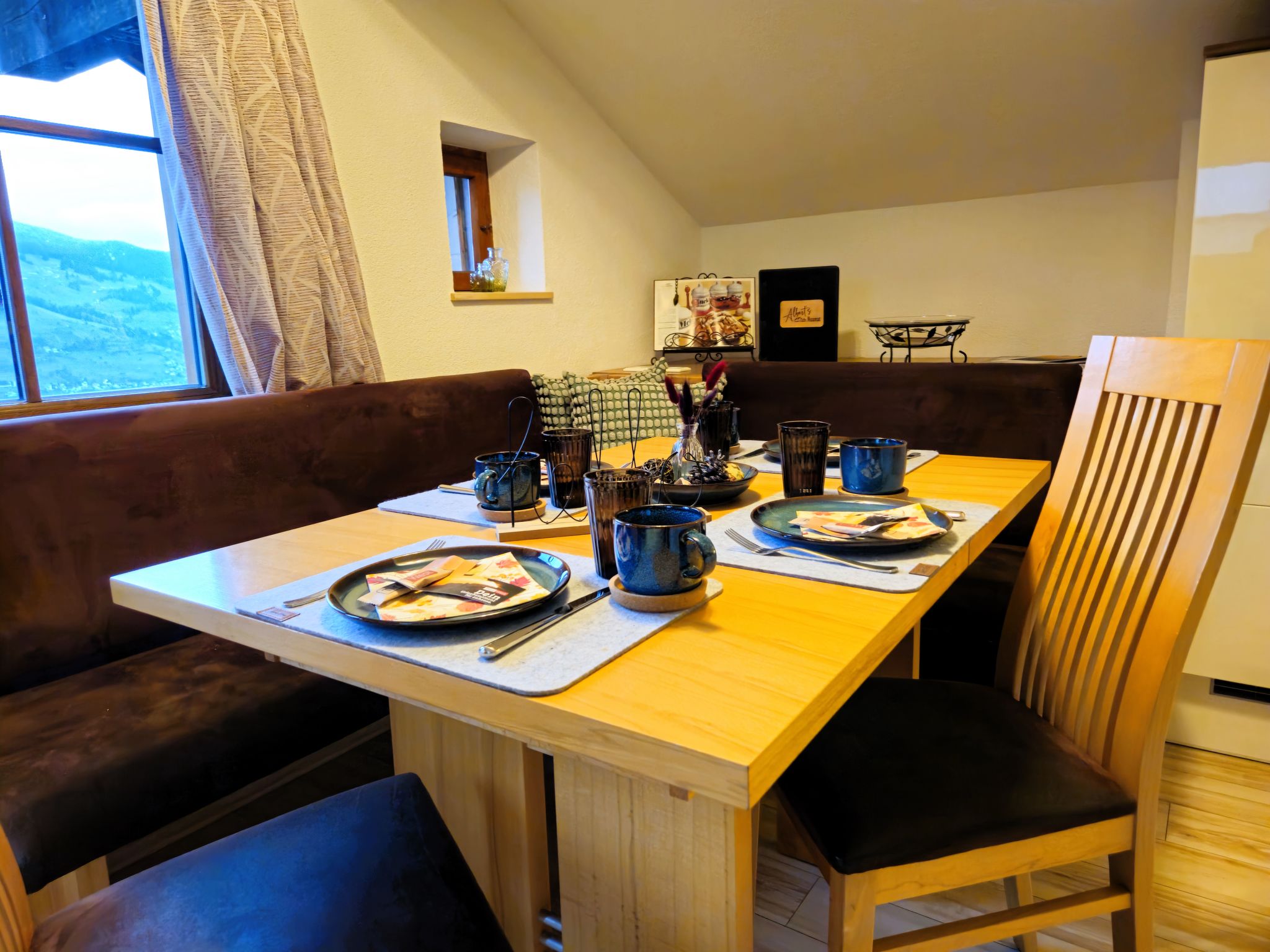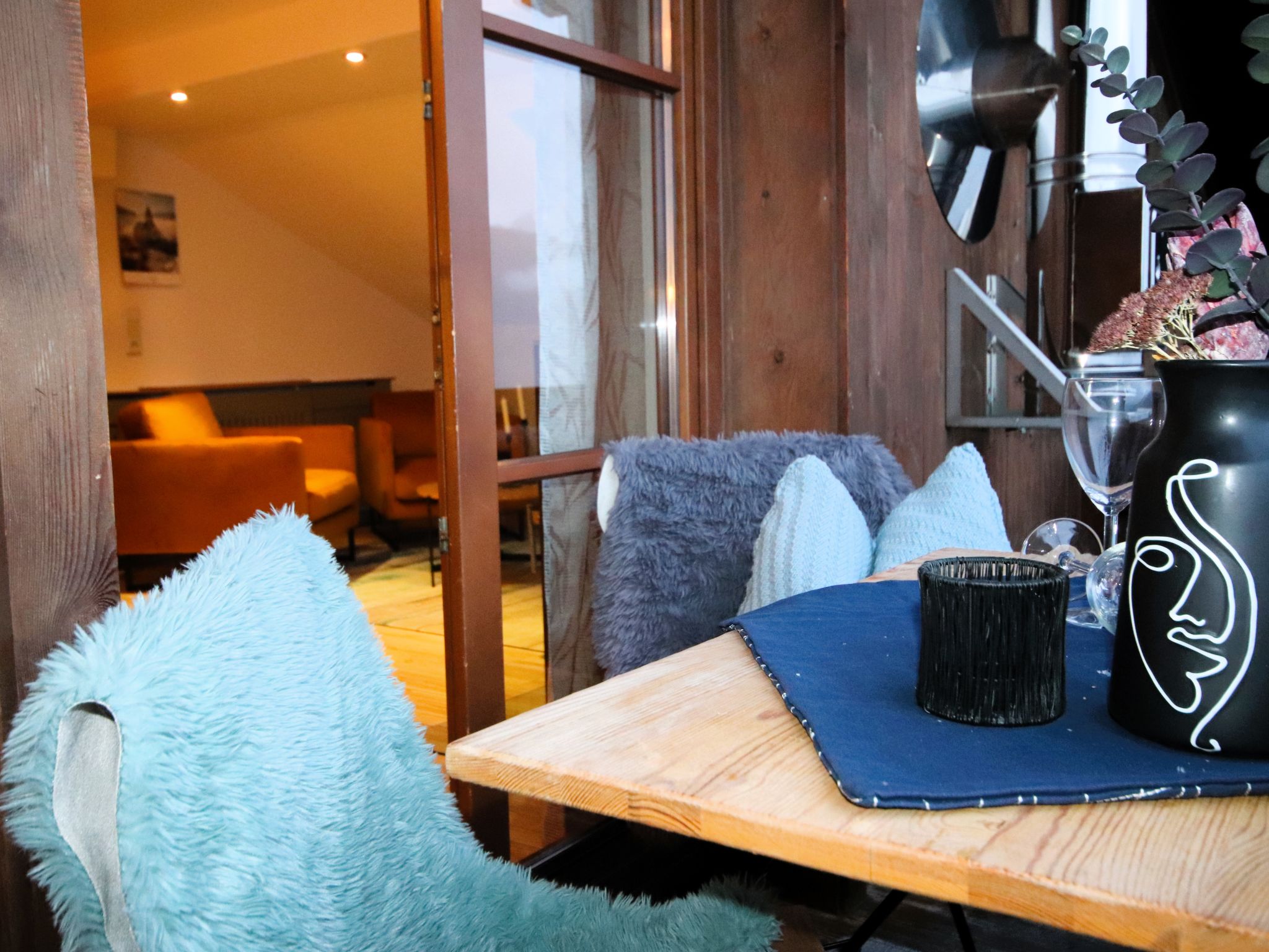 2-room apartment 55 m2 on 2nd floor. Beautiful and cosy furnishings: with sloping ceilings, 1 double bedroom with Dressing room. Large kitchen-/living room (dishwasher, 4 ceramic glass hob hotplates, toaster, kettle, electric coffee machine, combination microwave) with 1 double bed and Scandinavian wood stove (only for decoration), satellite TV (flat screen). Exit to the balcony. Shower/WC. Wooden floors. Small balcony. Balcony furniture. Very beautiful panoramic view of the mountains and the valley. Facilities: children's high chair, baby cot. Internet (WiFi, free). Parking. 1 small pet/ dog allowed.