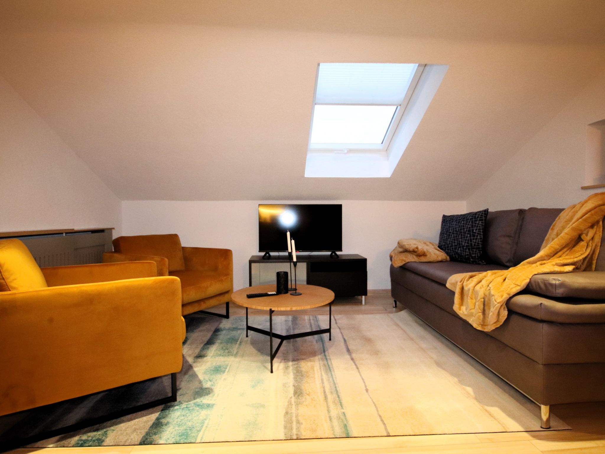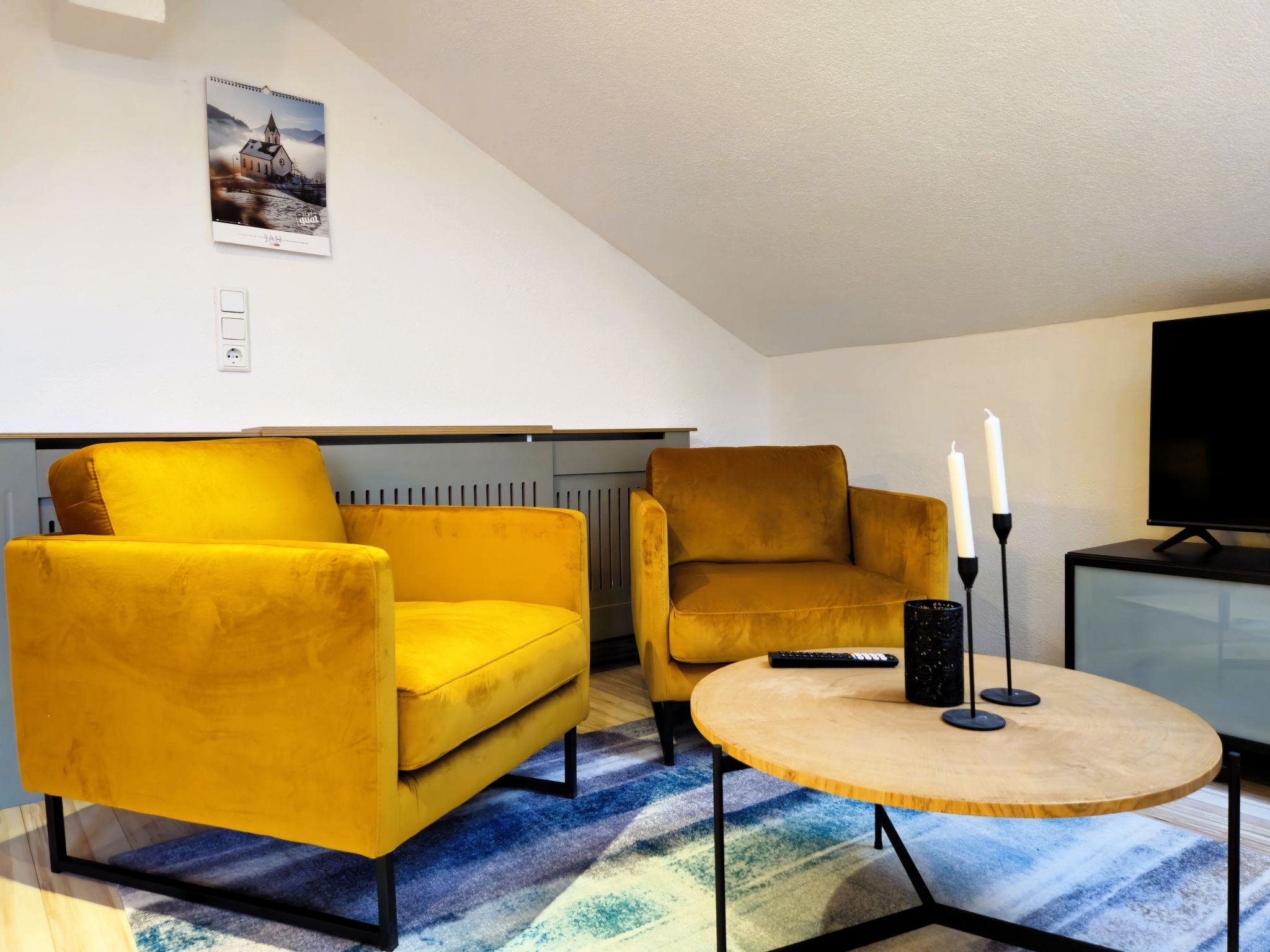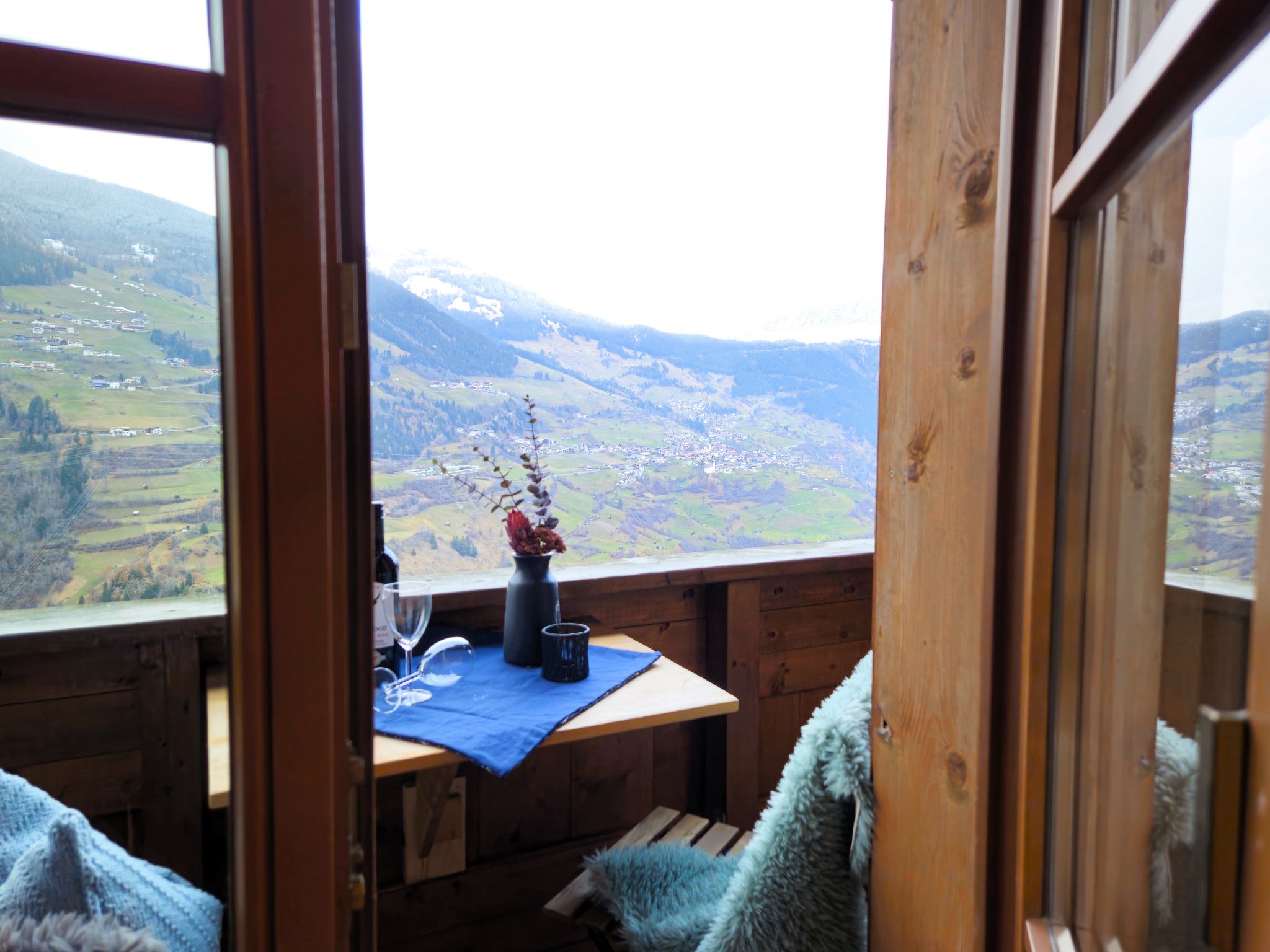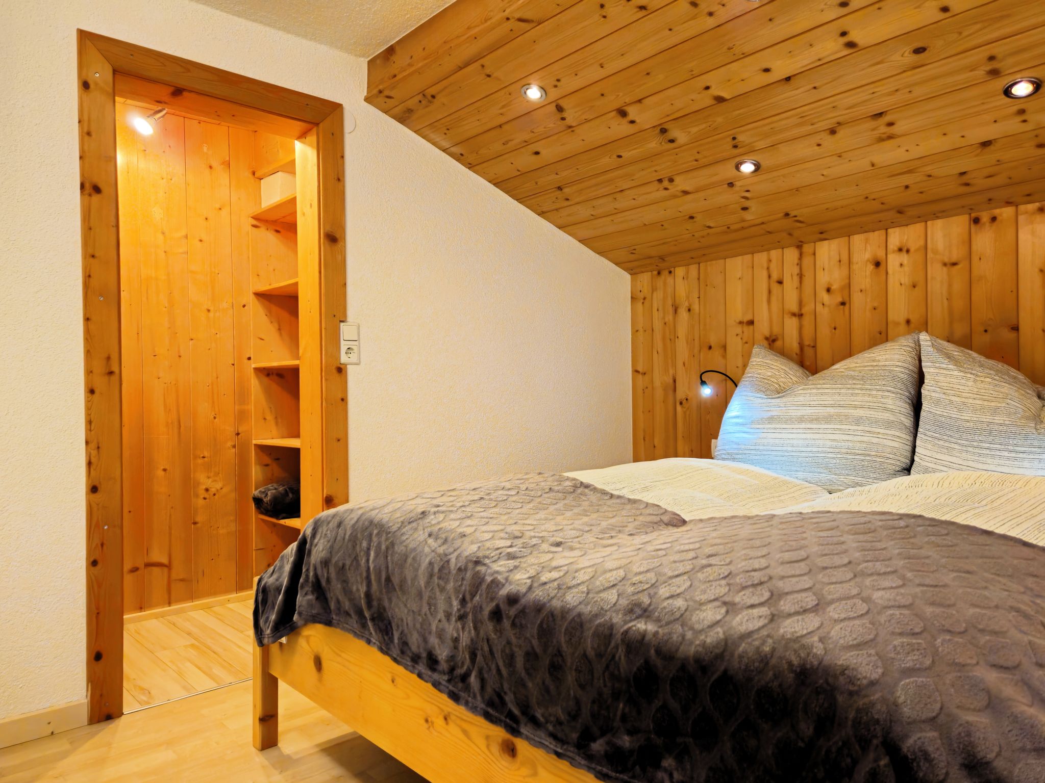 2-room apartment 55 m2 on 2nd floor. Beautiful and cosy furnishings: with sloping ceilings, 1 double bedroom with Dressing room. Large kitchen-/living room (dishwasher, 4 ceramic glass hob hotplates, toaster, kettle, electric coffee machine, combination microwave) with 1 double bed and Scandinavian wood stove (only for decoration), satellite TV (flat screen). Exit to the balcony. Shower/WC. Wooden floors. Small balcony. Balcony furniture. Very beautiful panoramic view of the mountains and the valley. Facilities: children's high chair, baby cot. Internet (WiFi, free). Parking. 1 small pet/ dog allowed.