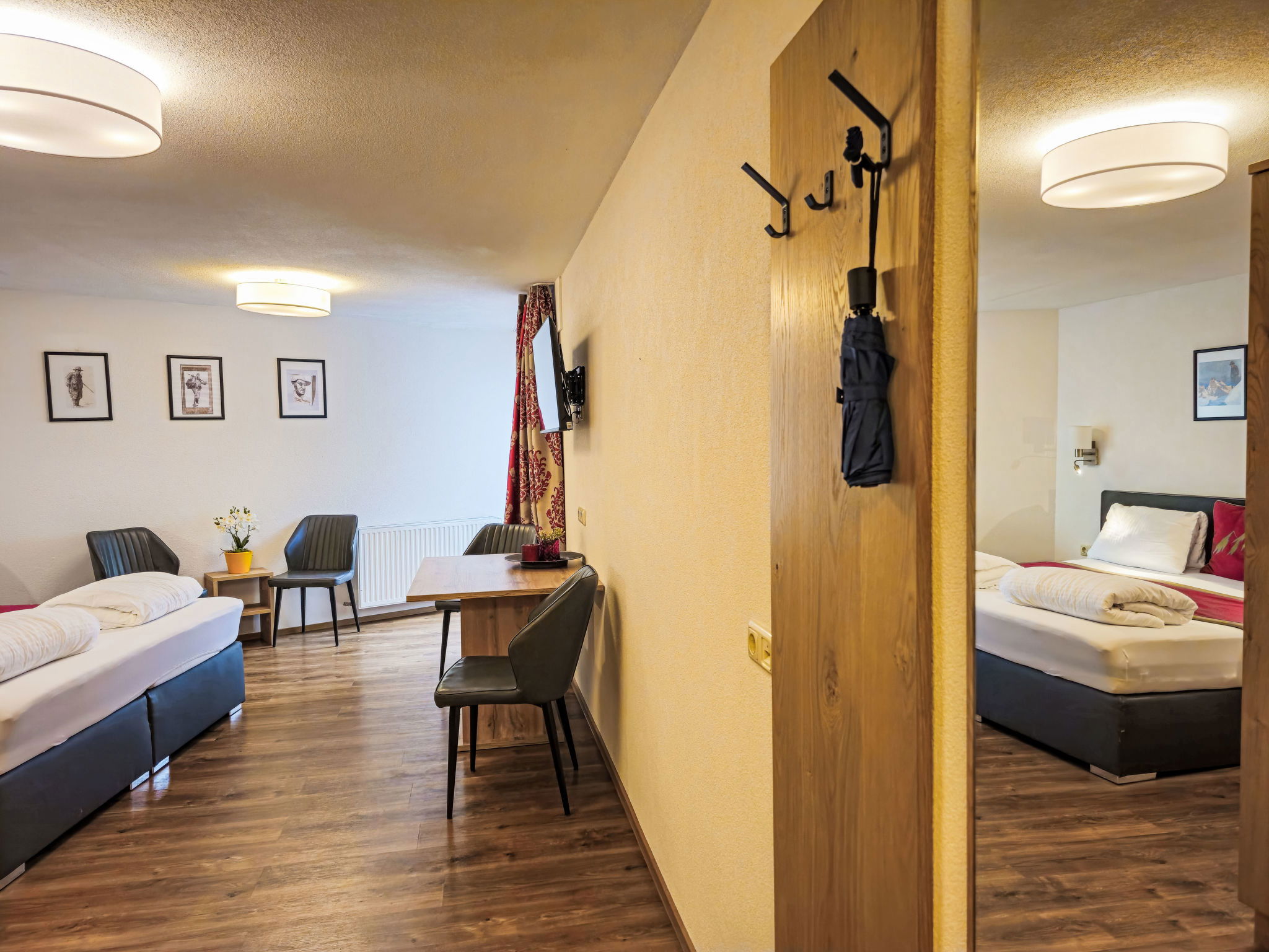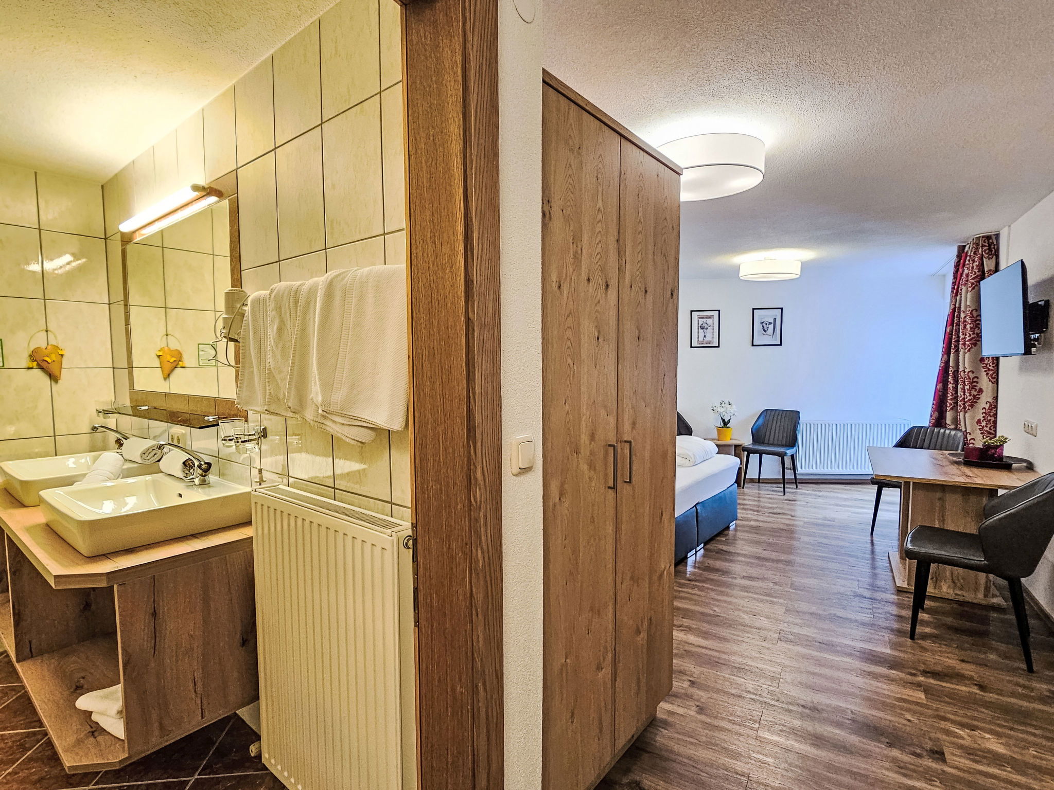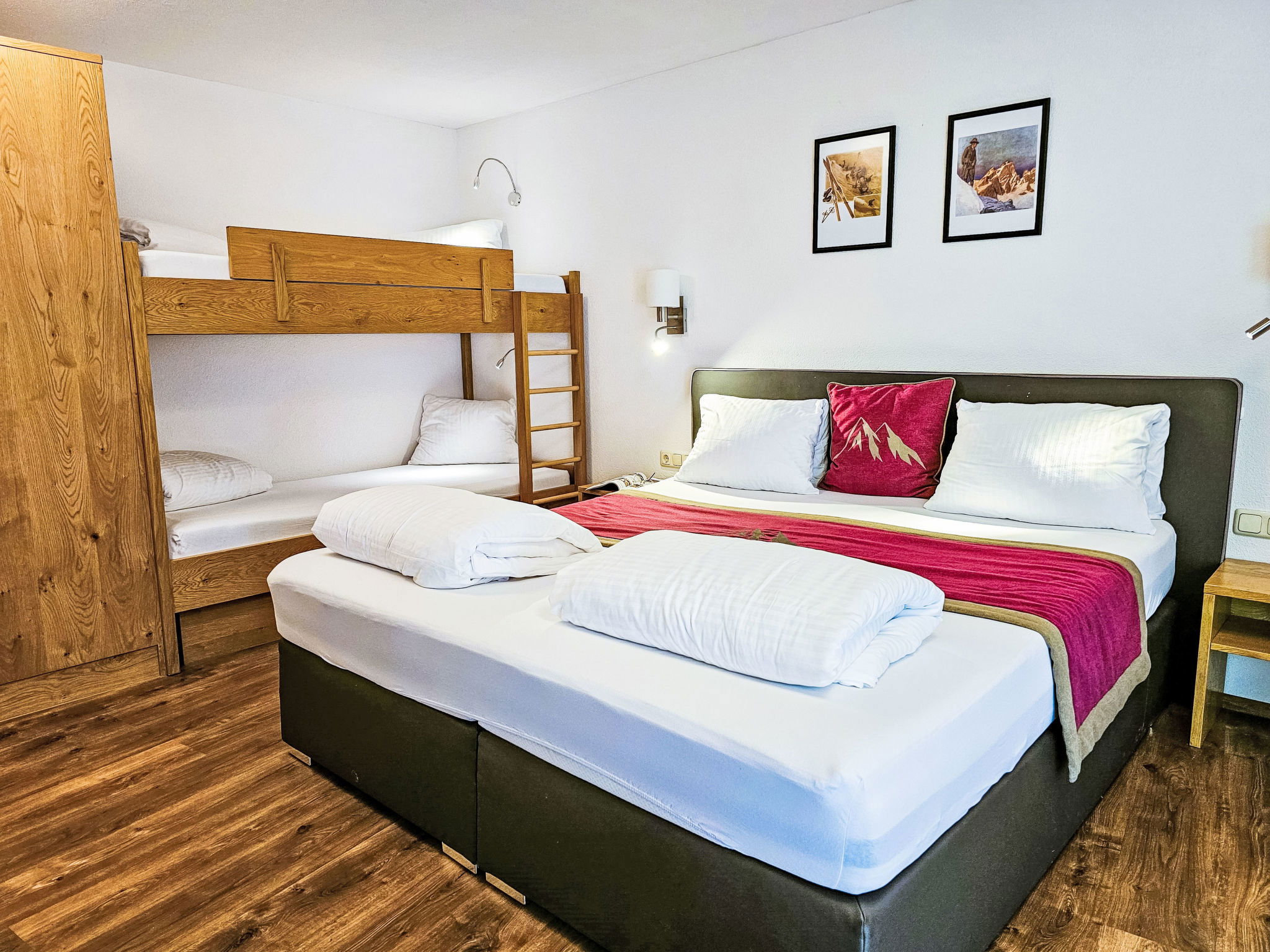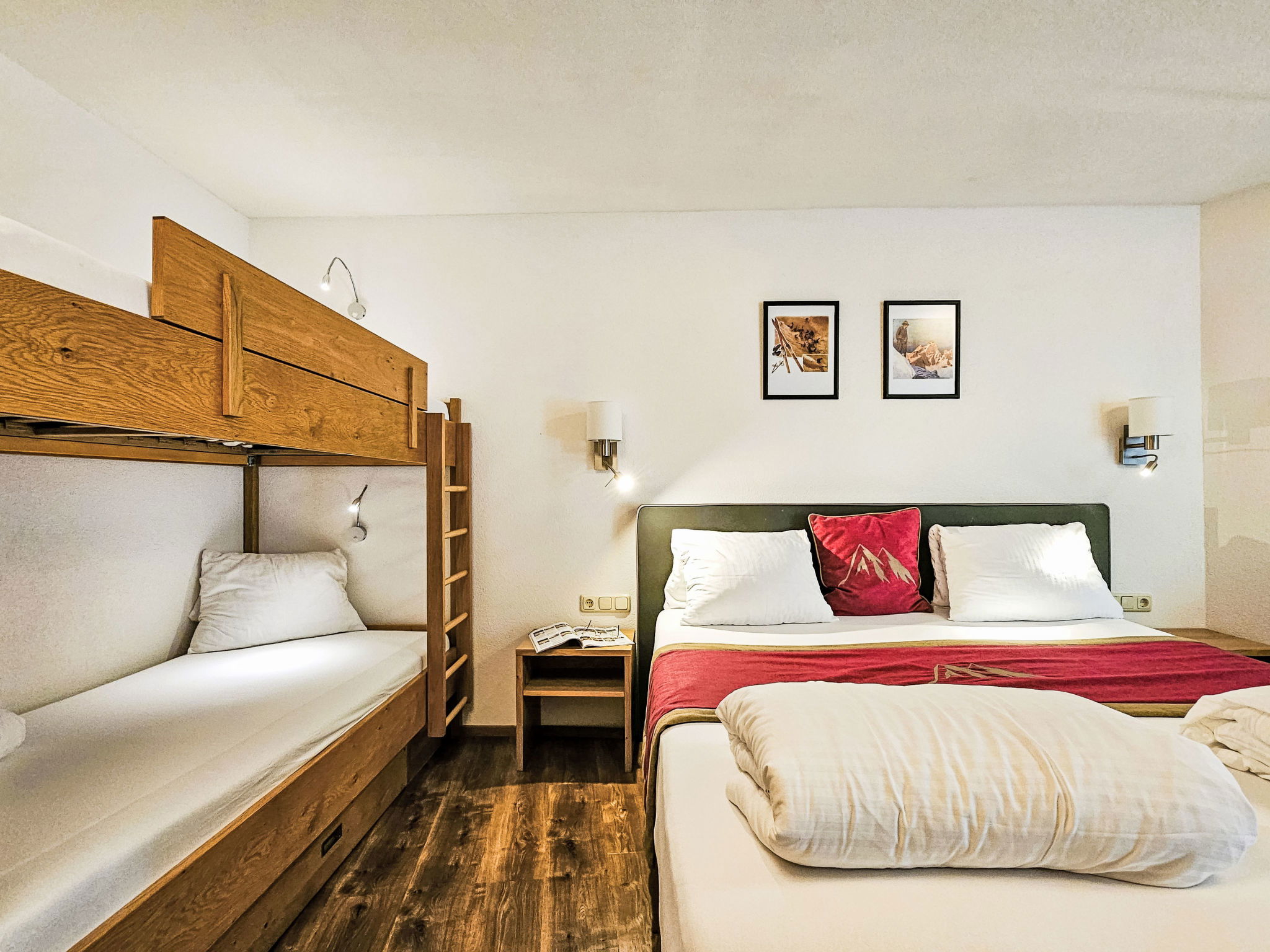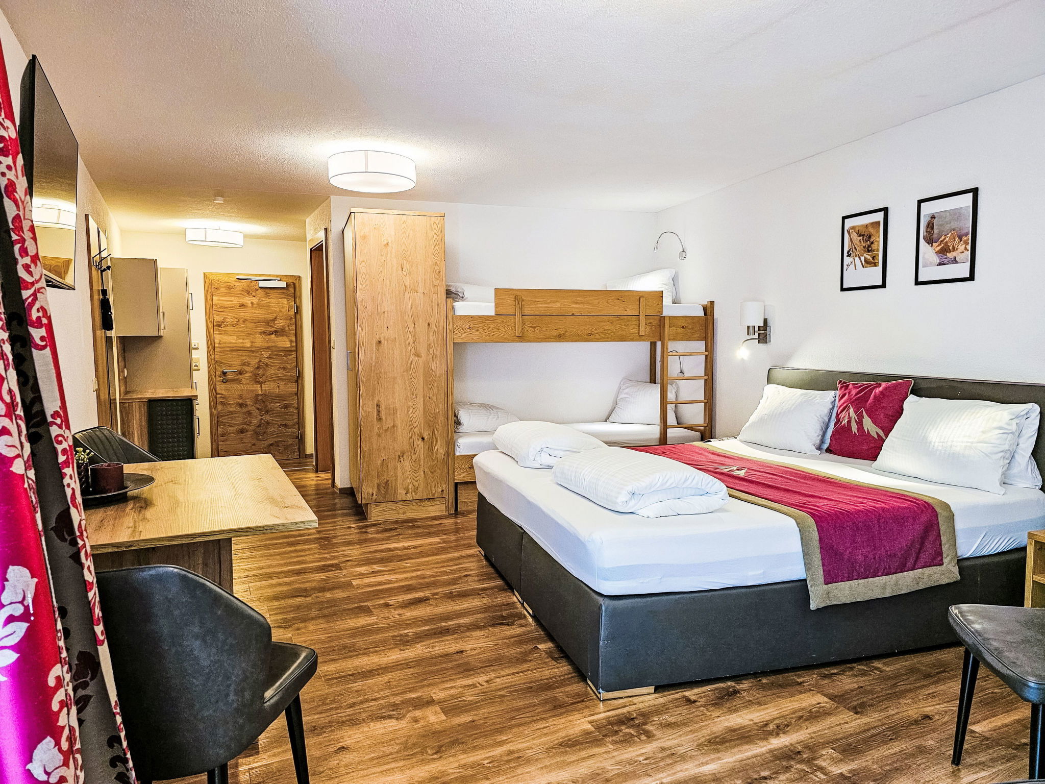 "Trisanna", 1-room studio 35 m2 on 1st floor. Object suitable for 2 adults + 2 children. Spacious, stylish and cosy furnishings: living/sleeping room with 1 x 2 bunk beds (90 cm, length 200 cm), 1 double bed, dining table and satellite TV (flat screen). Exit to the balcony. Small kitchenette in the entrance (4 induction hot plates, toaster, kettle, microwave, electric coffee machine). Shower/WC. Wooden floors. Small balcony 5 m2. Balcony furniture. Beautiful, of the valley and the resort. Facilities: hair dryer. Internet (WiFi, free). Parking. Suitable for families. Maximum 1 pet/ dog allowed.