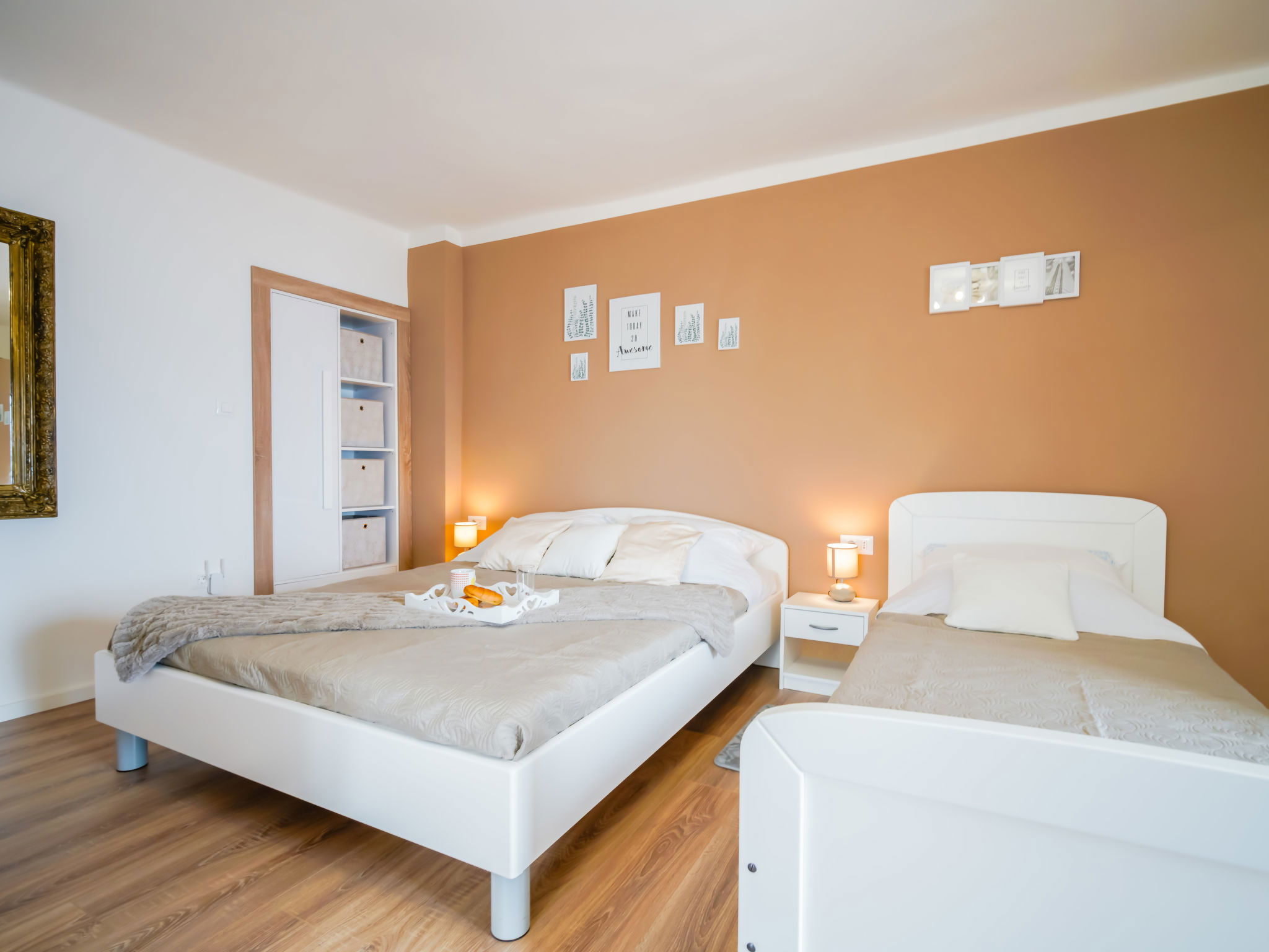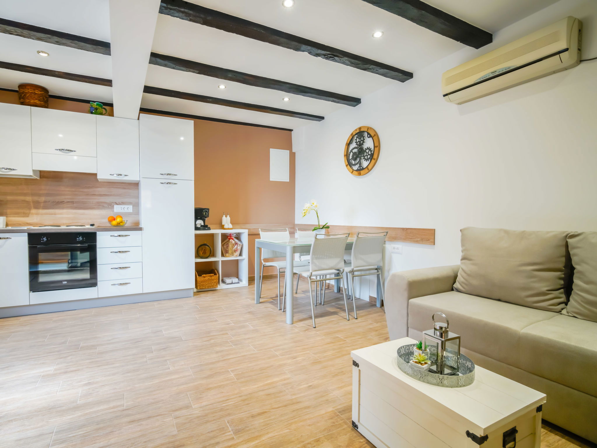 2-room apartment 48 m2 on 2 levels. Living/dining room 24 m2 with 1 sofabed (100 cm, length 200 cm), satellite TV (flat screen), air conditioning. Open kitchen (4 hot plates, oven, freezer, electric coffee machine). Upper floor: 1 open room with 1 bed (90 cm, length 200 cm), 1 french bed (160 cm, length 200 cm), shower/WC and air conditioning. Exit to the balcony. Heating, air-conditioning (extra). Balcony 6 m2, terrace 25 m2 partly roofed. Terrace furniture, barbecue. Marvellous panoramic view of the sea and the countryside. Facilities: washing machine. Internet (WiFi, free). Please note: non-smokers only. Maximum 1 pet/ dog allowed. Private entrance.