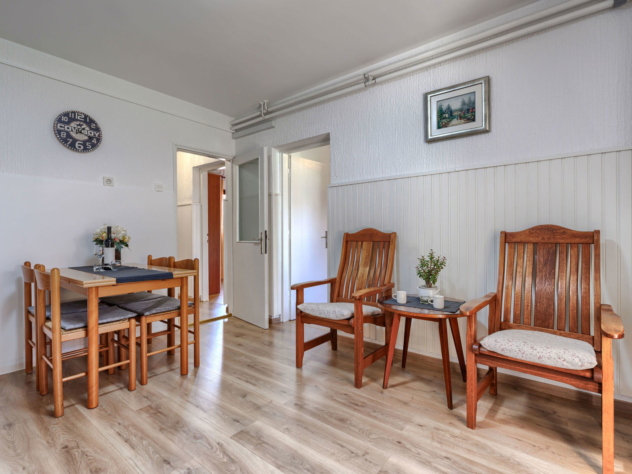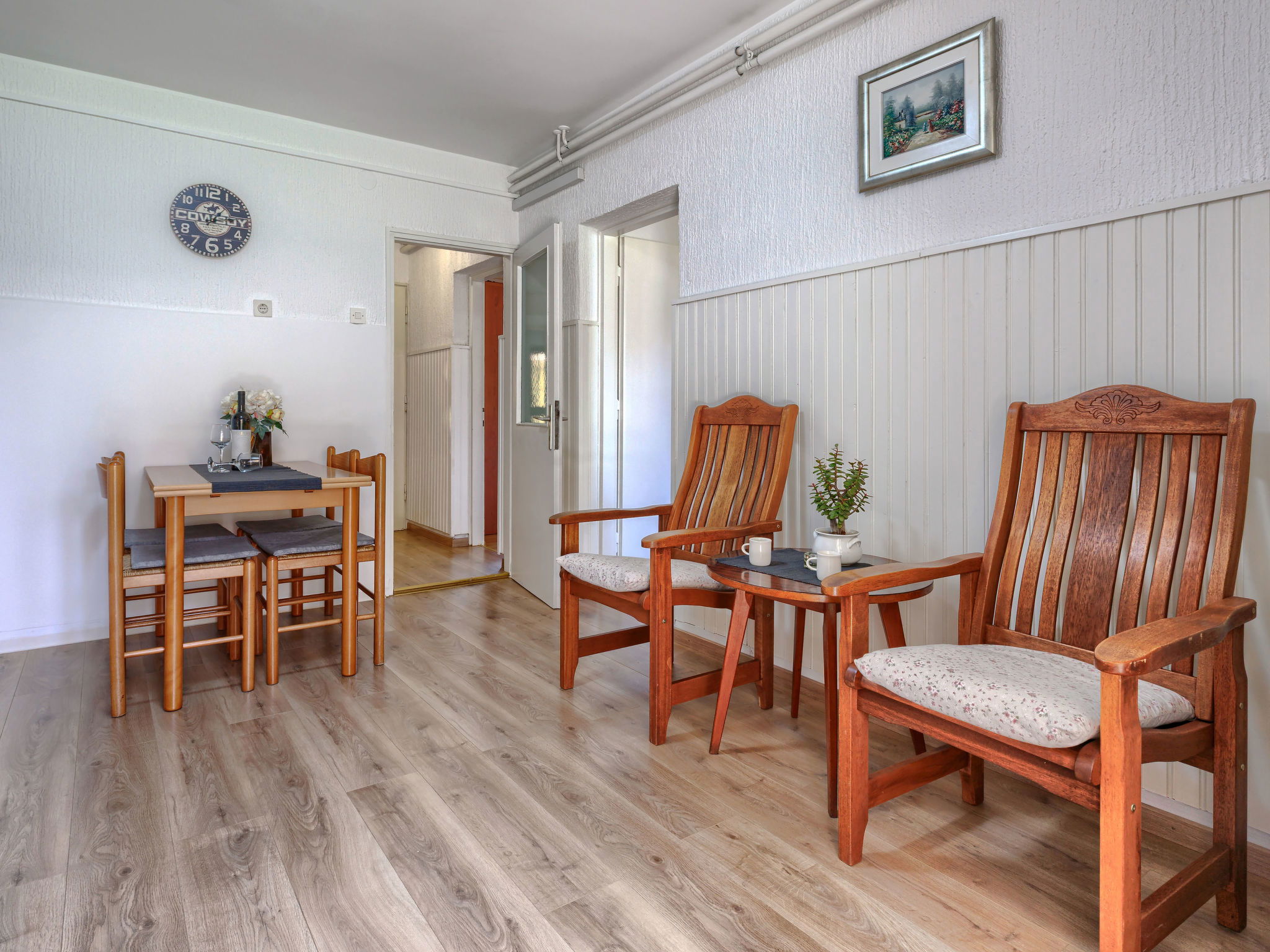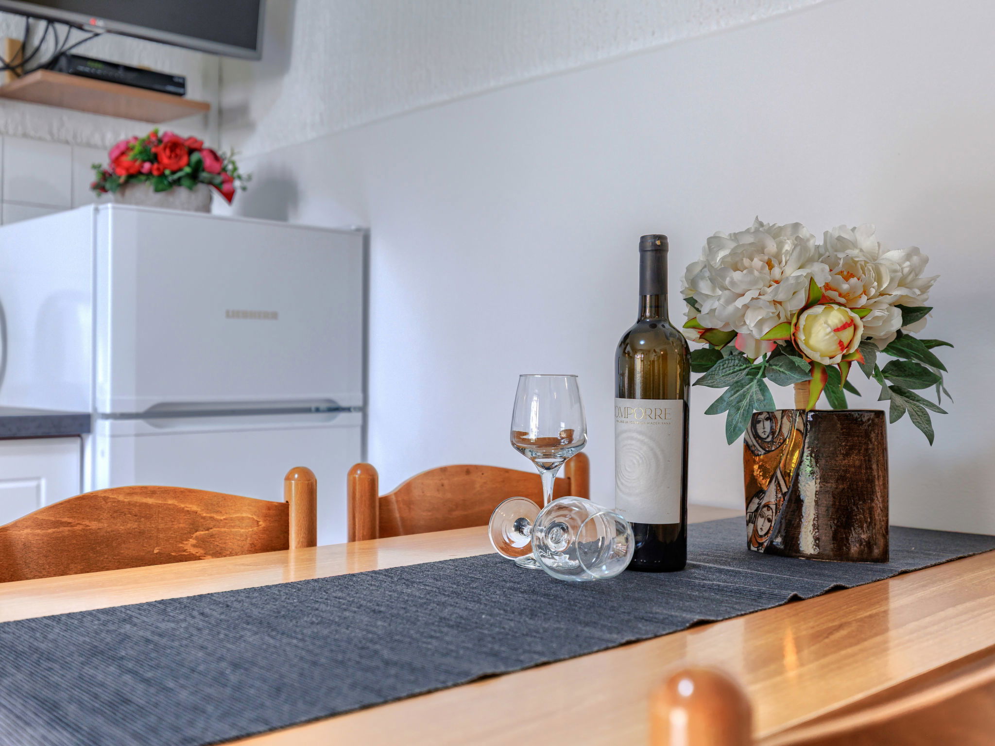 2-room apartment 43 m2, on the ground floor. Practical furnishings: 1 room with 1 double bed (2 x 90 cm, length 190 cm). 1 room with 1 double bed (2 x 80 cm, length 200 cm). Dining room with satellite TV (flat screen), air conditioning. Exit to the garden, to the terrace. Open kitchen (dishwasher, 4 ceramic glass hob hotplates, microwave, freezer). Shower/WC. Heating. Terrace 6 m2, roofed. Terrace furniture. Facilities: Internet (WiFi, free). 1 small pet/ dog allowed.