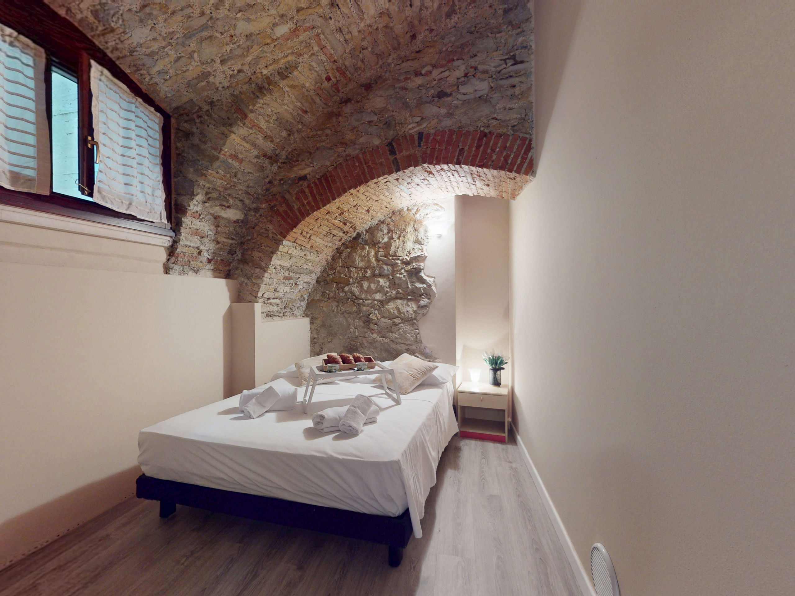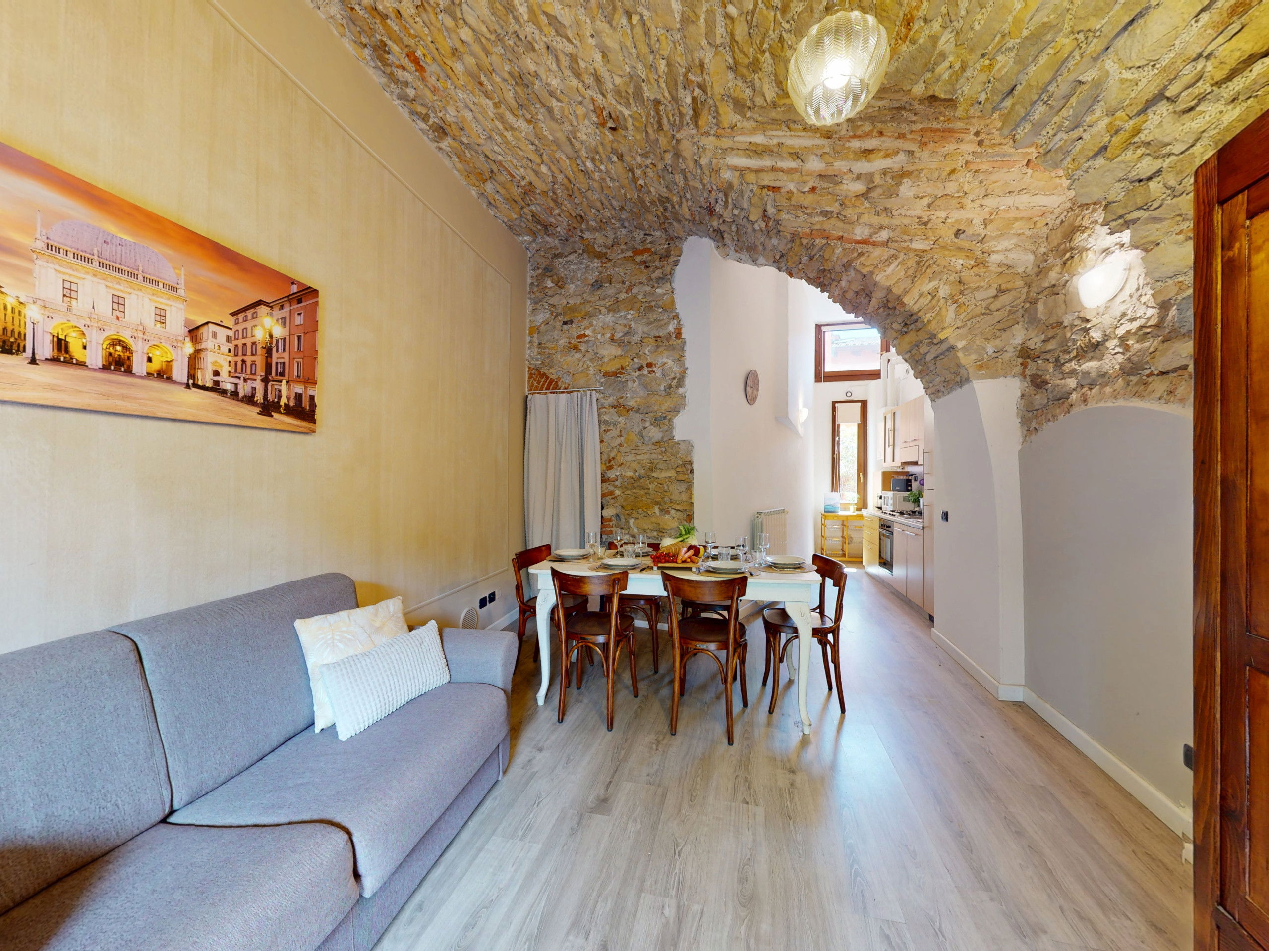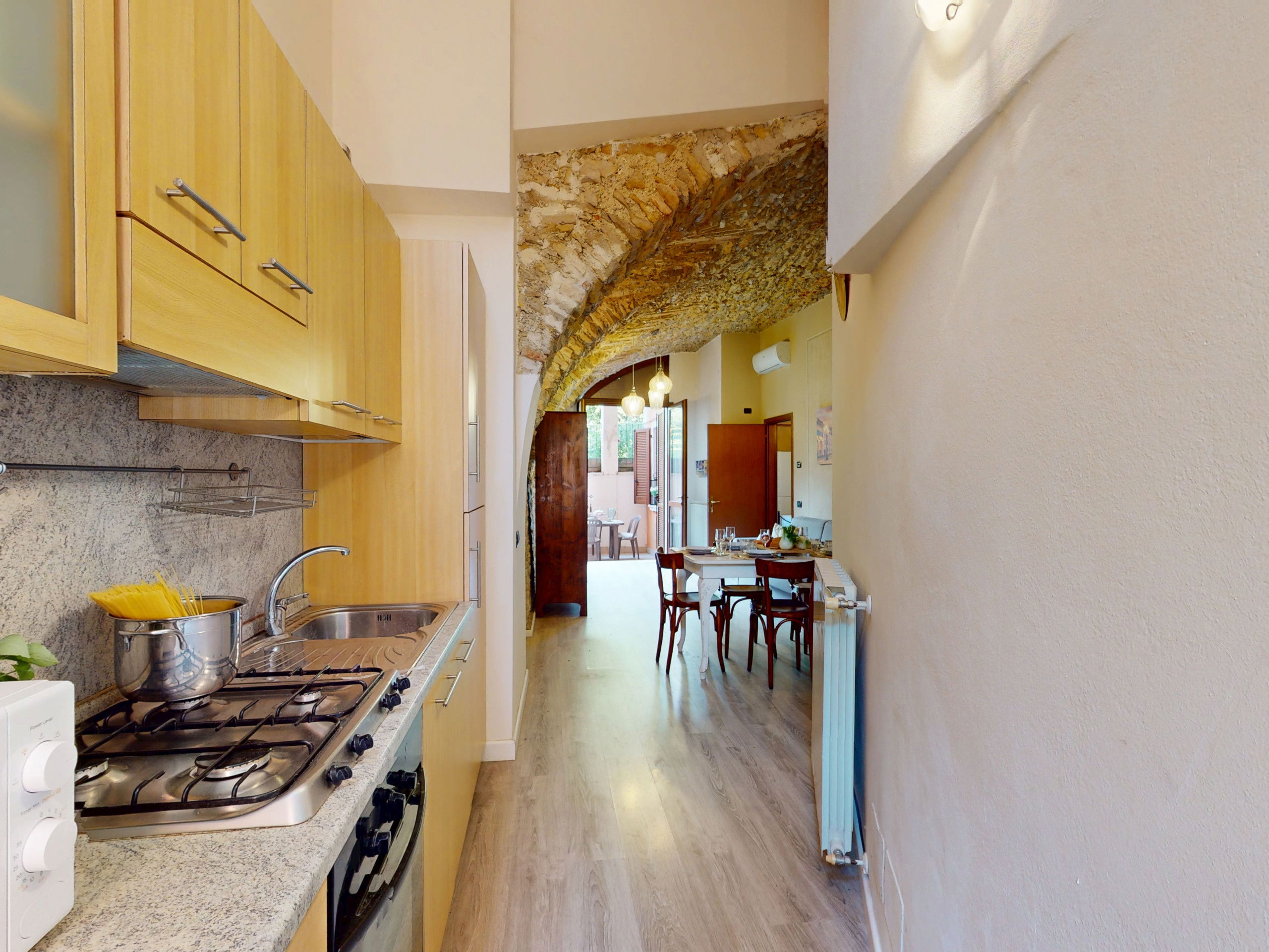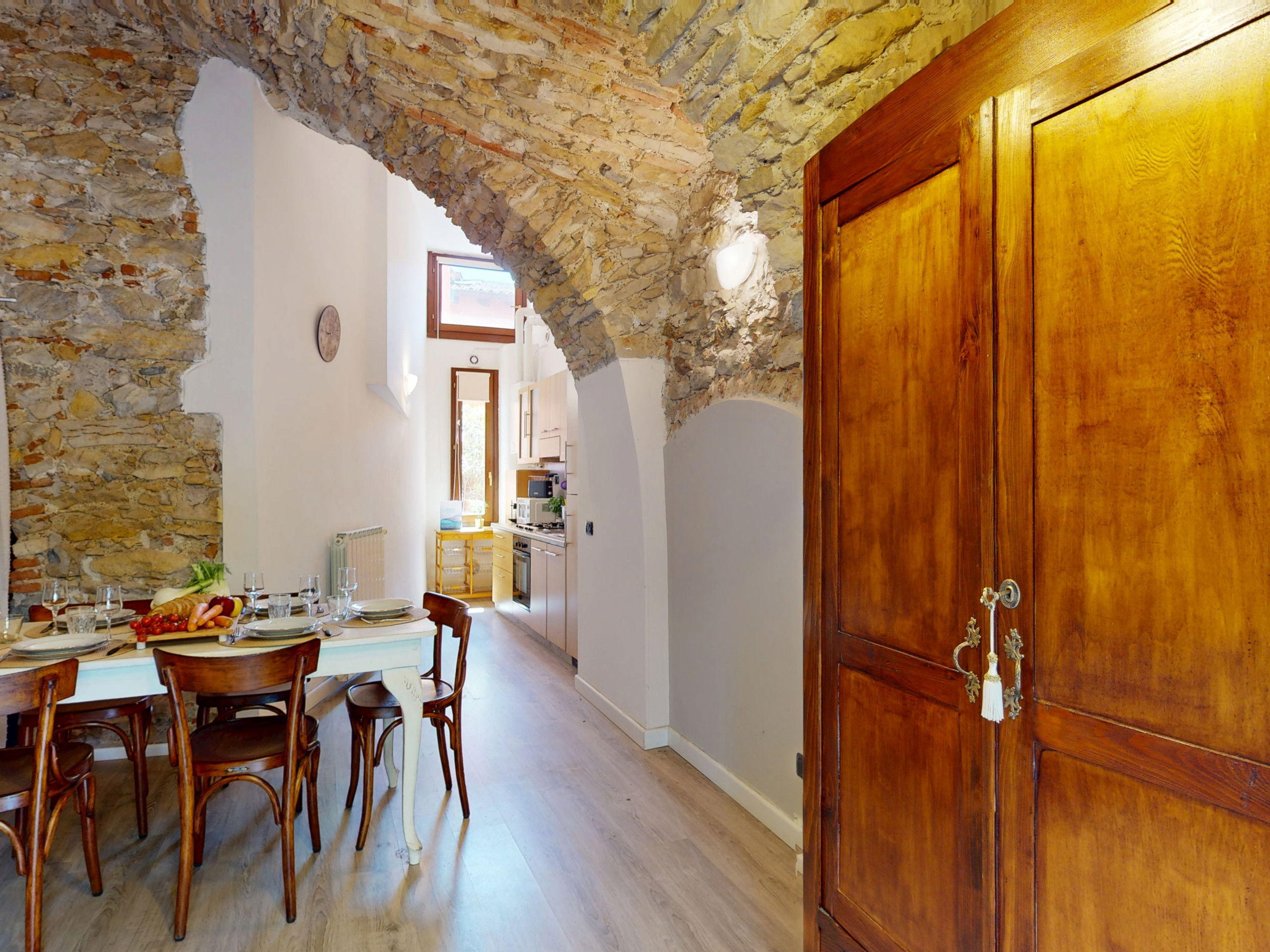 The ground floor apartment stands out for its unique atmosphere: all rooms are characterised by evocative stone vaults and ceilings, which tell the story of the place and offer a warm and timeless welcome.