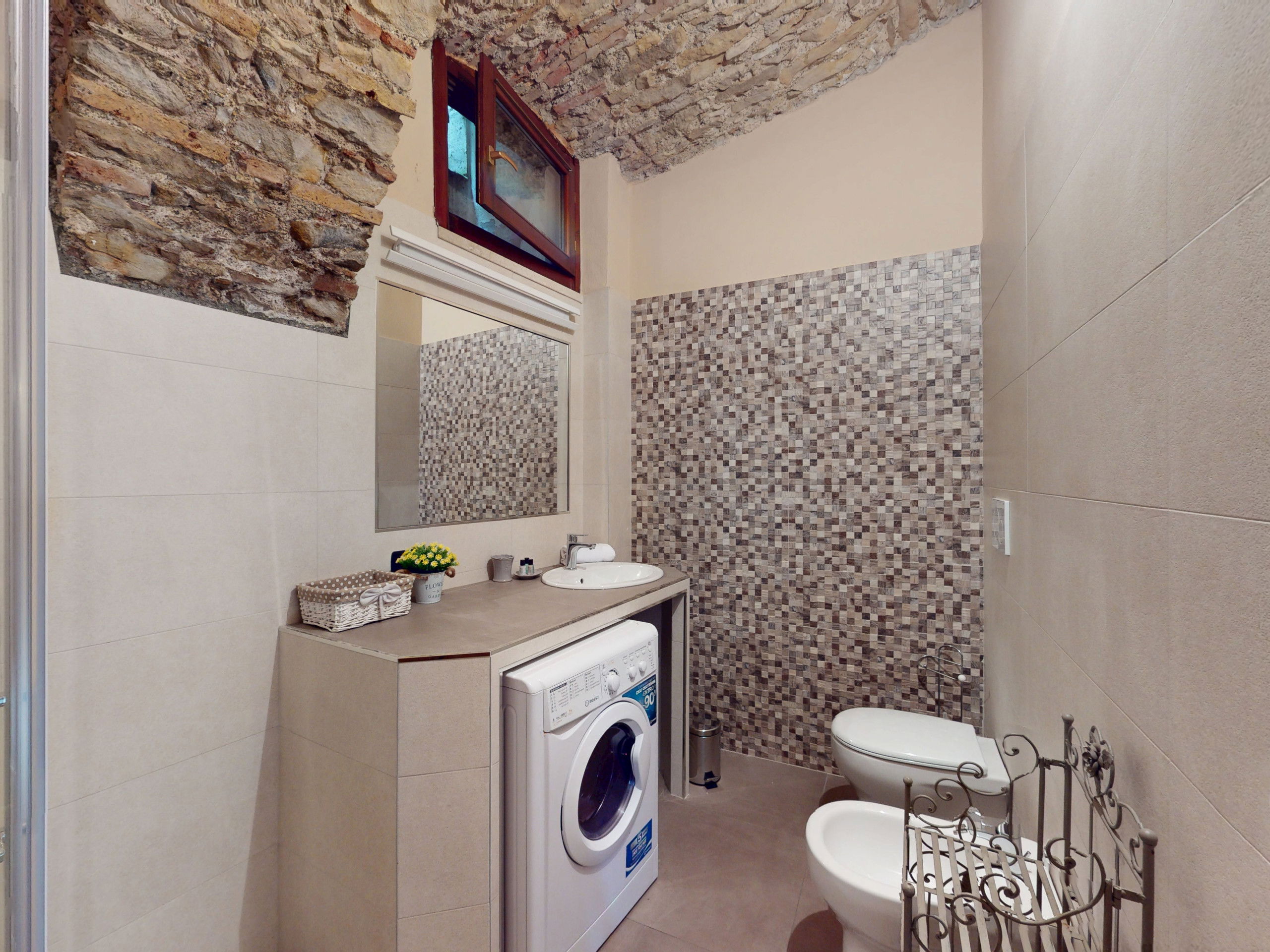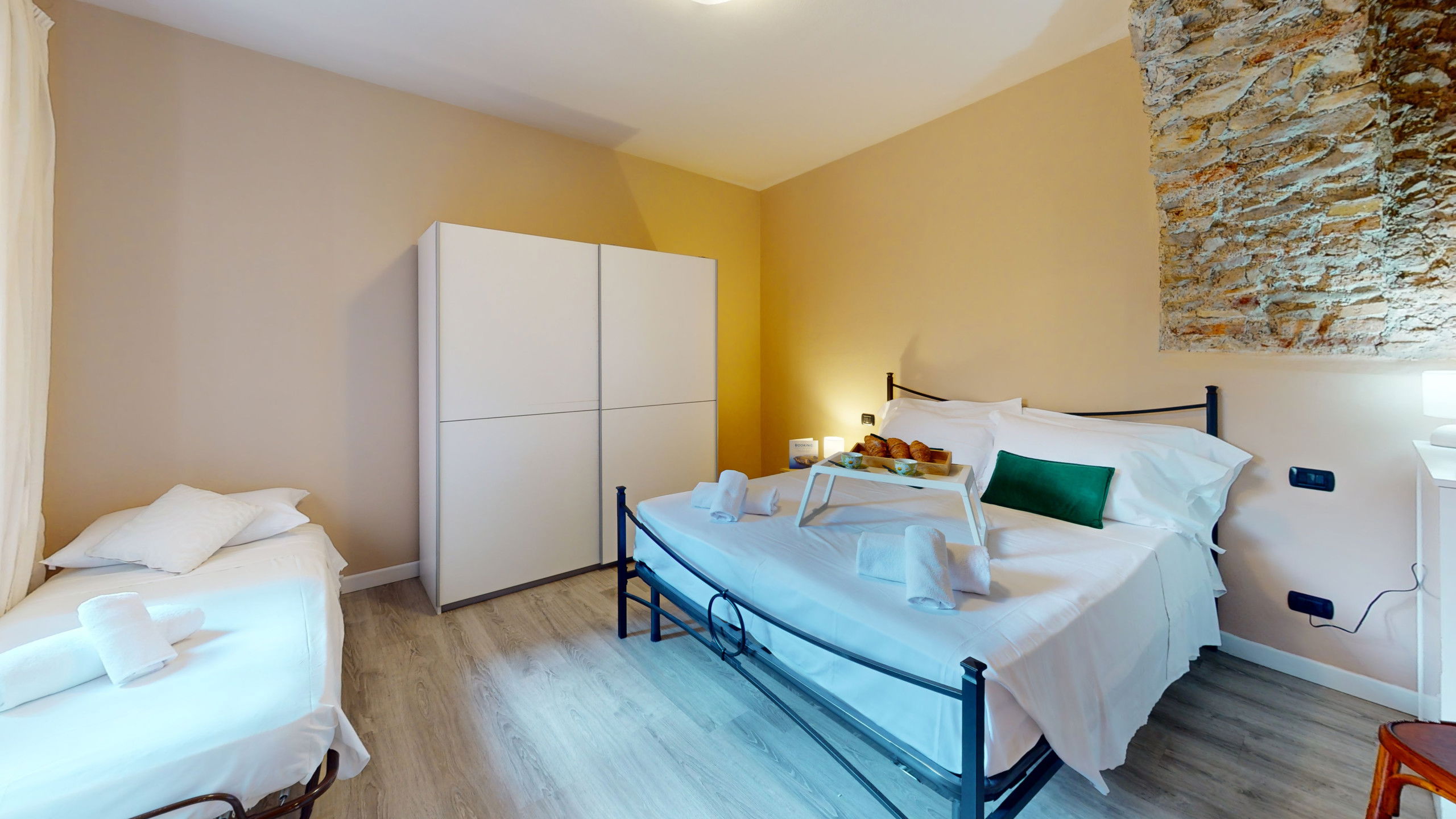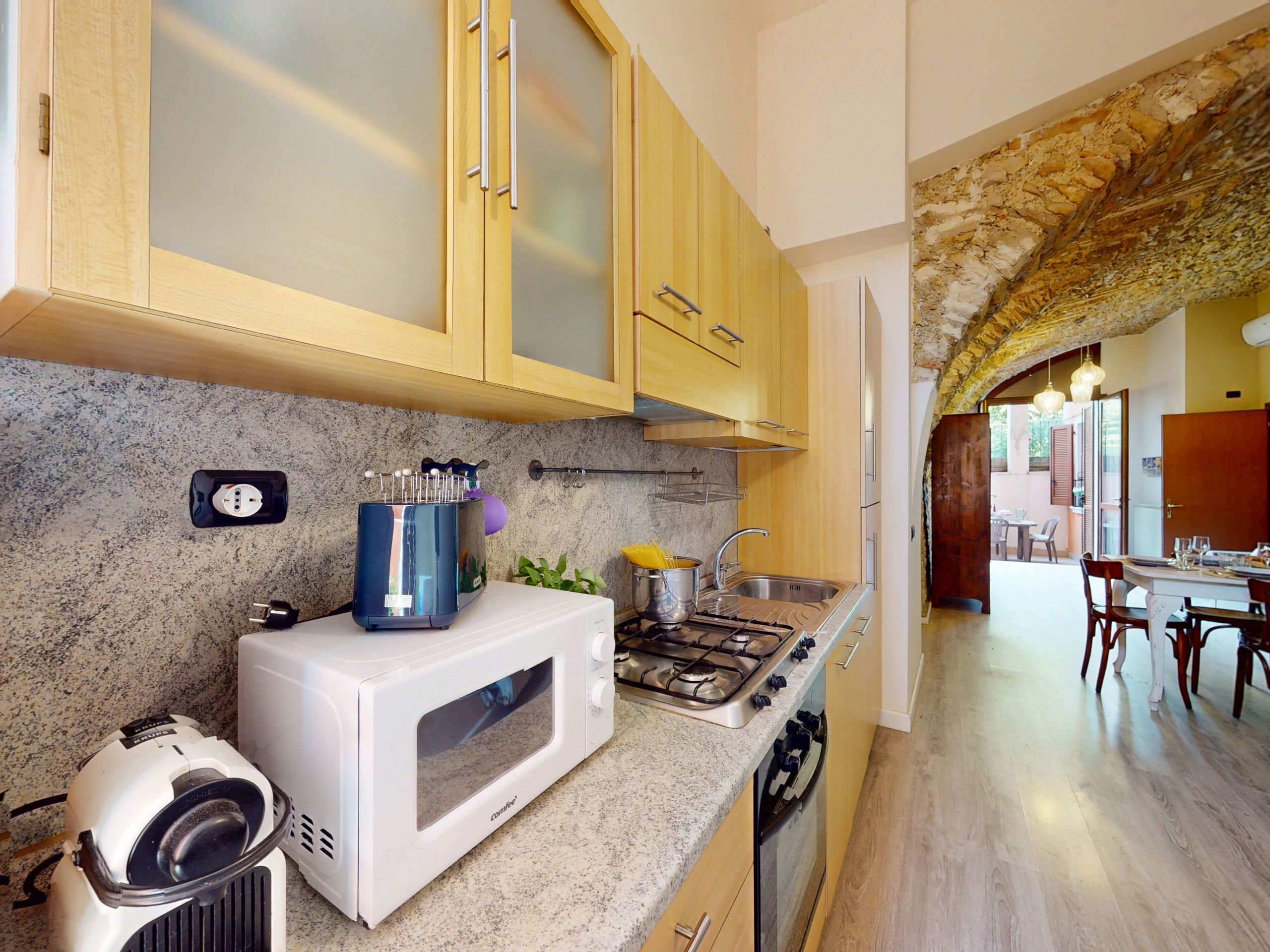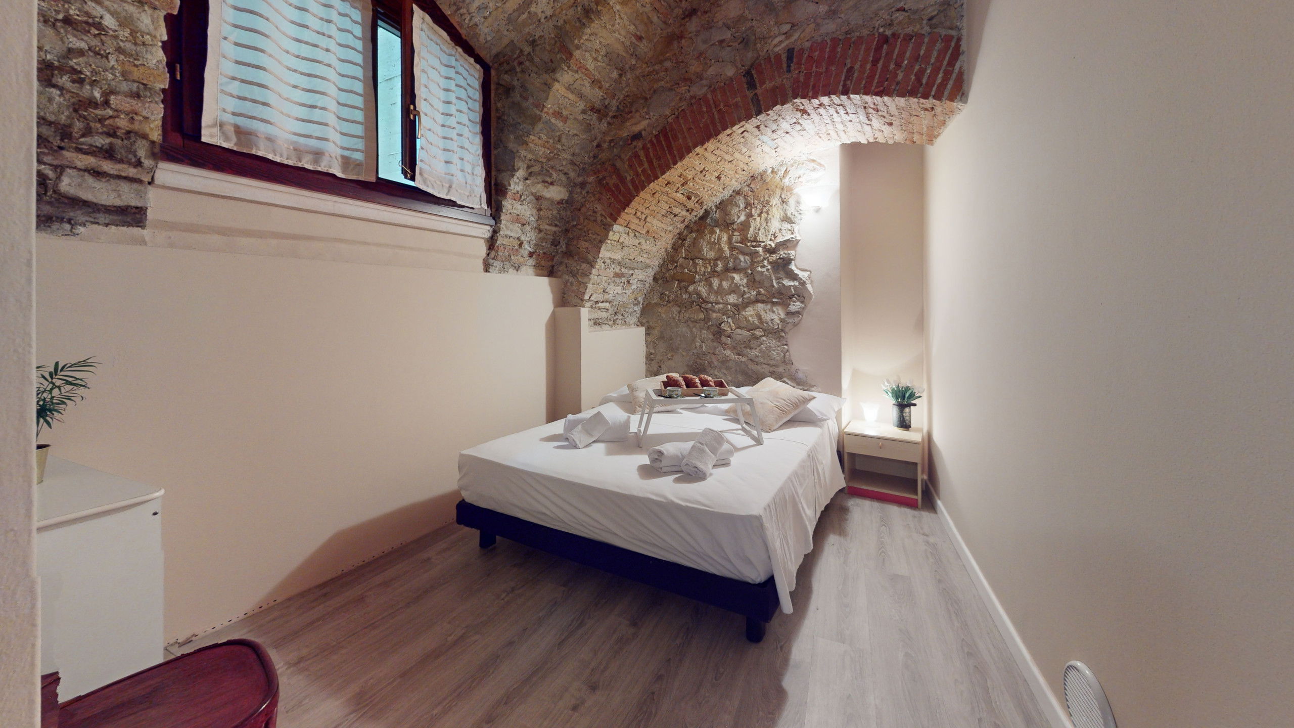 The ground floor apartment stands out for its unique atmosphere: all rooms are characterised by evocative stone vaults and ceilings, which tell the story of the place and offer a warm and timeless welcome.