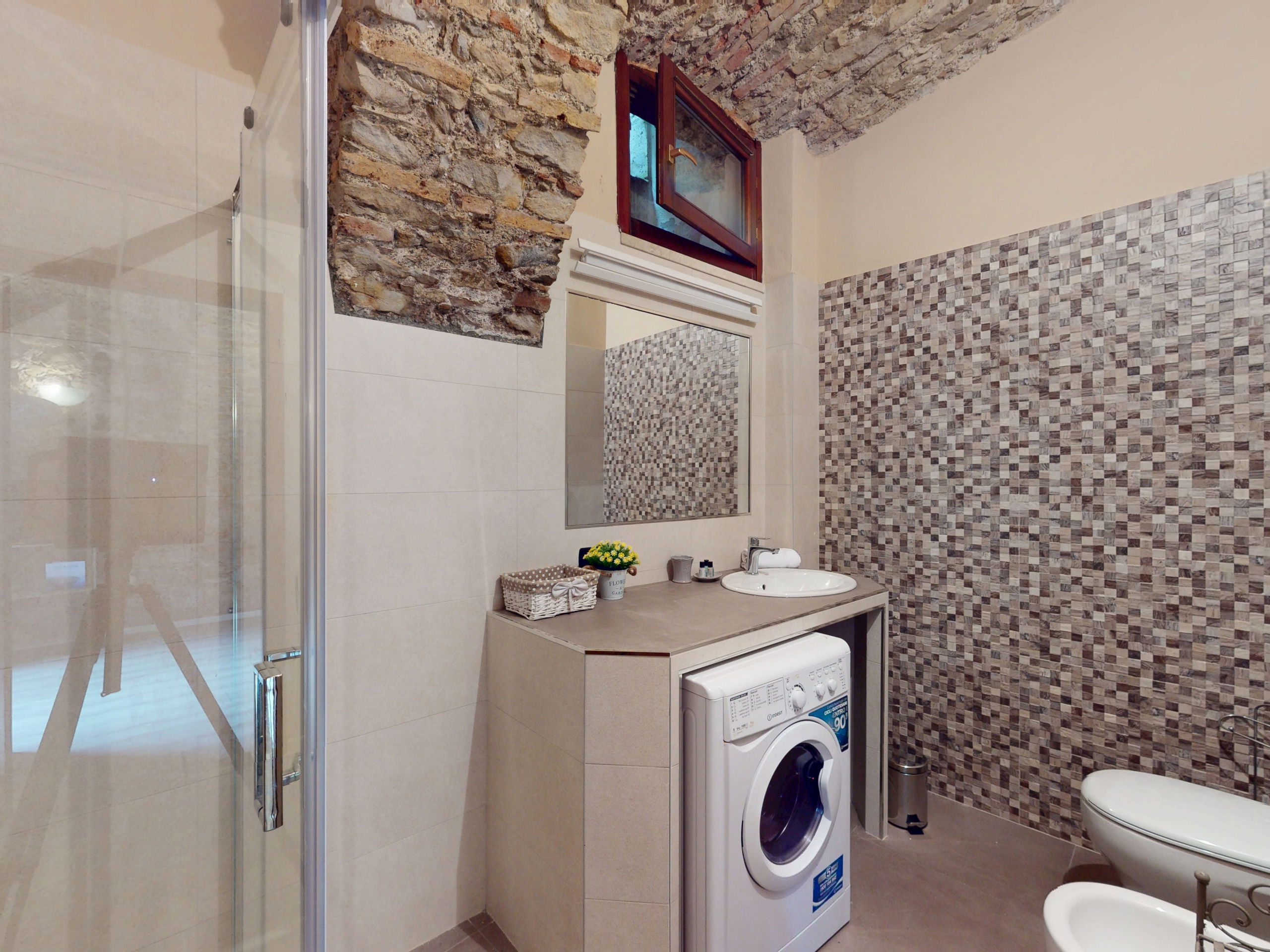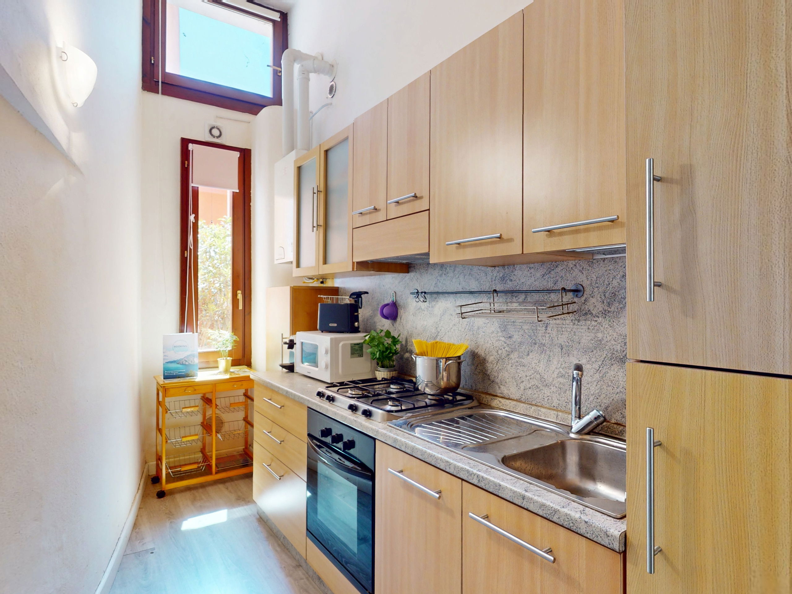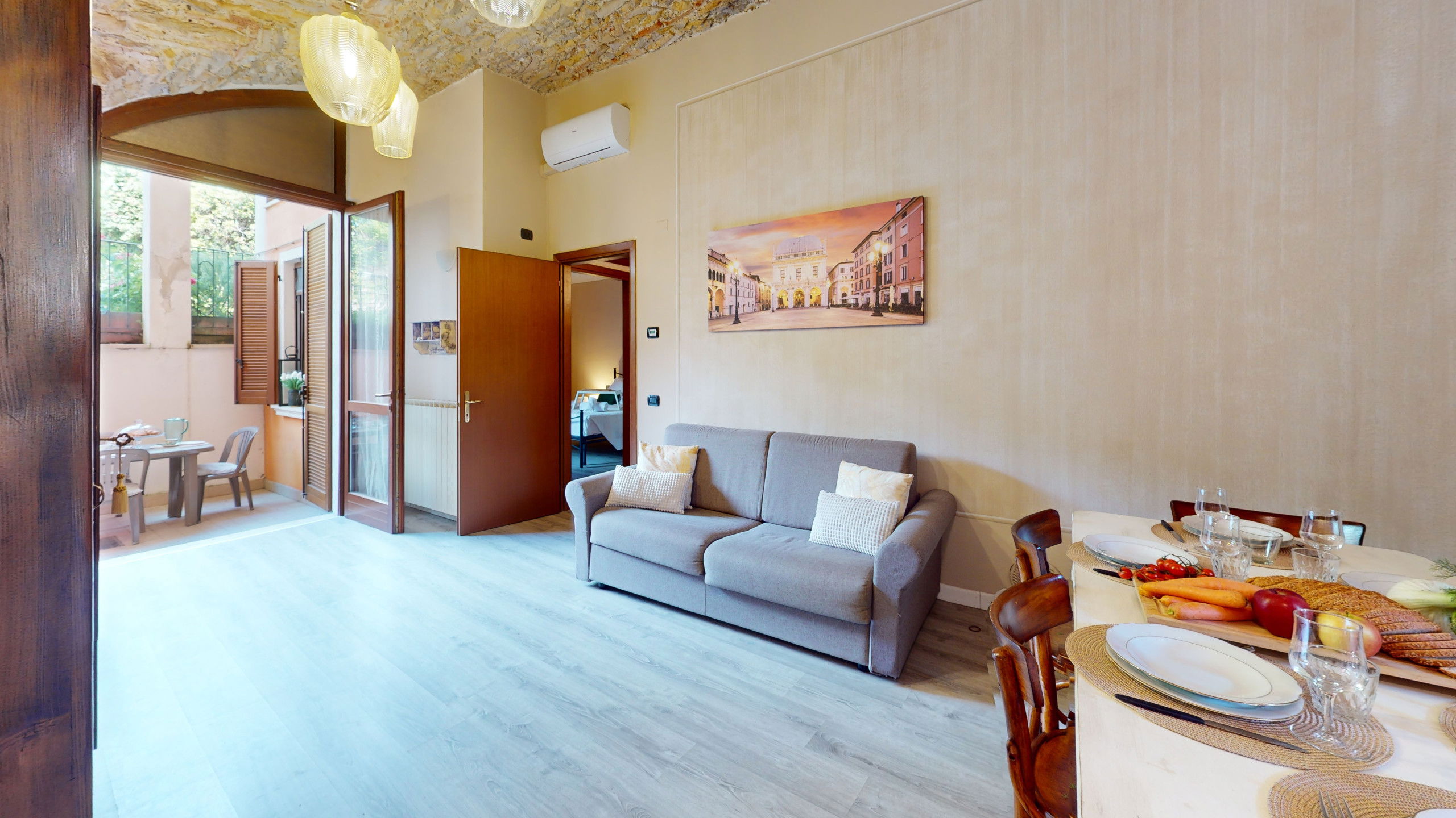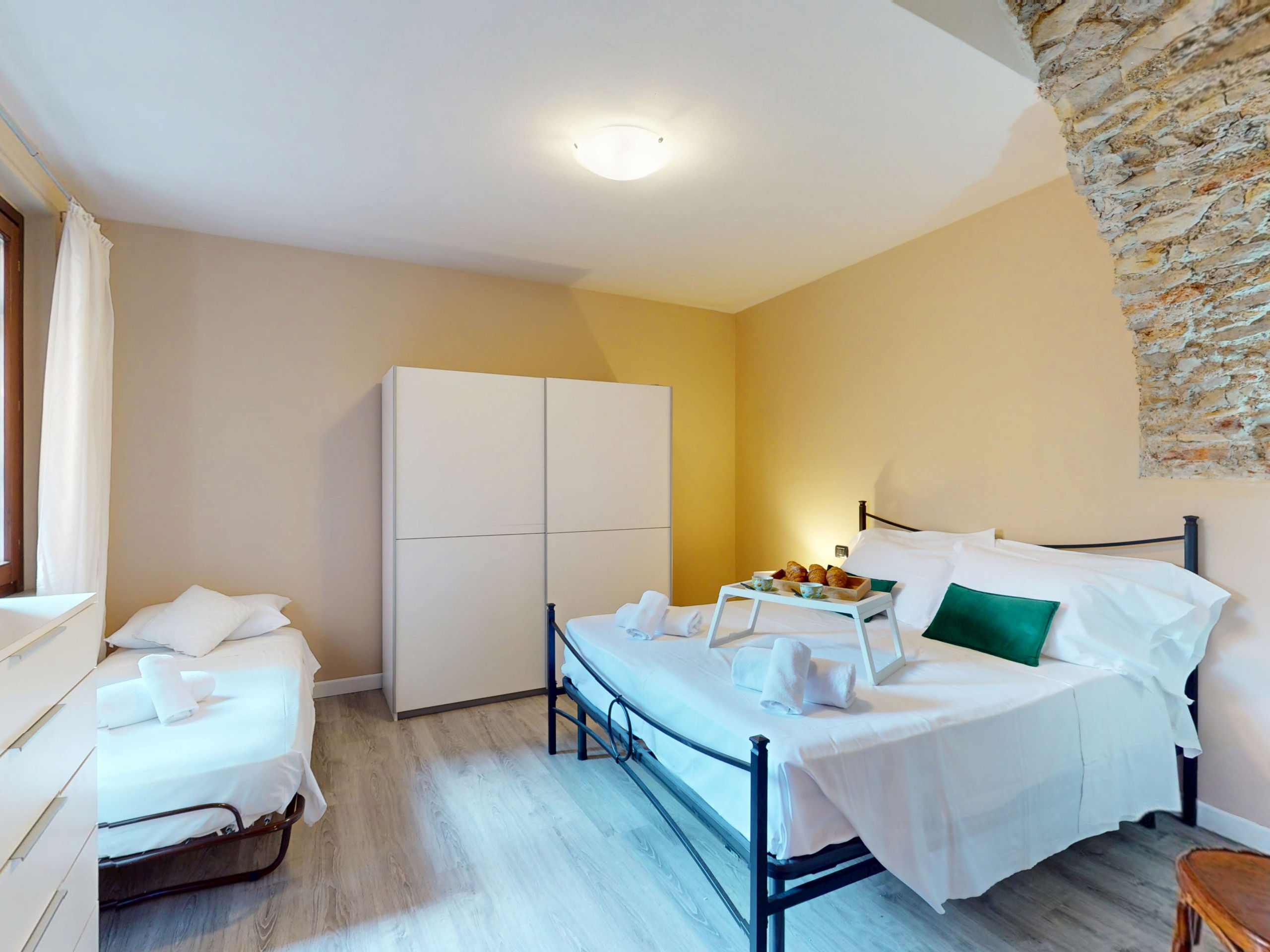 The ground floor apartment stands out for its unique atmosphere: all rooms are characterised by evocative stone vaults and ceilings, which tell the story of the place and offer a warm and timeless welcome.
