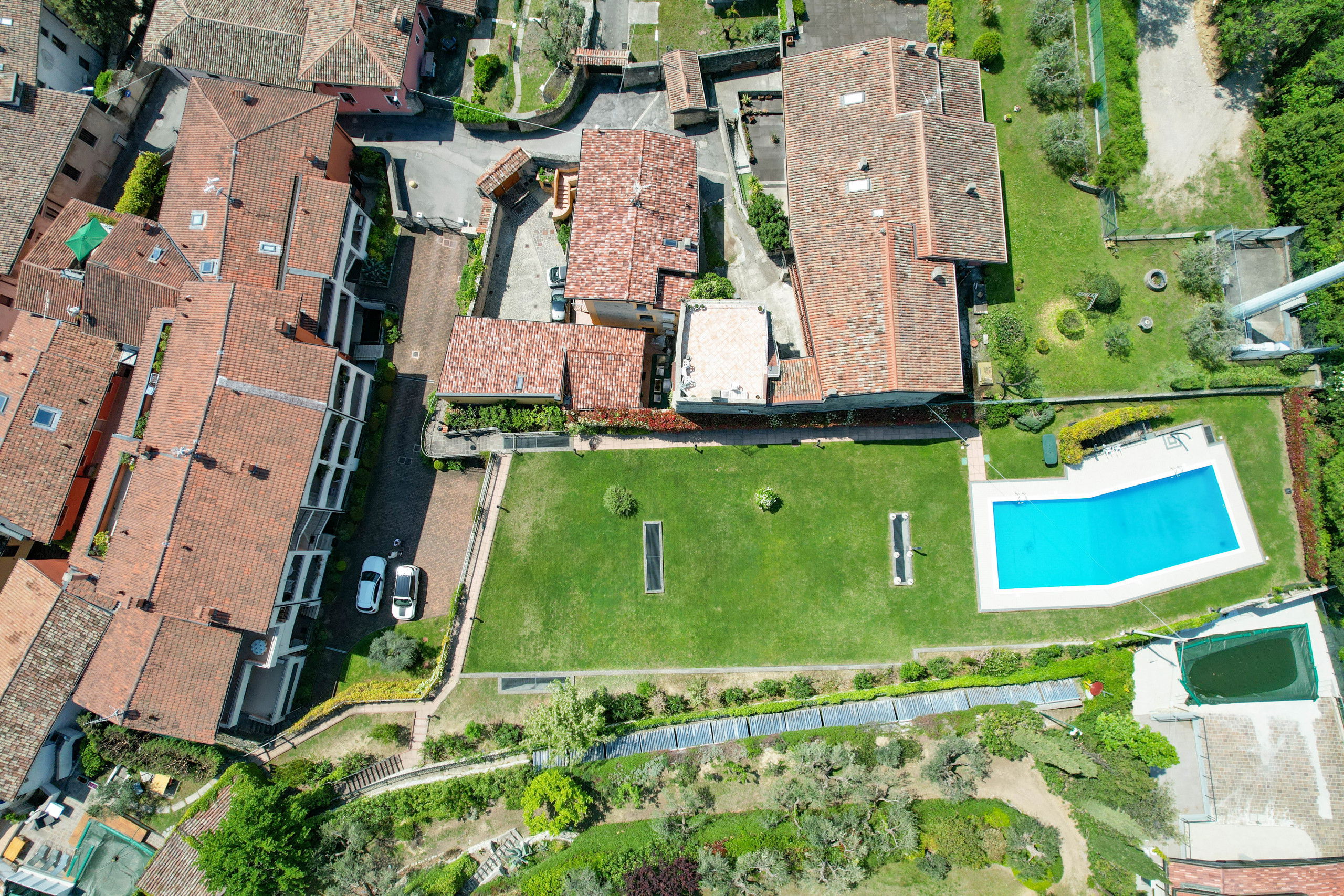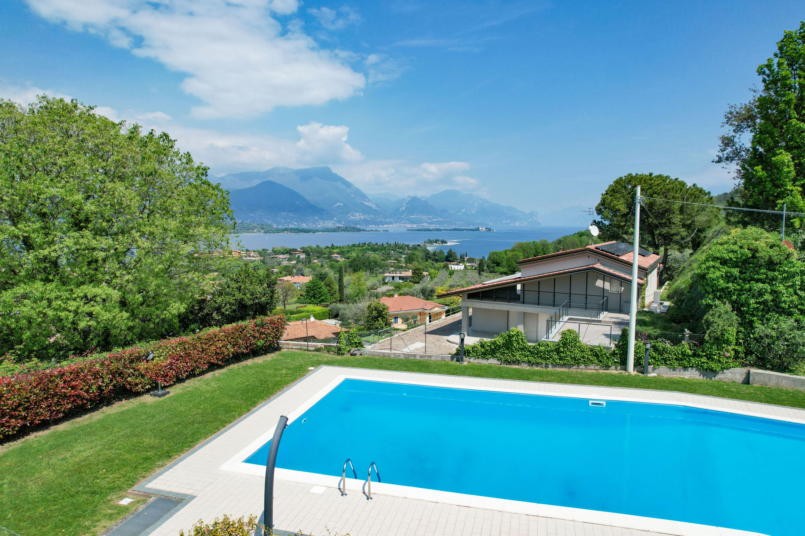 The property is completed by a convenient covered parking space and access to a splendid swimming pool surrounded by a large green garden, with a breathtaking view of the Lake.
