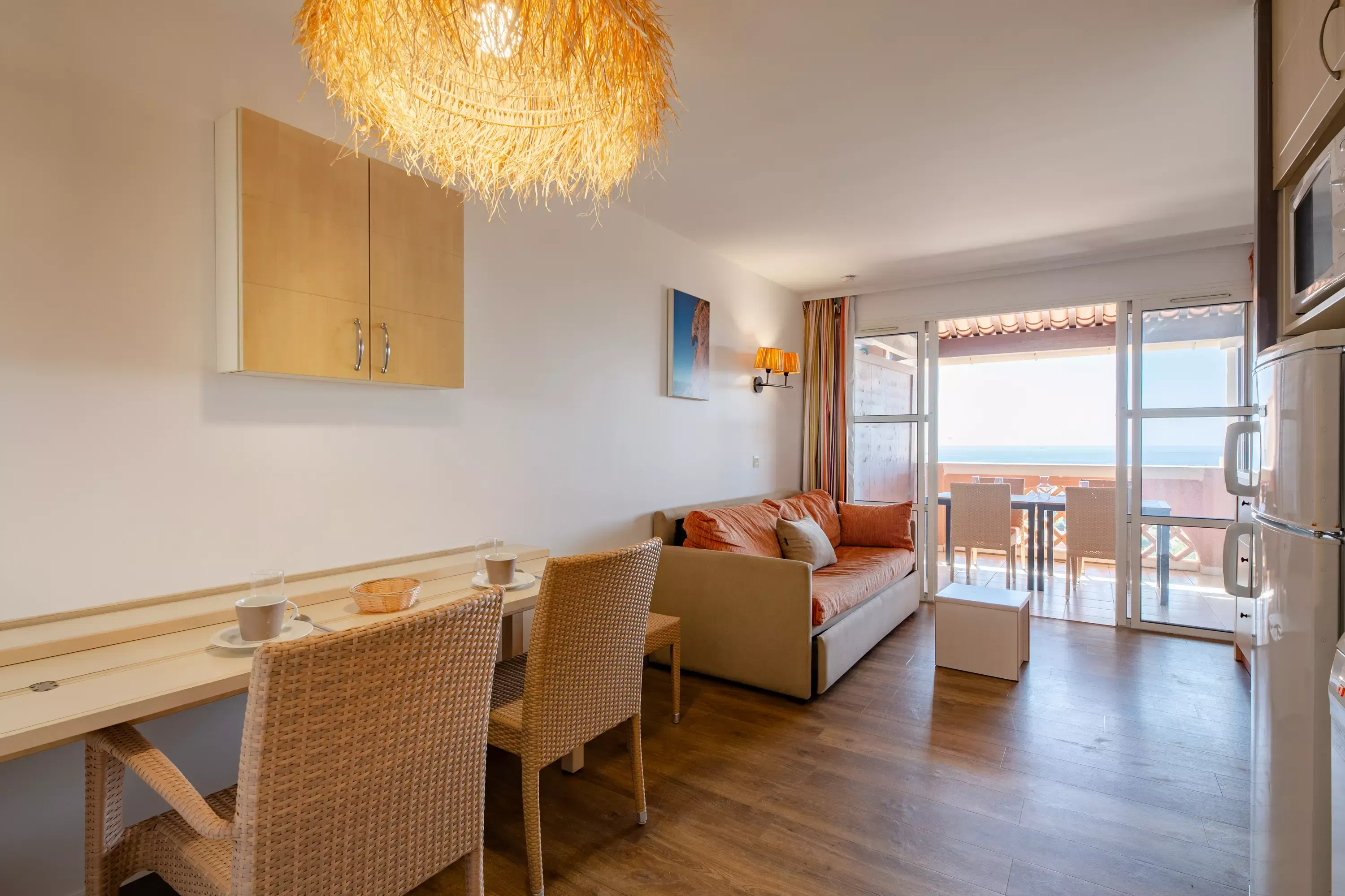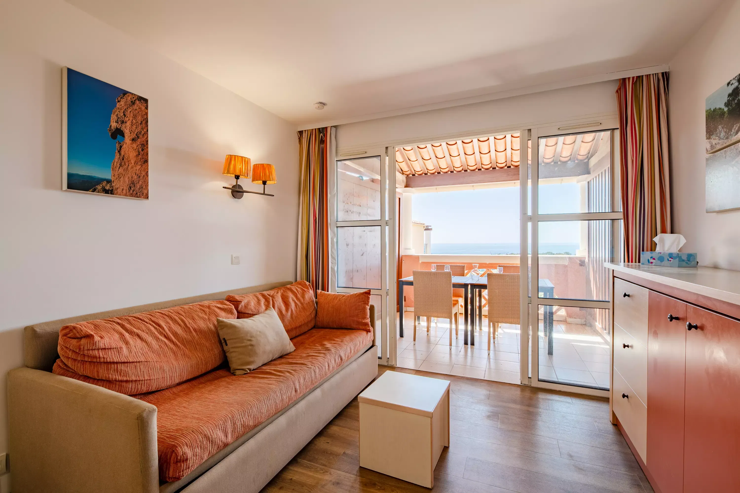 Your vacation rental includes: 1 living room, 1 sleeping alcove, 1 kitchen, 2 bedrooms, 2 bathrooms, 1 toilet, 1 terrace and 1 parking space.
