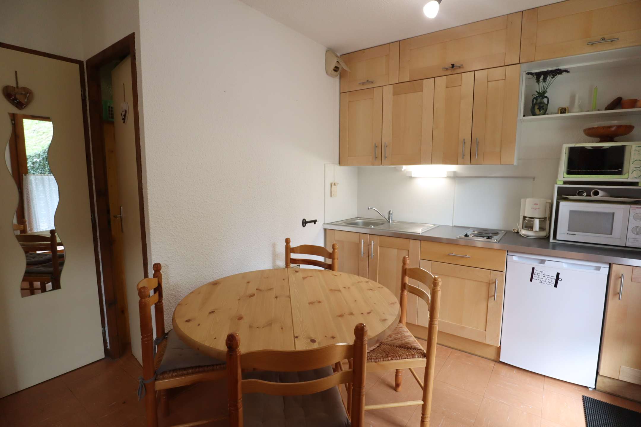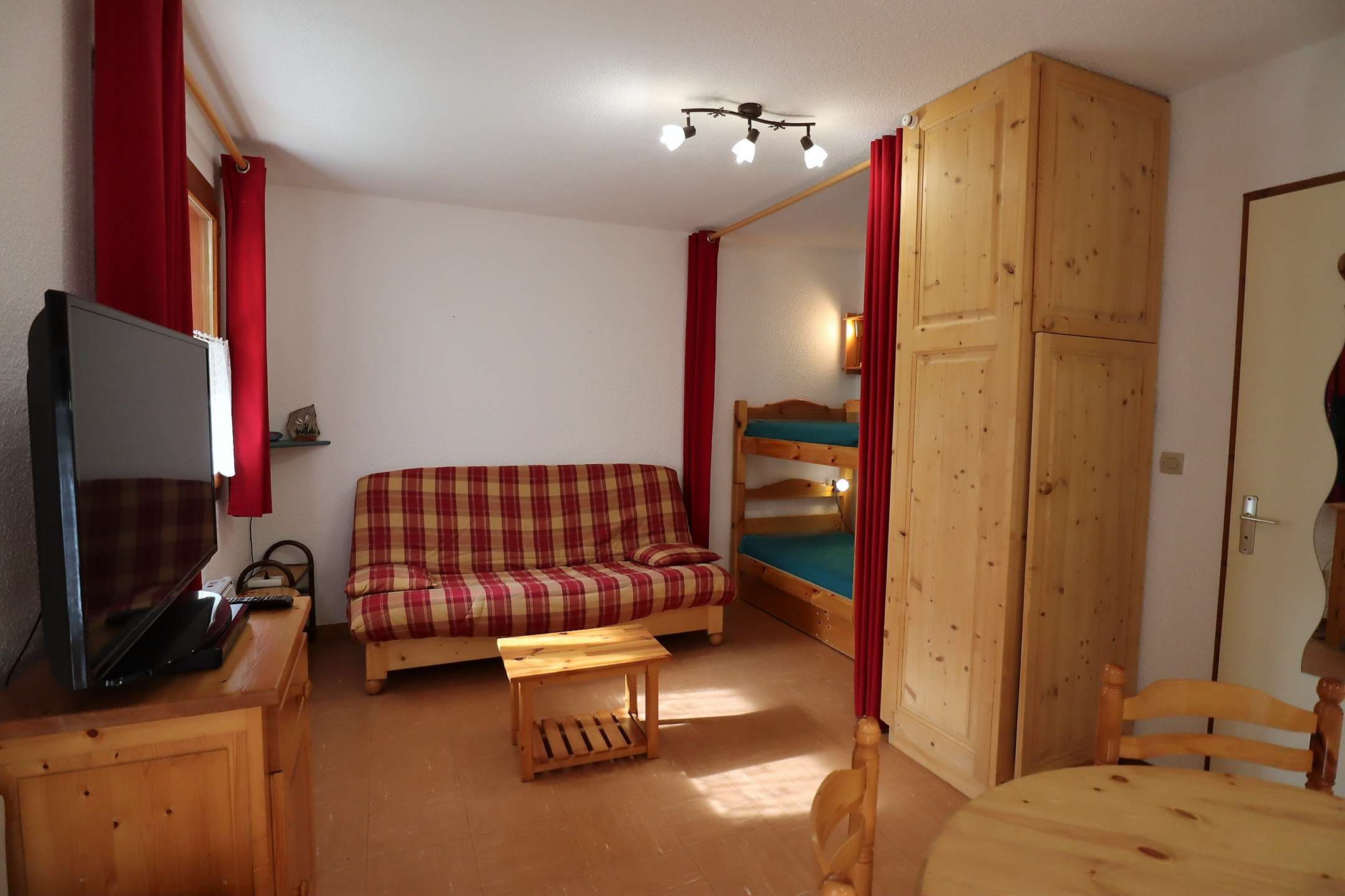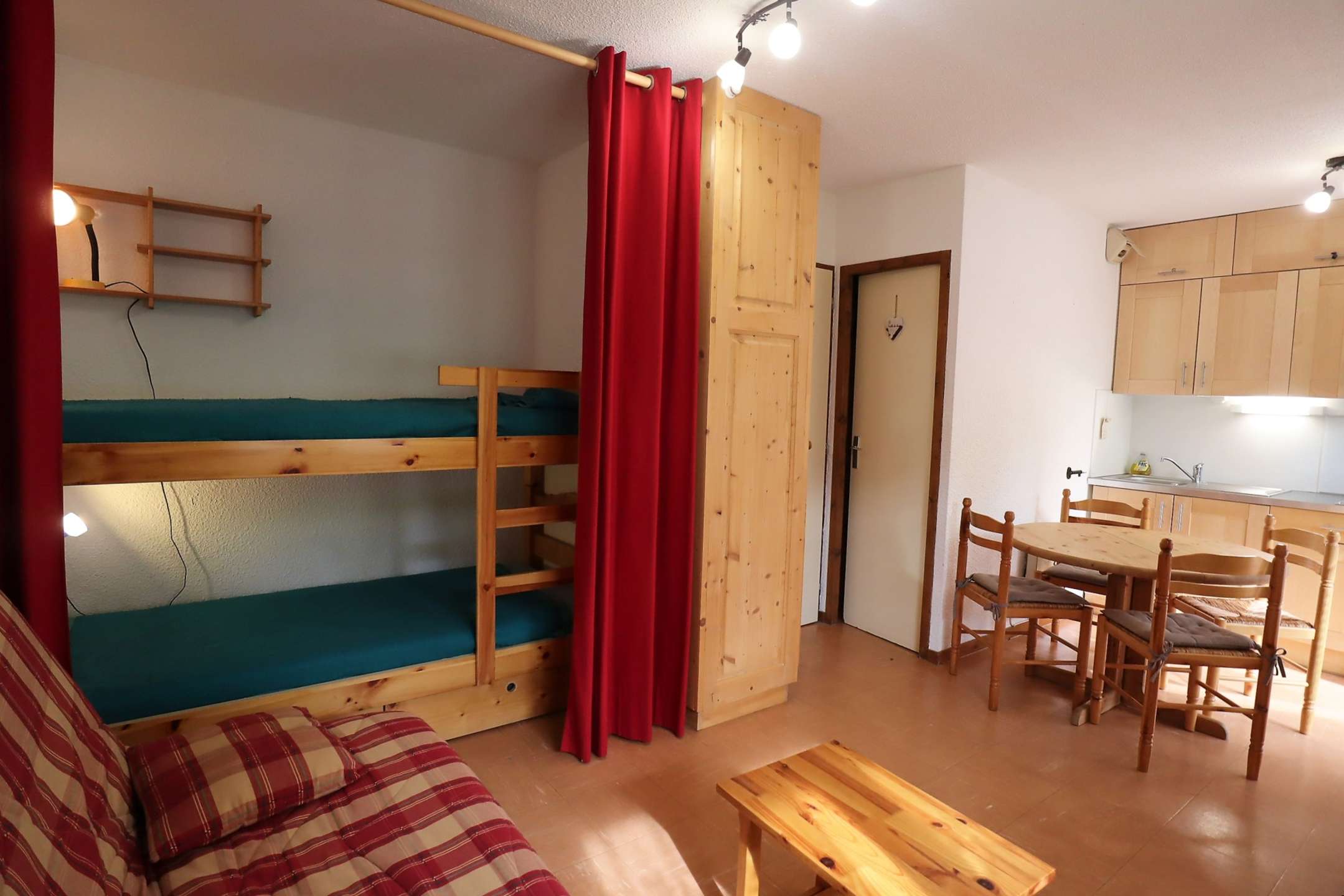 Nice and cozy studio of 23m ² in chalet of 8 apartments on the edge of the forest dominant view of village and mountain: living room with kitchenette + alcove - terrace north east - 1 convertible 2 places - 2 bunk beds - A 1KM shops: possibility to join the ski slope of the Grand Mont for good and average skiers otherwise free ski shuttle nearby. Pedestrian access by a terraced walk (steps). Not recommended for people with reduced mobility in winter. Summer possibility to park by car near the chalet. Large parking at the bottom of the residence.