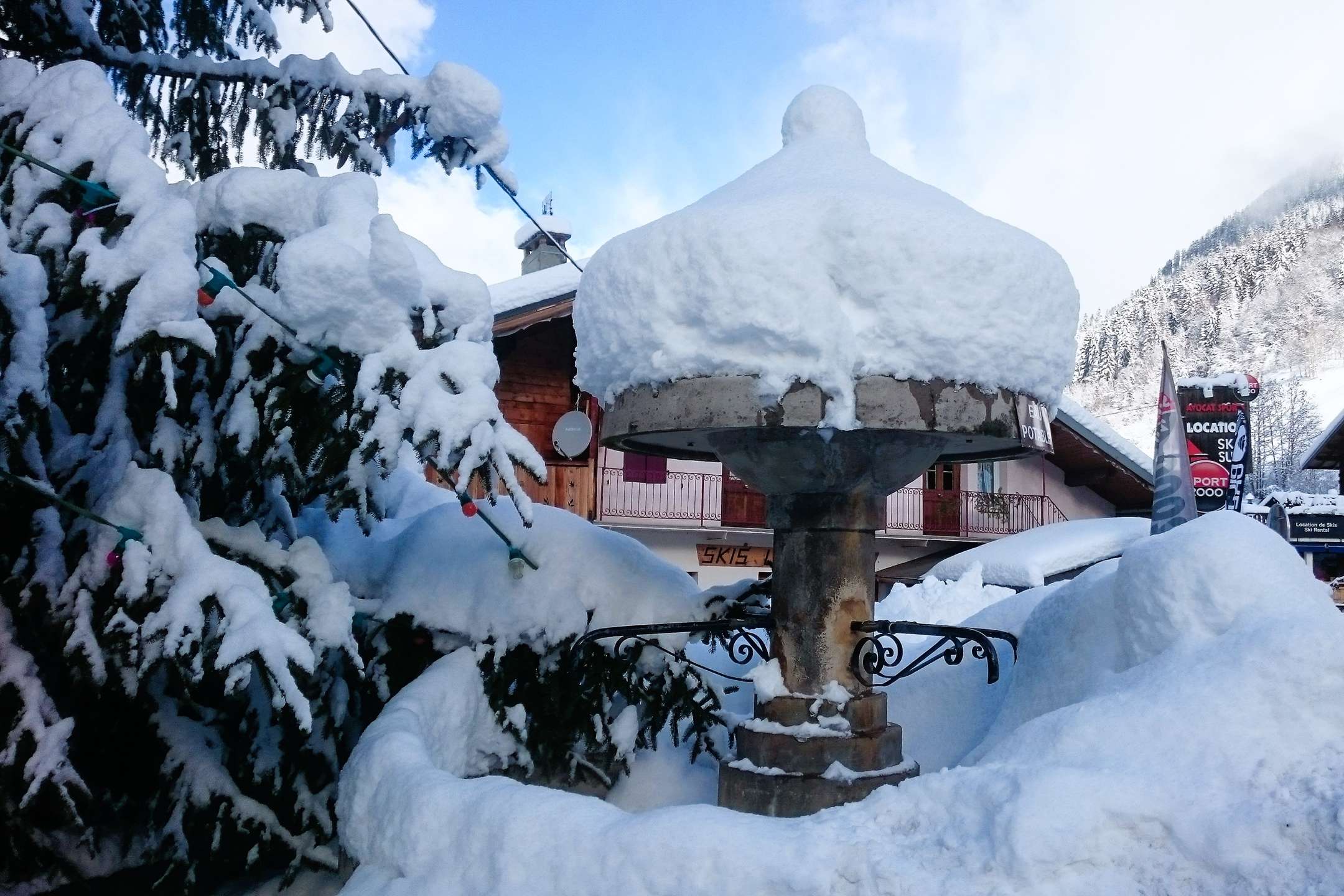 Parking on the square. Ski storage.