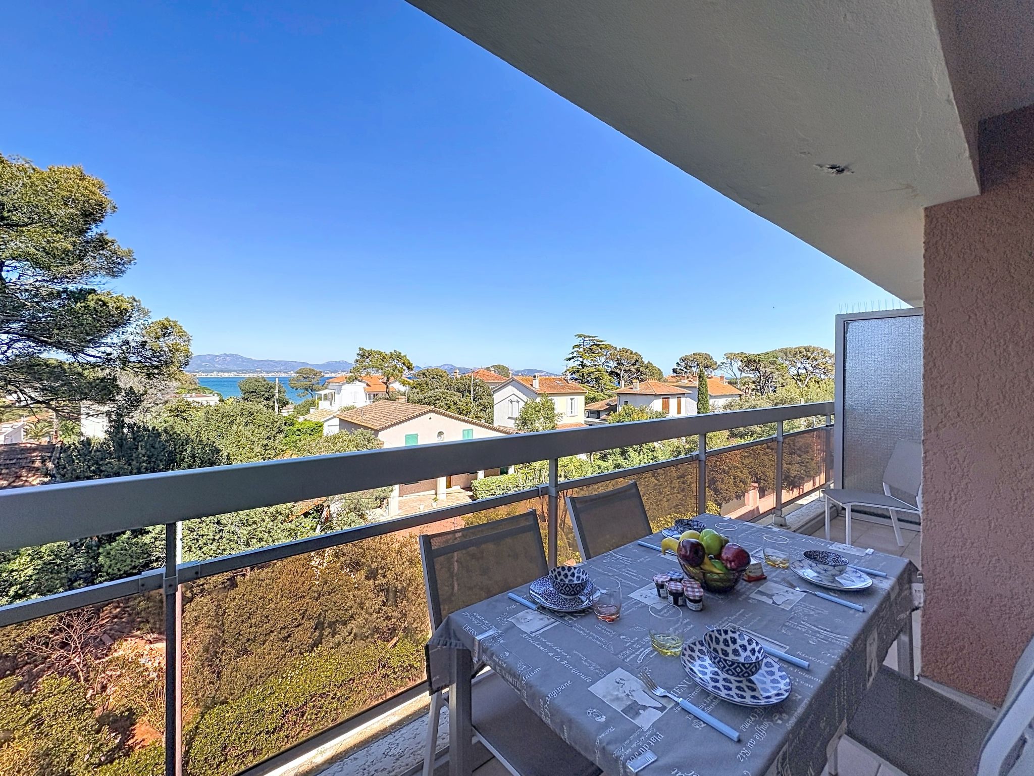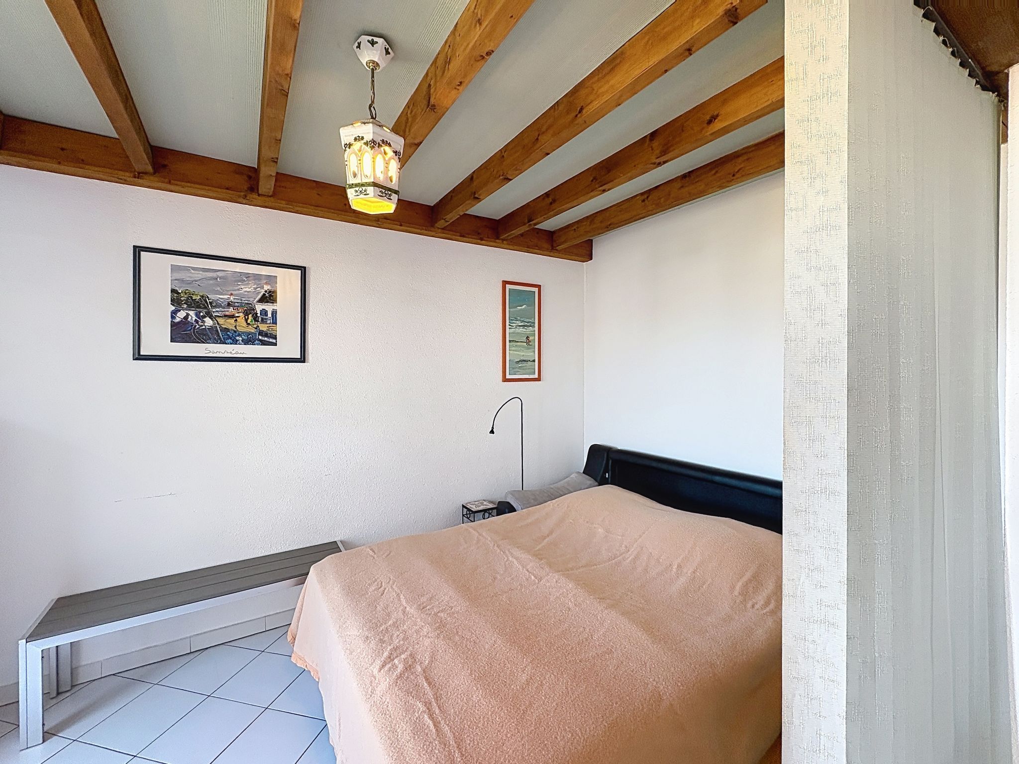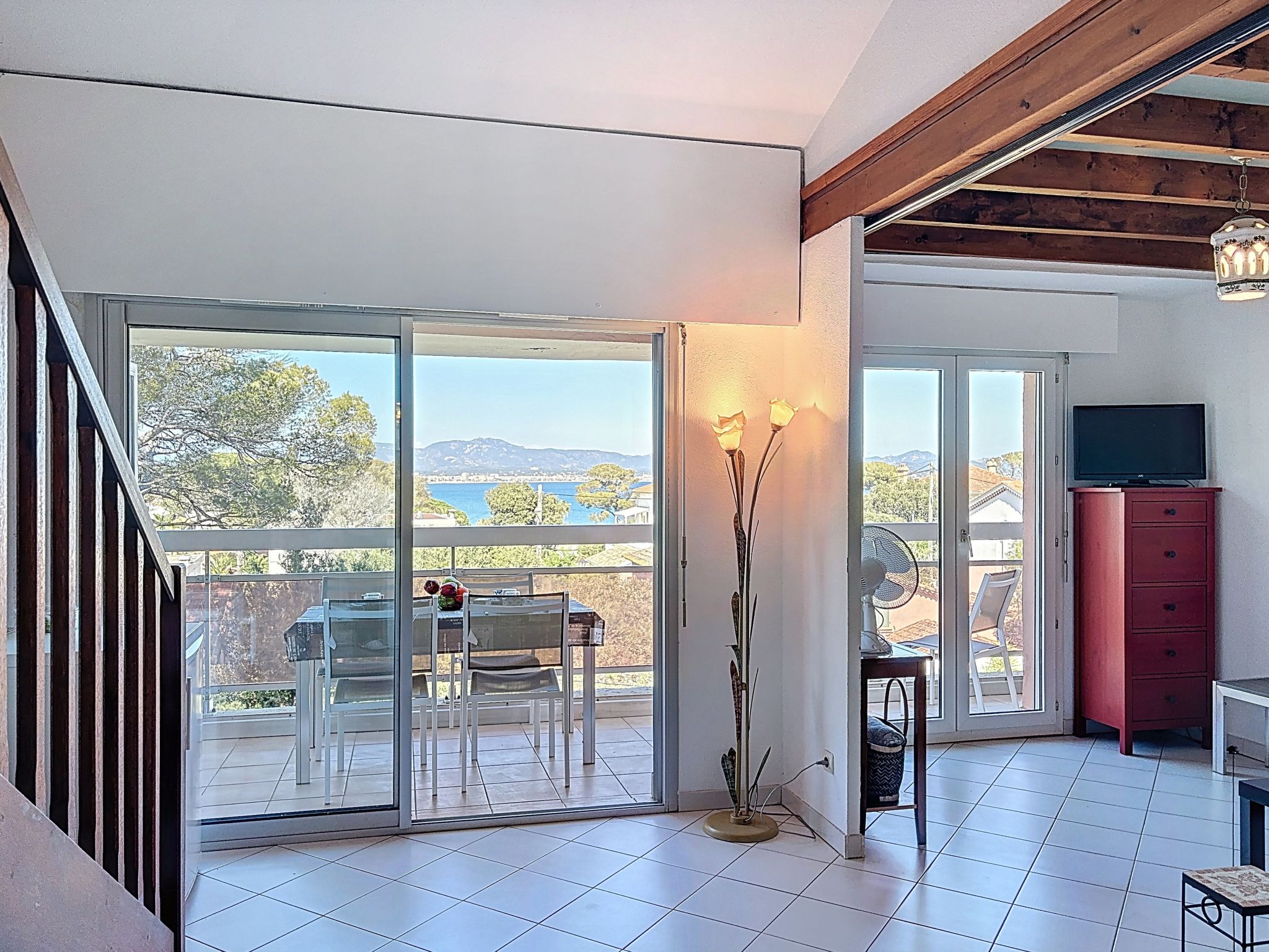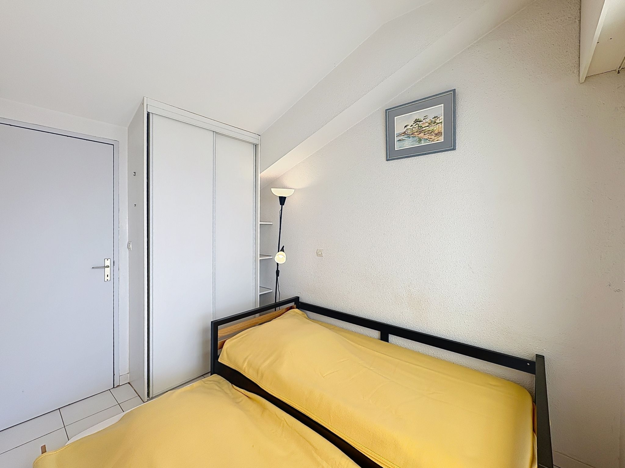 2-room apartment 45 m2 on 2 levels on 4th floor. Beautiful furnishings: living/sleeping room with 1 double sofabed (1 x 140 cm, length 190 cm), TV (flat screen). Exit to the balcony. Open kitchen (dishwasher, 2 induction hot plates, toaster, kettle, electric coffee machine, combination microwave). Shower, sep. WC. Electric heating. Upper floor: 1 room with 1 pull-out bed (1 pers. 2 x 90 cm, length 190 cm). Exit to the terrace. Bath/WC. Electric heating. Terrace 4 m2, terrace 6 m2. Terrace furniture. Beautiful view of the sea. Facilities: washing machine, iron, hair dryer. Internet (WiFi, extra). Please note: maximum 1 small pet/ dog allowed. TV only FR. Smoke alarm. Offer by a private individual according to Art. 155, IV of CGI. FJS2538HTR