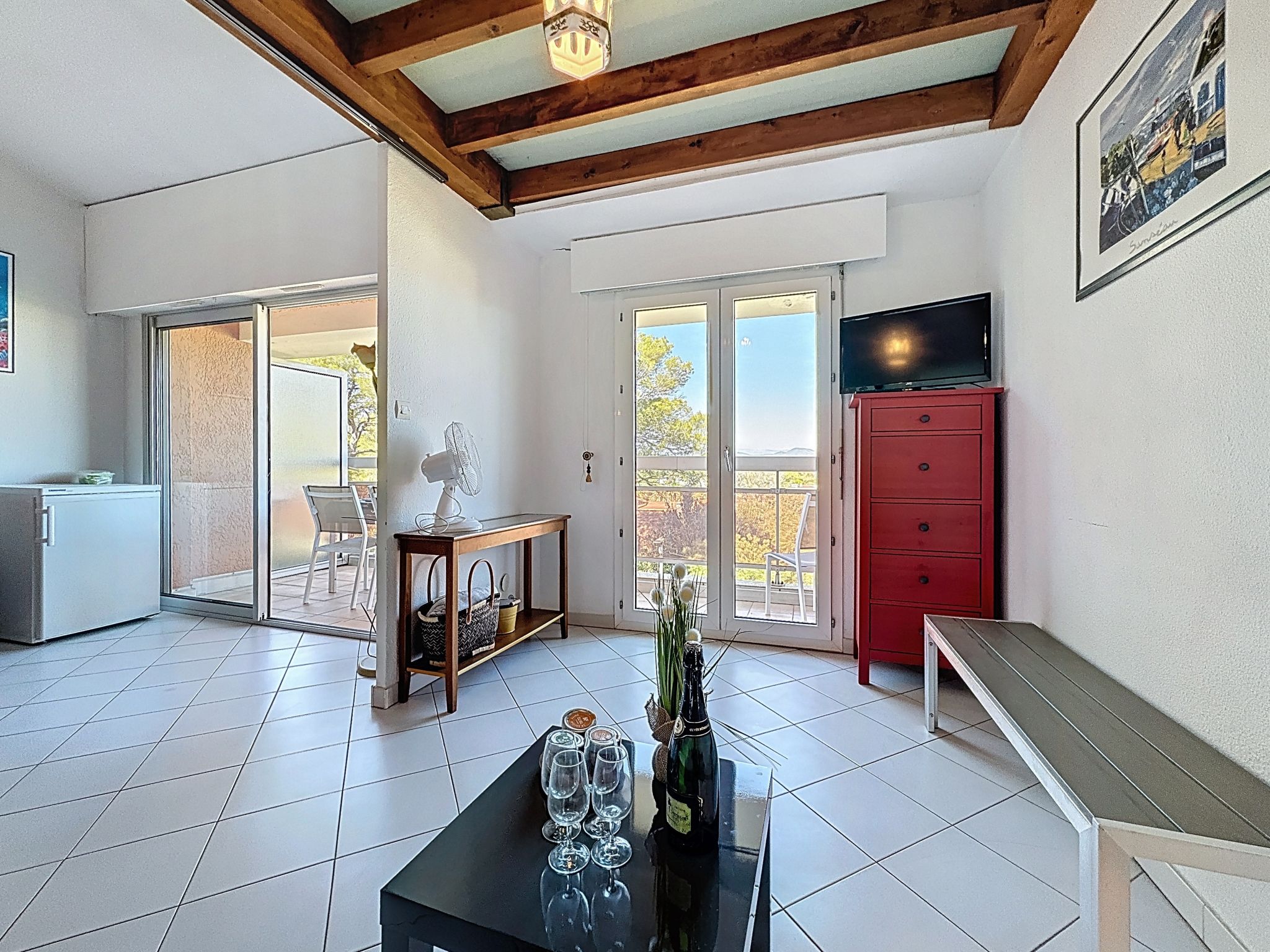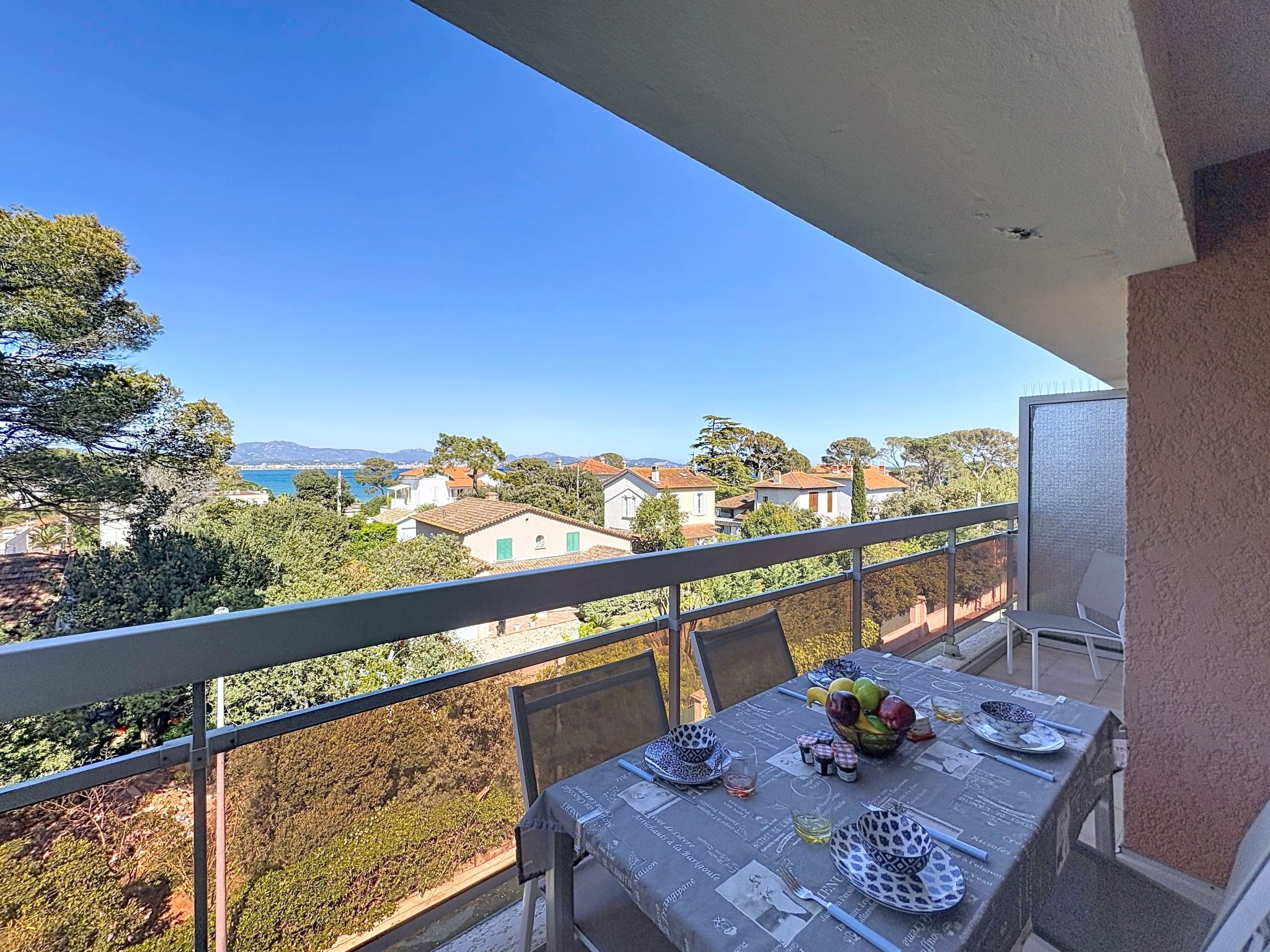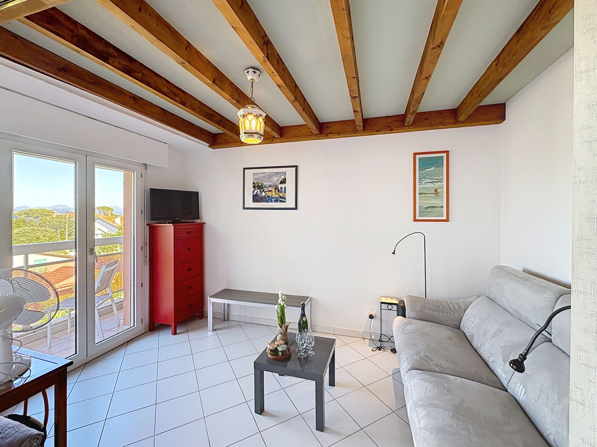 2-room apartment 45 m2 on 2 levels on 4th floor. Beautiful furnishings: living/sleeping room with 1 double sofabed (1 x 140 cm, length 190 cm), TV (flat screen). Exit to the balcony. Open kitchen (dishwasher, 2 induction hot plates, toaster, kettle, electric coffee machine, combination microwave). Shower, sep. WC. Electric heating. Upper floor: 1 room with 1 pull-out bed (1 pers. 2 x 90 cm, length 190 cm). Exit to the terrace. Bath/WC. Electric heating. Terrace 4 m2, terrace 6 m2. Terrace furniture. Beautiful view of the sea. Facilities: washing machine, iron, hair dryer. Internet (WiFi, extra). Please note: maximum 1 small pet/ dog allowed. TV only FR. Smoke alarm. Offer by a private individual according to Art. 155, IV of CGI. FJS2538HTR