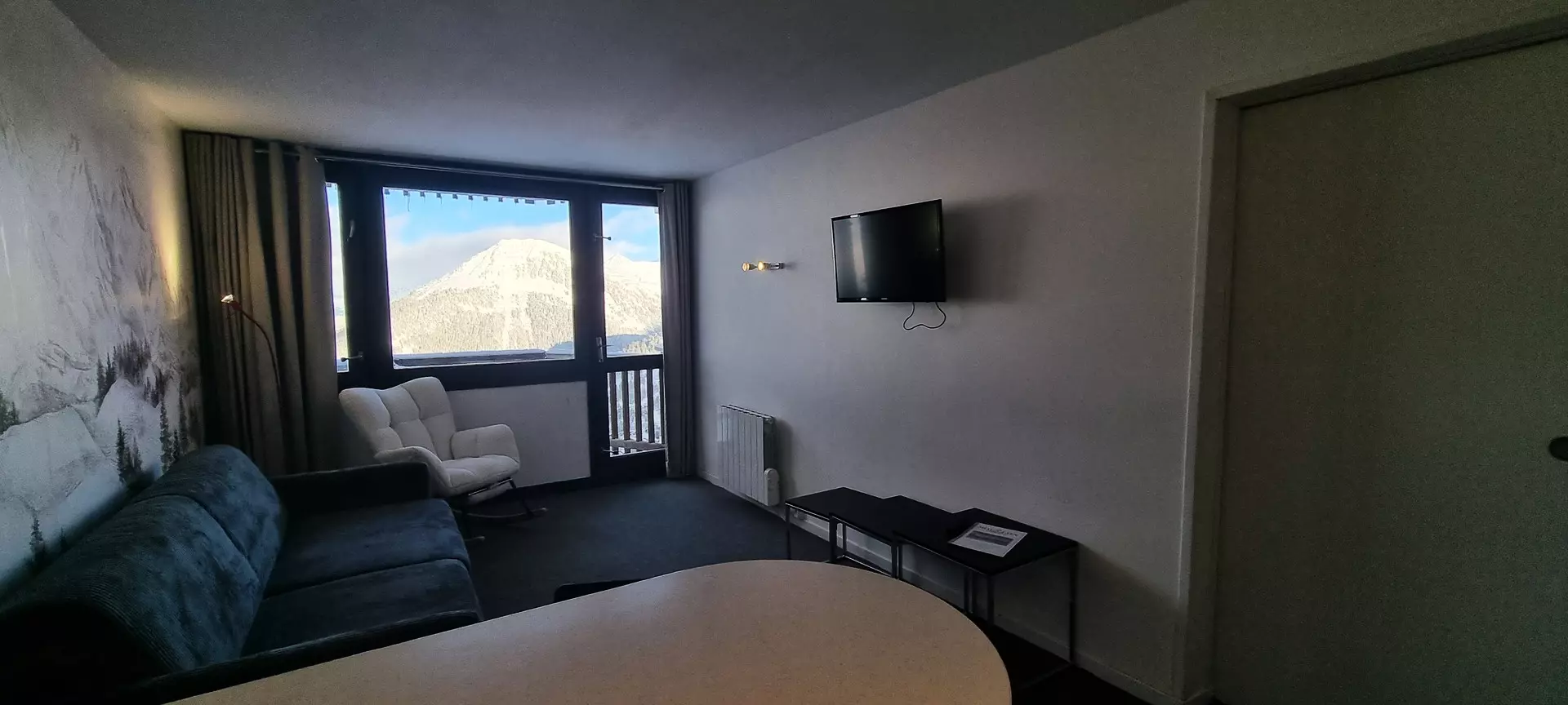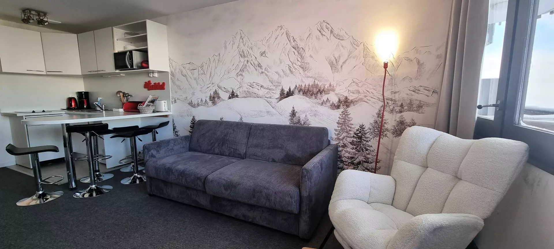 This renovated studio is located on level "M" of the Paquebot des Neiges and is accessible by the "Diamant" elevator. It consists of a kitchen open to the living room, a one-bedroom, a bathroom, and a separate toilet. Its north-facing balcony offers a beautiful view of Mont Blanc.