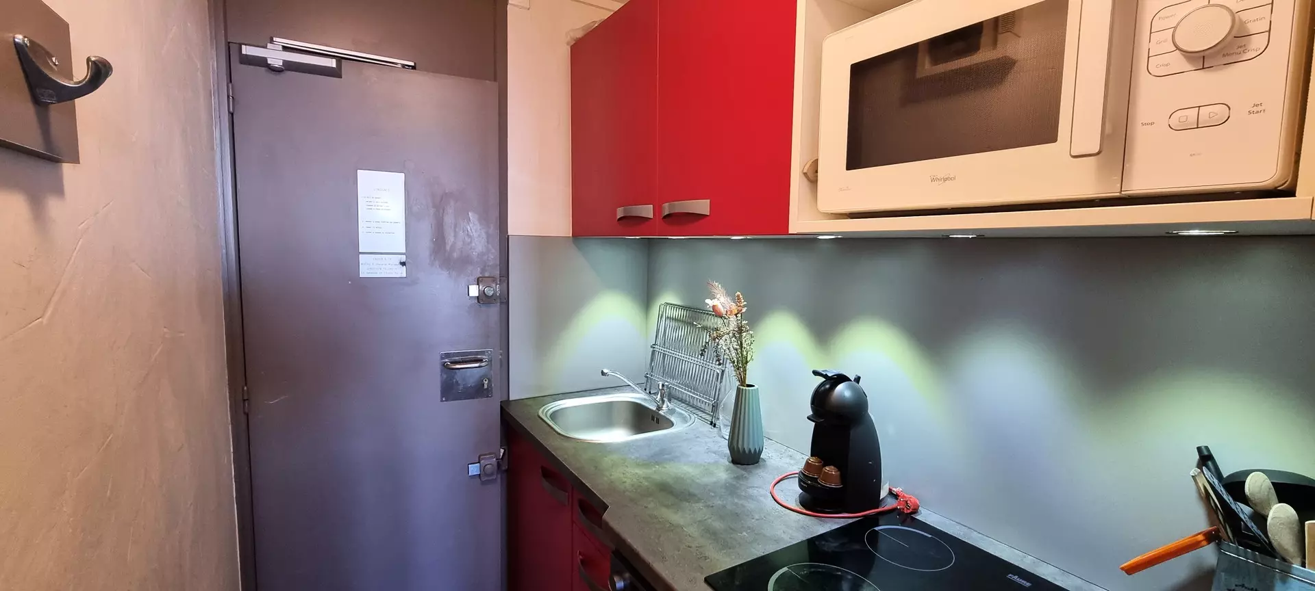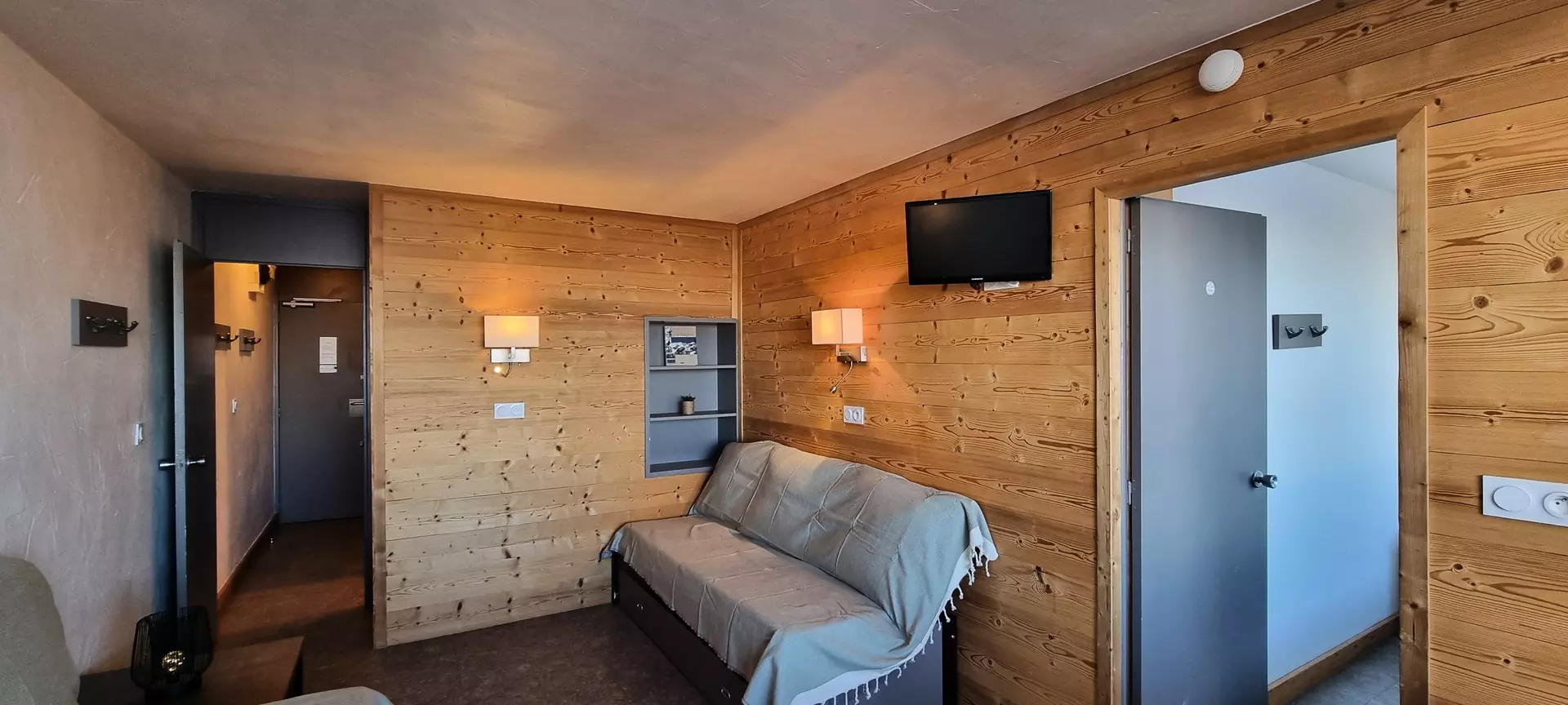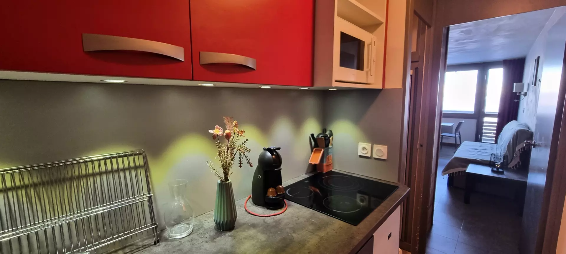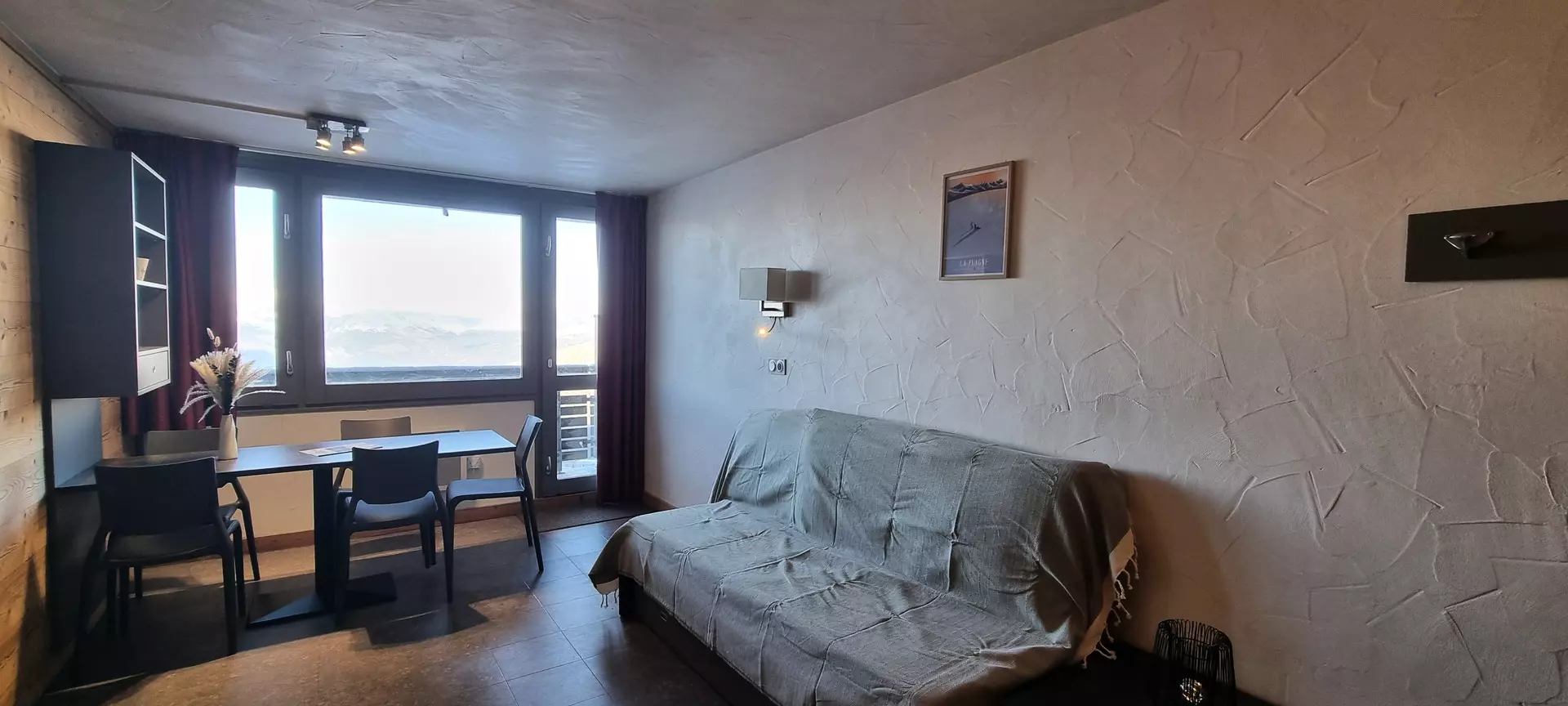 The apartment is located on level "H" of the Paquebot des Neiges and is accessible by the "Zénith" elevator. It consists of a living room, a separate kitchen, a bedroom, and a bathroom with WC. Its balcony faces north and offers a beautiful view of Mont Blanc.