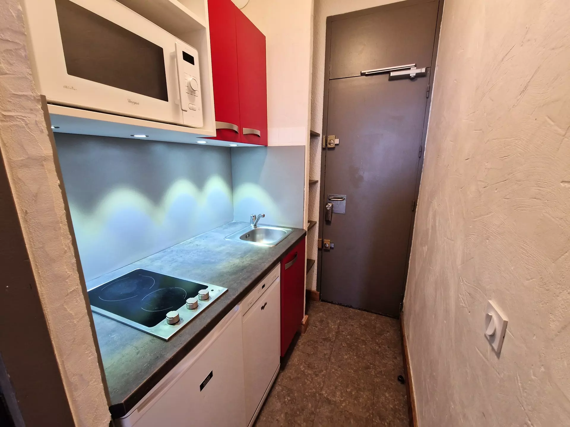 This studio is located on level "G" of the Paquebot des Neiges and is accessible by the "Etoile" elevator. It consists of a kitchen, a living room with a separate cabin, and a bathroom with toilet. Facing south, it offers a lovely view of the Aime 2000 slopes.