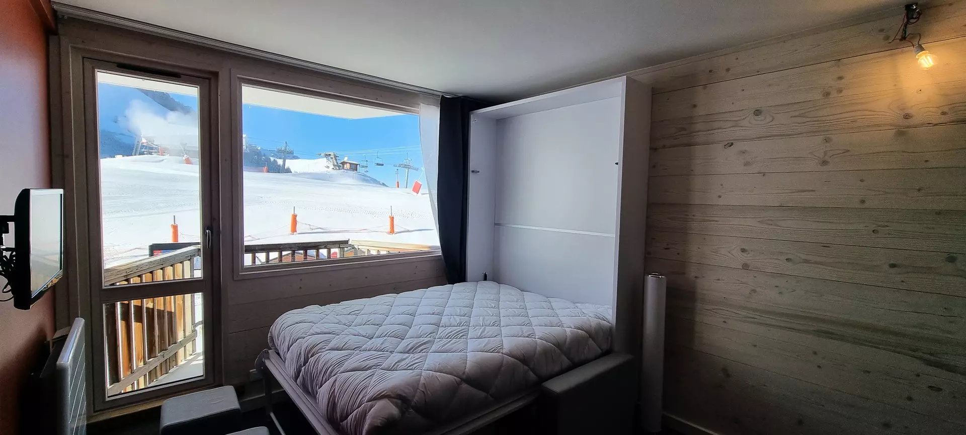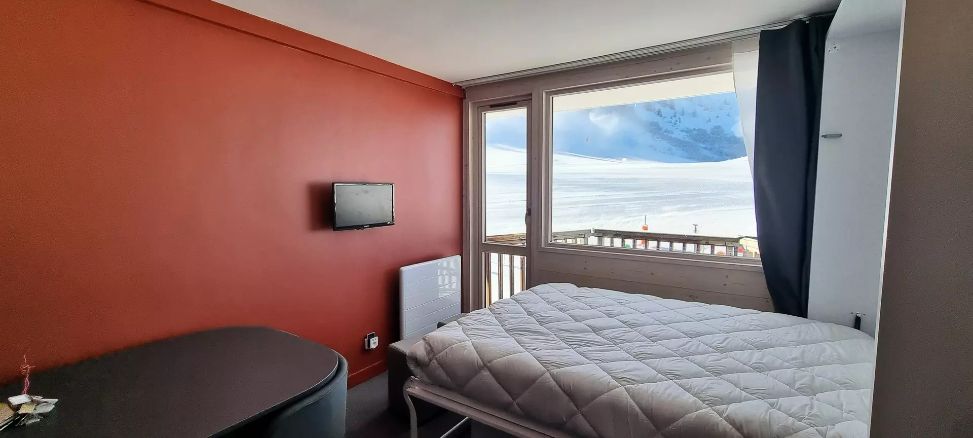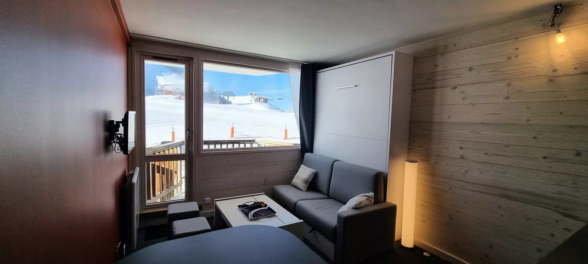 This tastefully renovated studio is located on level "I" of the Paquebot des Neiges and is accessible by the "Diamant" elevator. It consists of a living room, a cabin area, an open kitchen, a shower room, and a separate toilet. Its southwest-facing balcony offers a superb view of the Aime 2000 slopes.