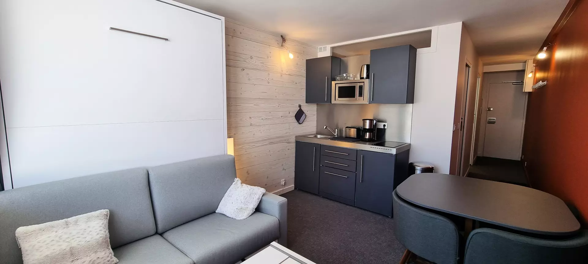 The kitchen, overlooking the living room, is equipped with a microwave grill oven, 2 induction hobs, a refrigerator, a mini dishwasher, and a filter coffee maker.