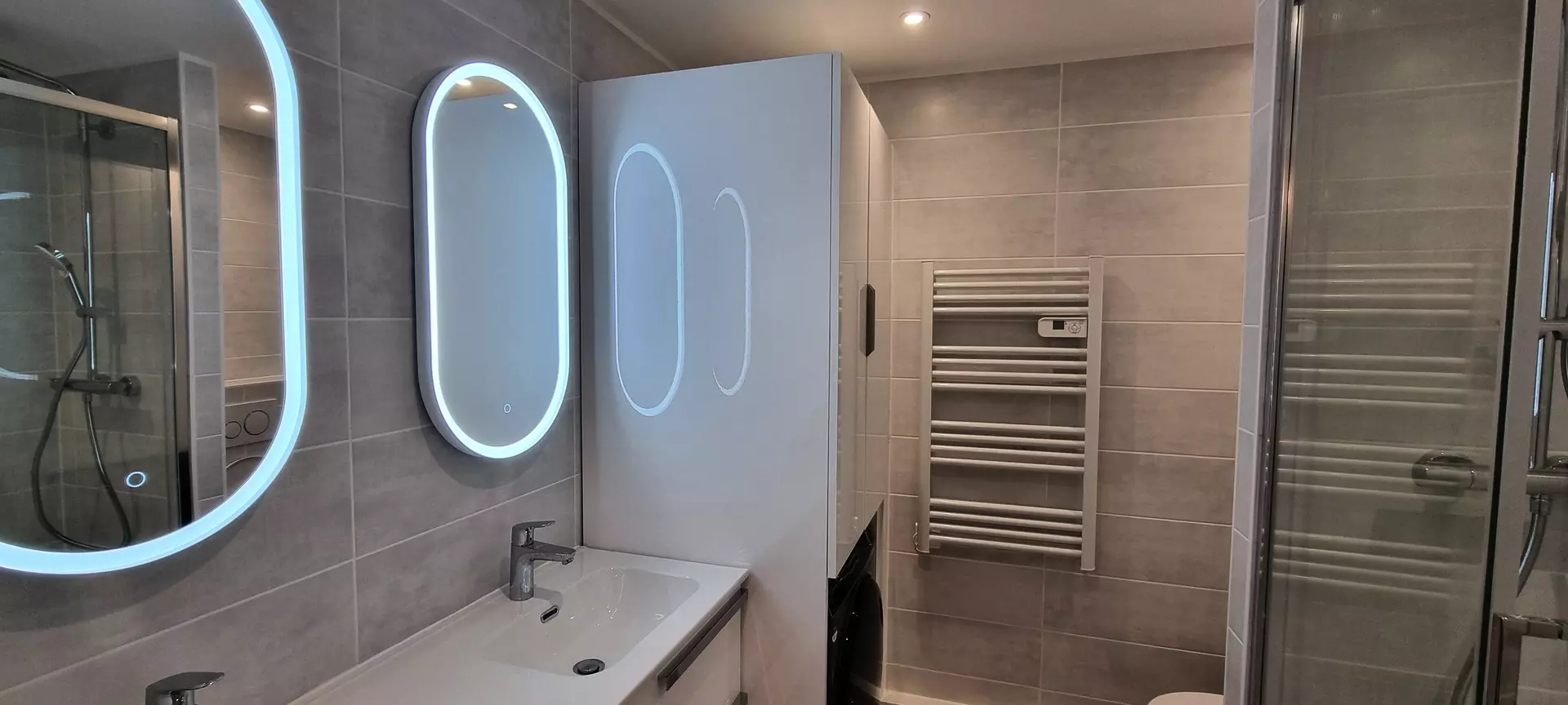 The bathroom has a double sink unit, a shower cubicle and a washing machine.