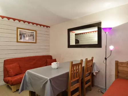 This renovated studio is located on the "N" level of the Paquebot des Neiges and is accessible by the "Chamois" elevator. It consists of a living room, a separate kitchen, a bathroom, and a separate toilet. Its south-facing balcony offers a beautiful view of the Aime 2000 ski area.
