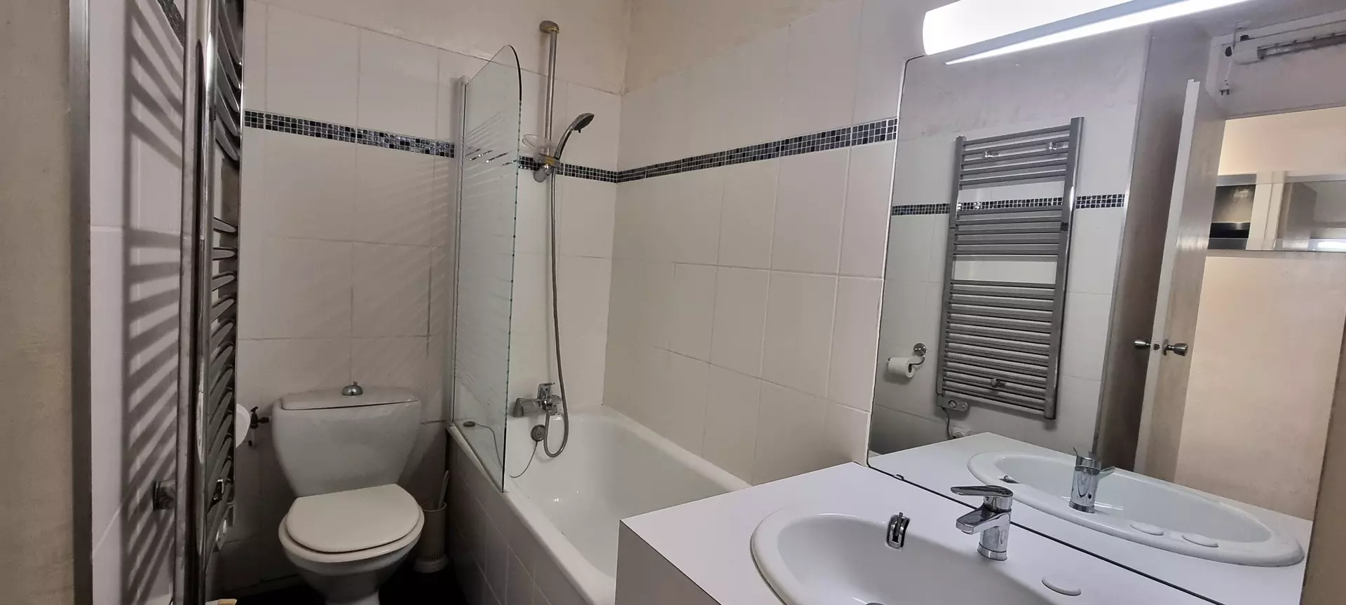 The kitchen, located in the entrance, is equipped with a combination oven, 2 ceramic hobs, a top fridge and a dishwasher.