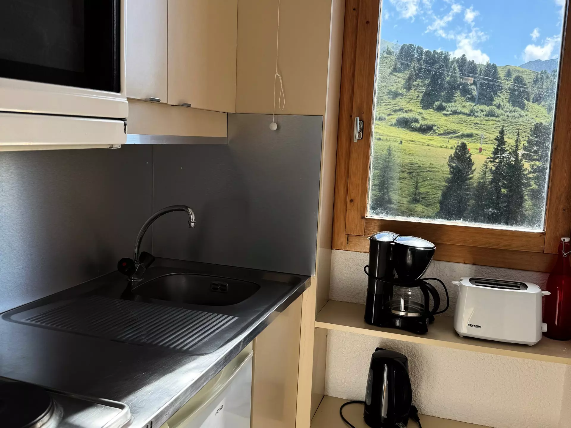 Kitchen: separate with mountain view window, dishwasher, electric oven, microwave and 2 electric hotplates.