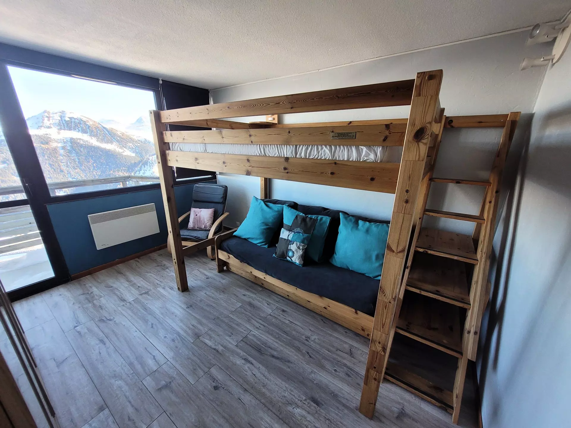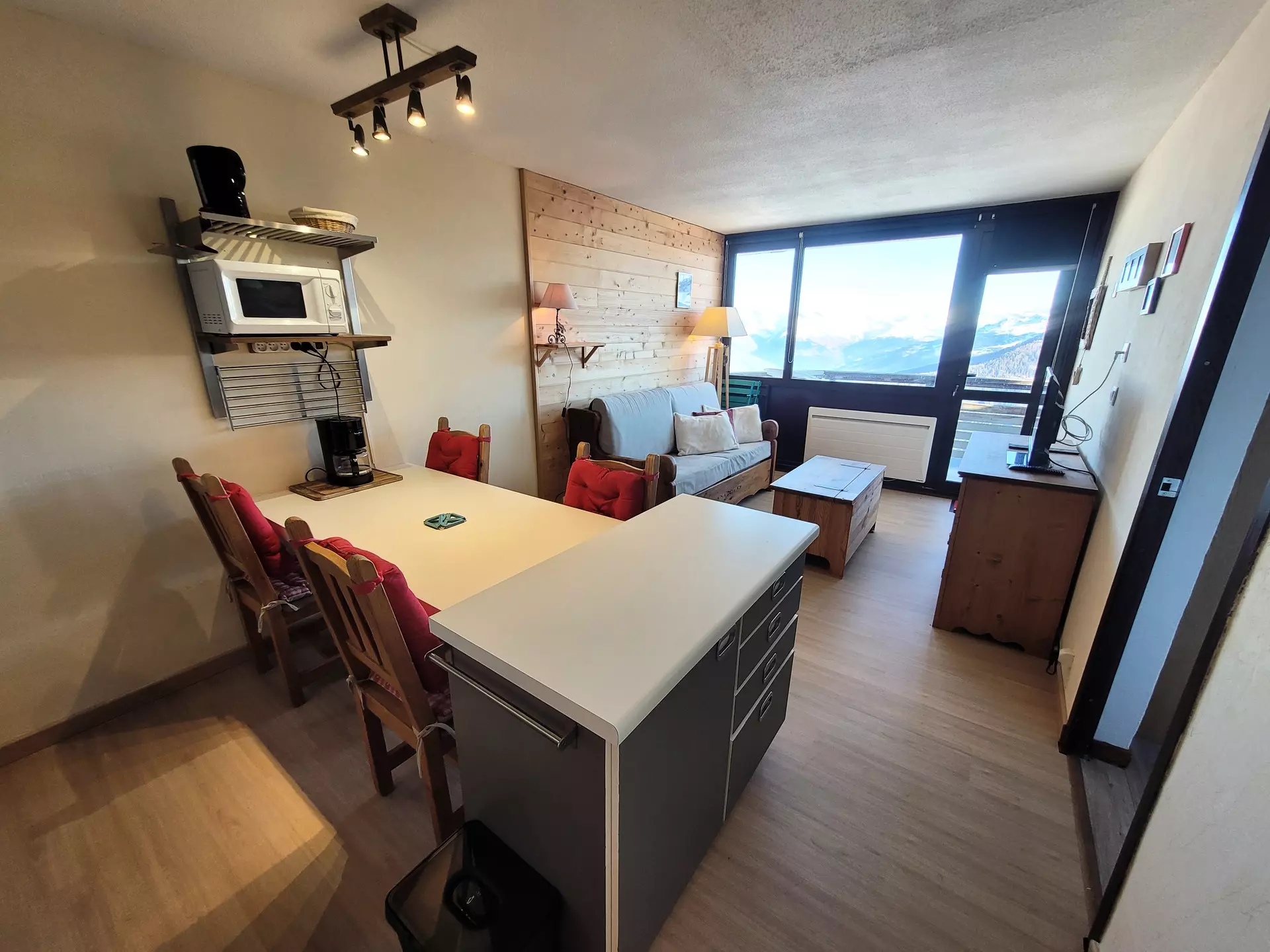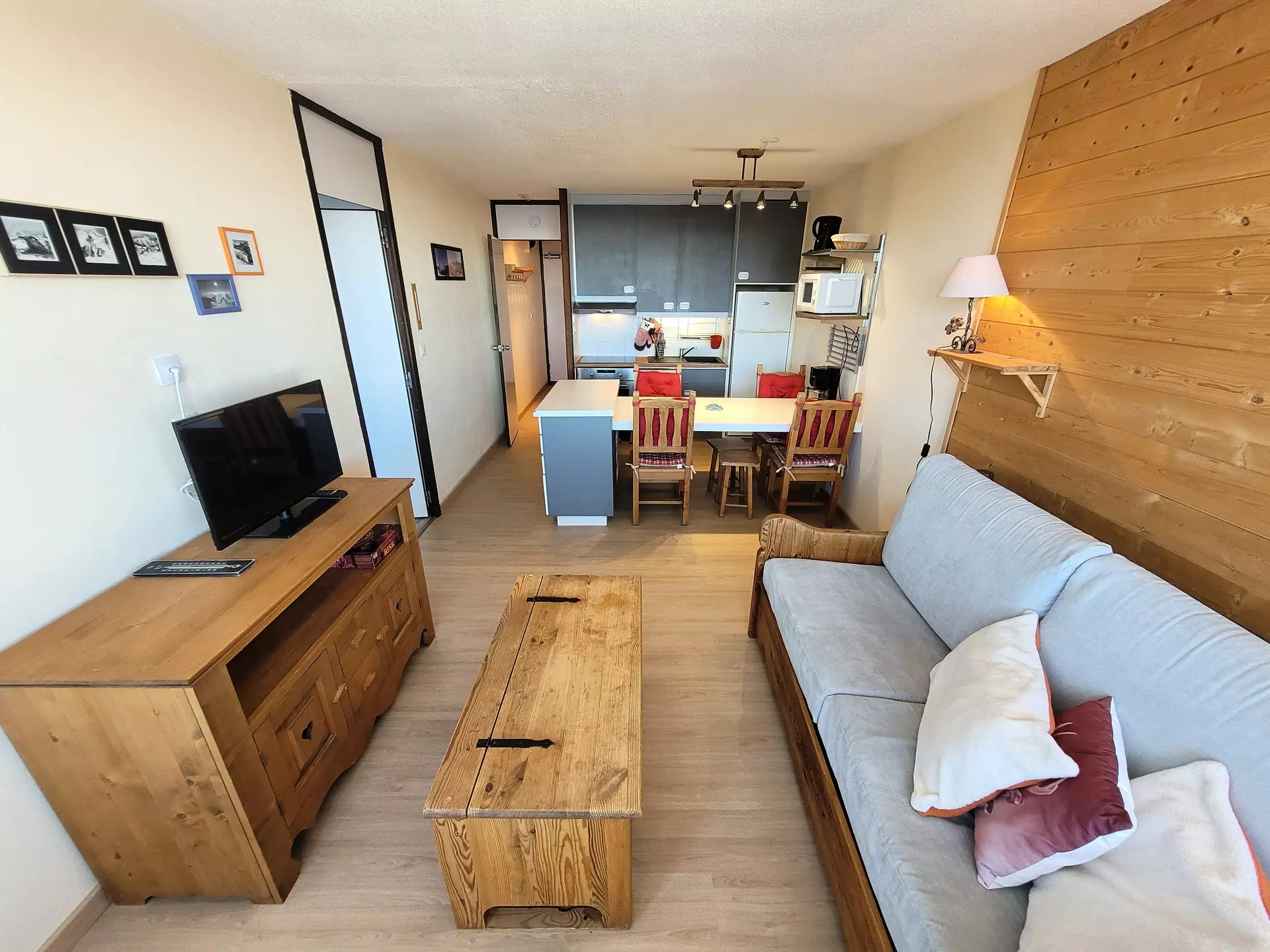 The apartment is located on level "Q" of the Paquebot des Neiges building and is accessible via the "DIAMANT" elevator. It comprises a living room, a separate kitchen, a bedroom, and a bathroom with a toilet. Its north-facing balcony offers a lovely view of Mont Blanc.