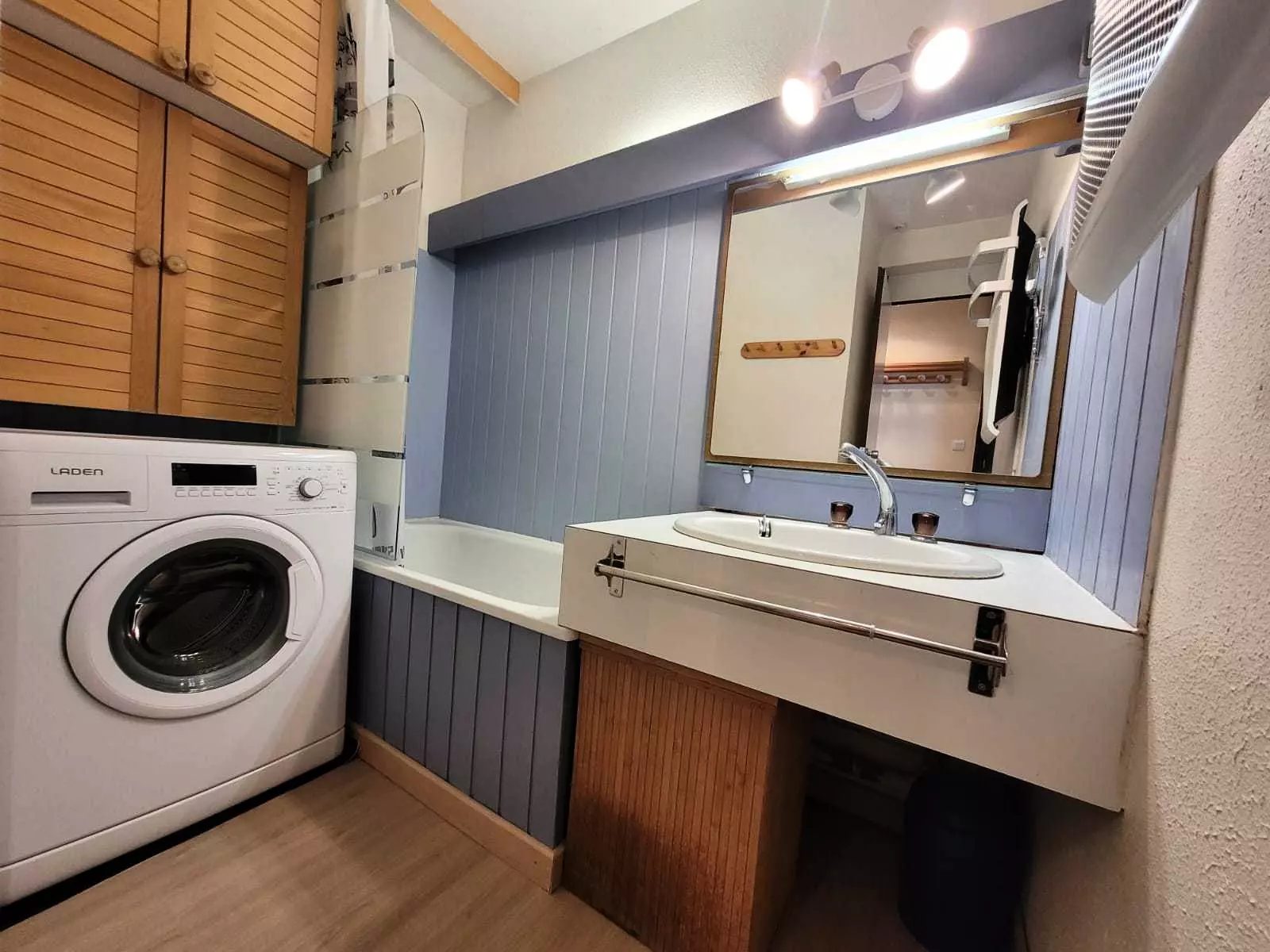 The bathroom consists of a bathtub, a washing machine and a non-separate toilet.