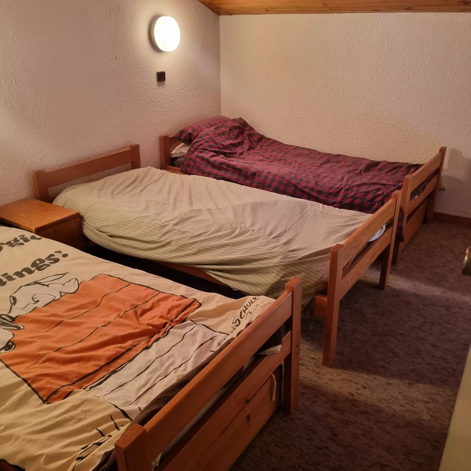 Enclosed mezzanine area upstairs with a skylight: 3 single beds