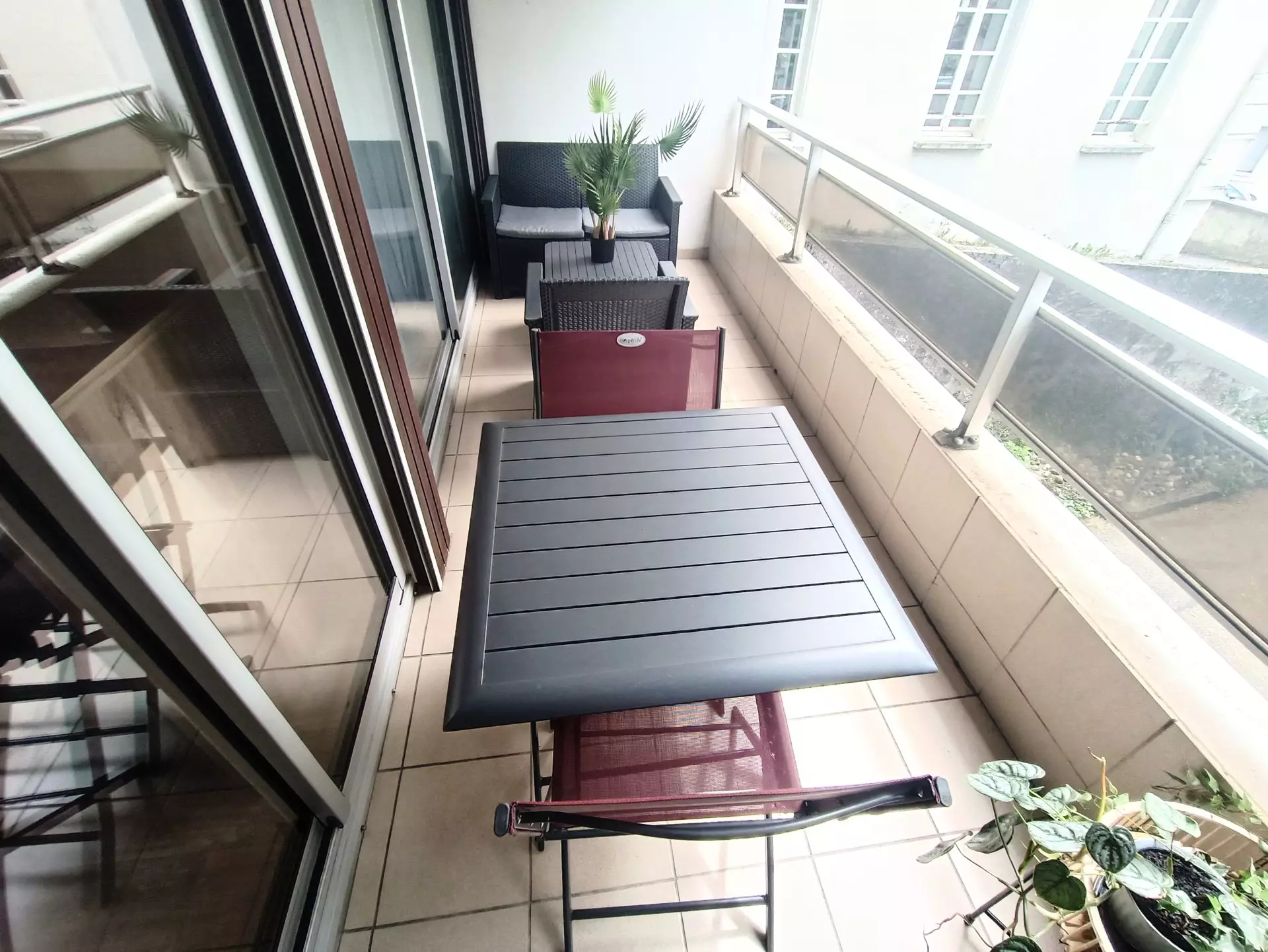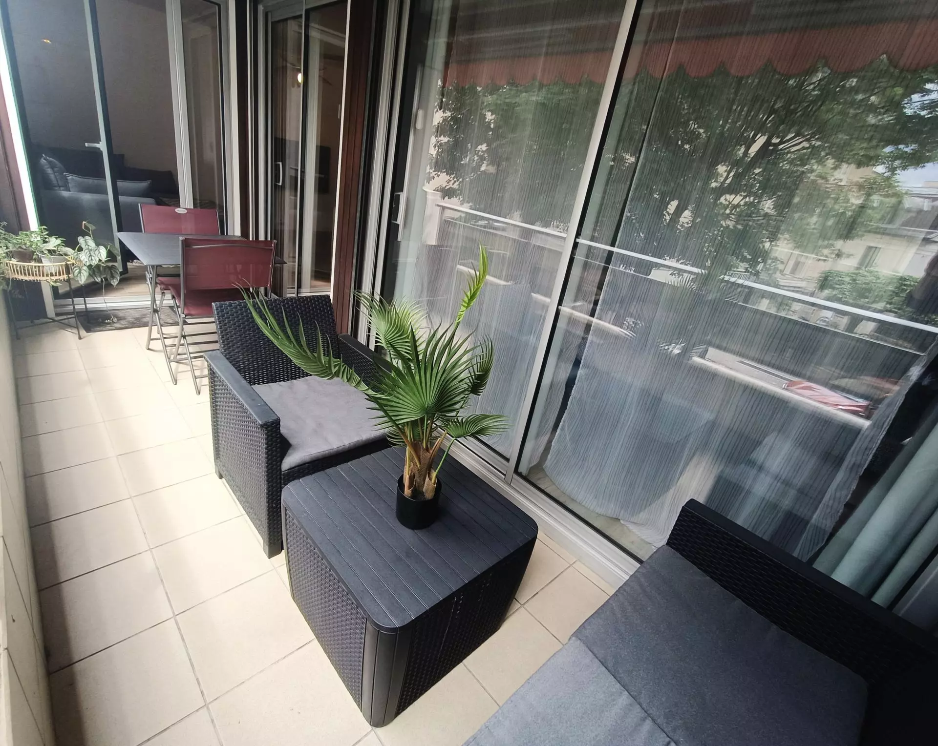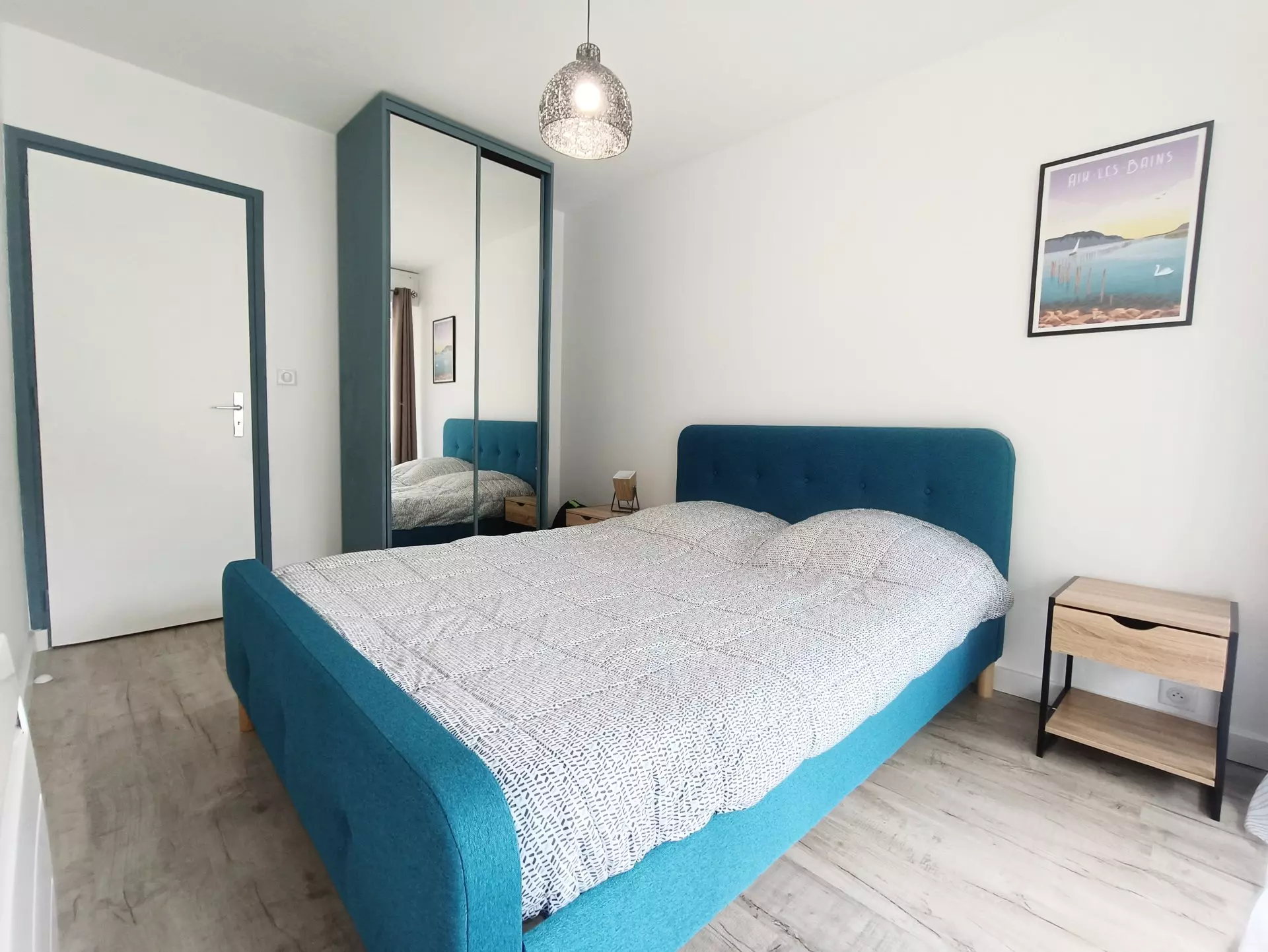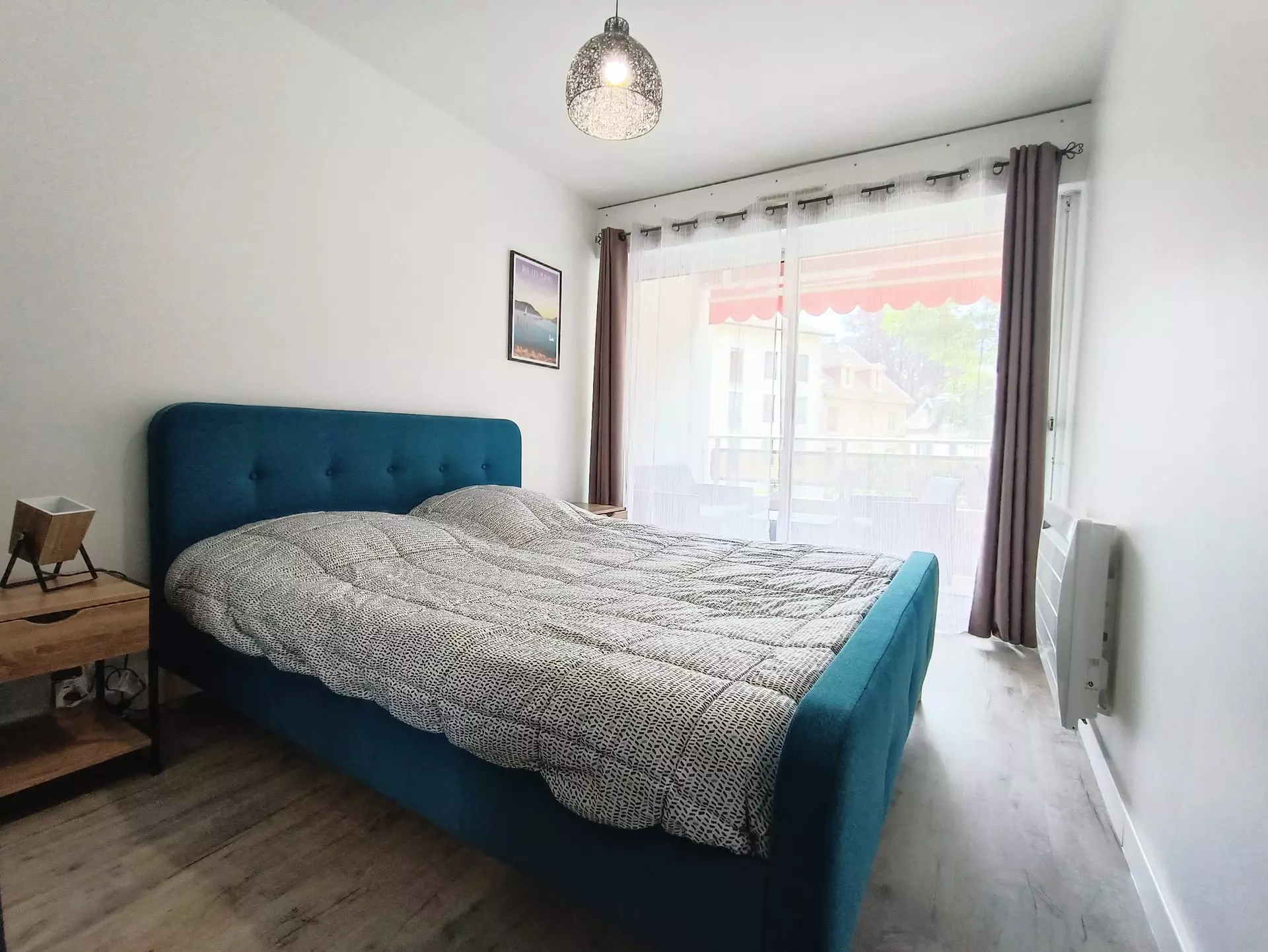 Bedroom (parquet floor) opening onto balcony: 1 bed 160cm, 2 bedside tables, 1 wardrobe/closet.