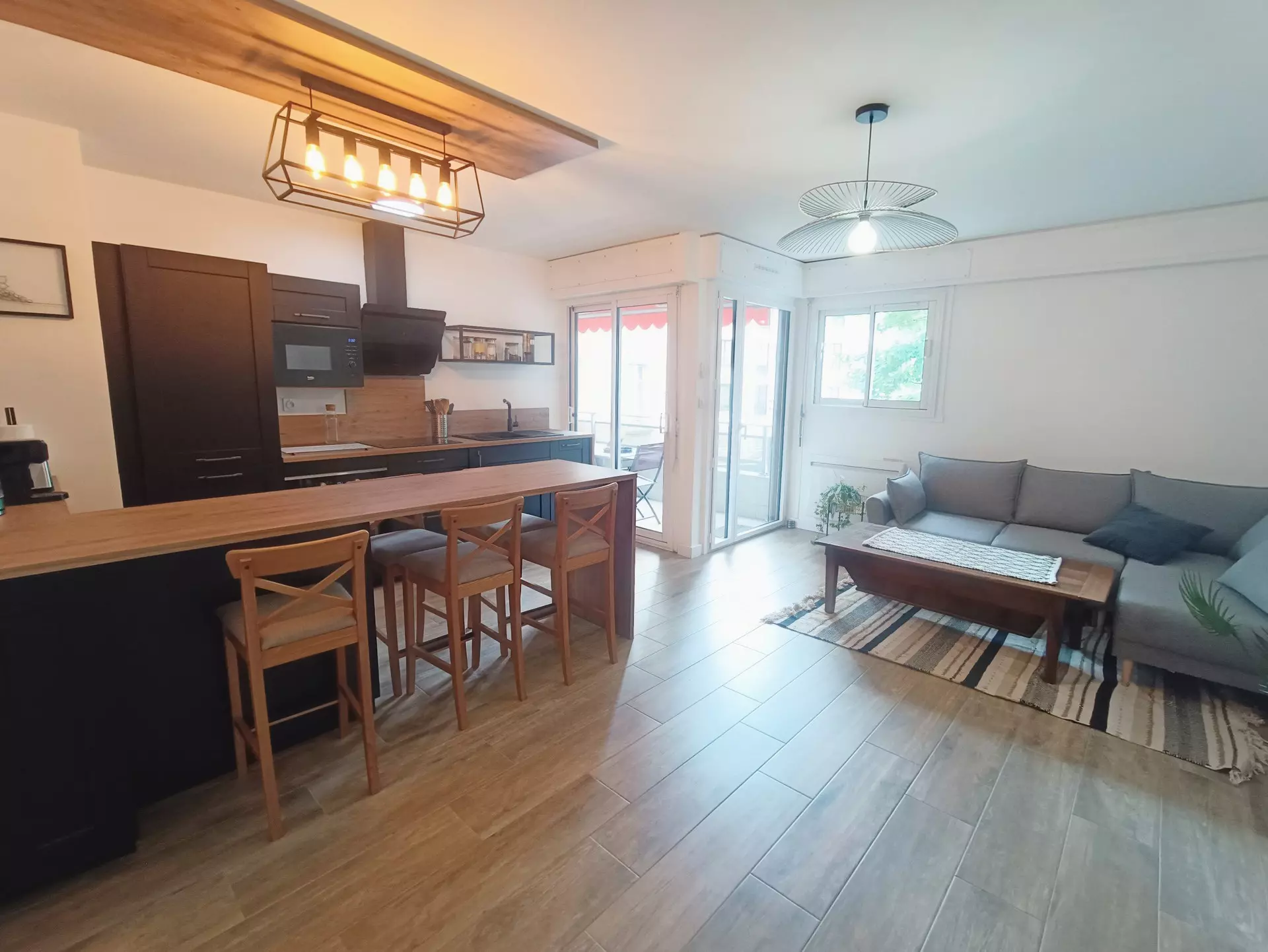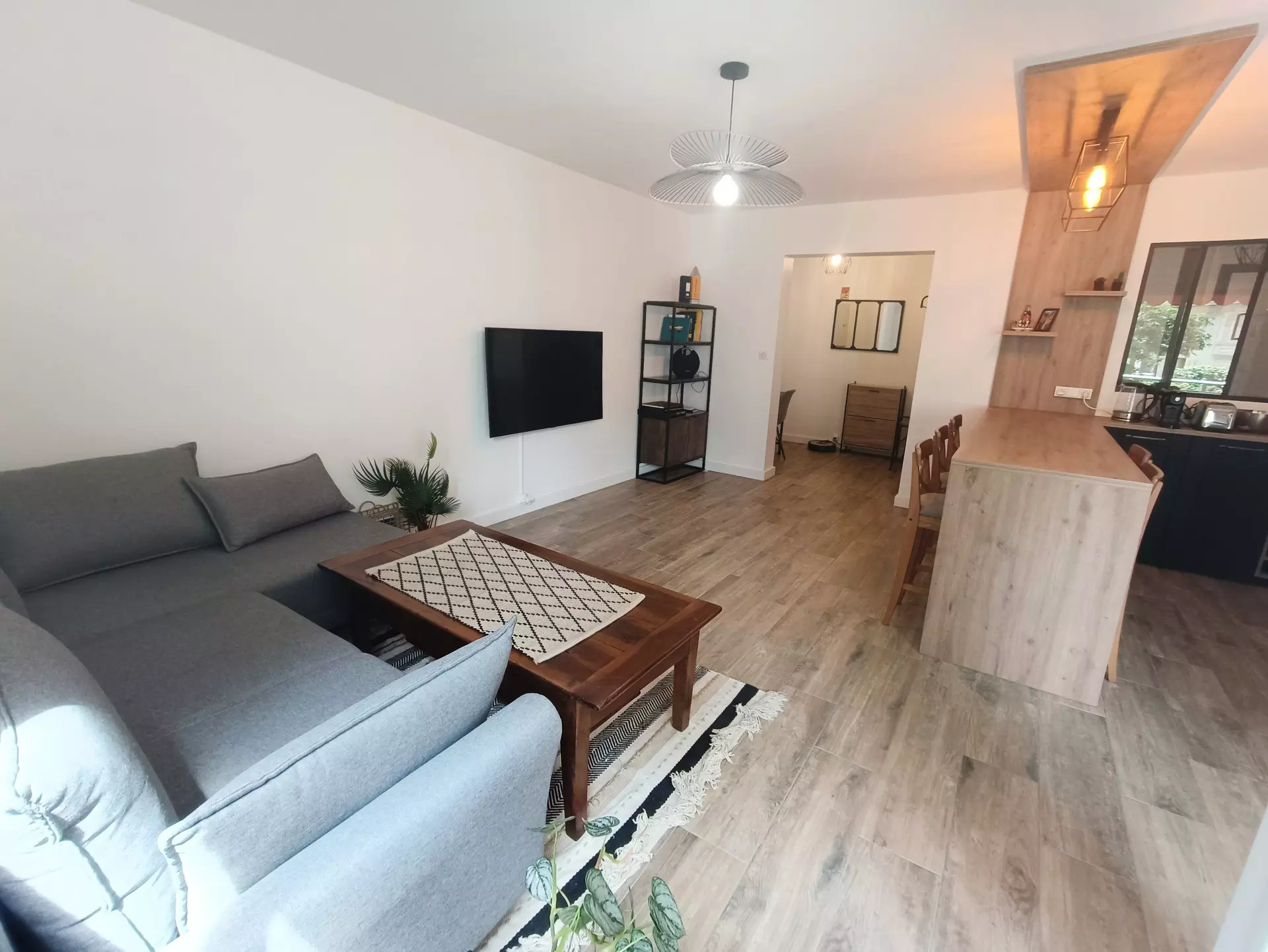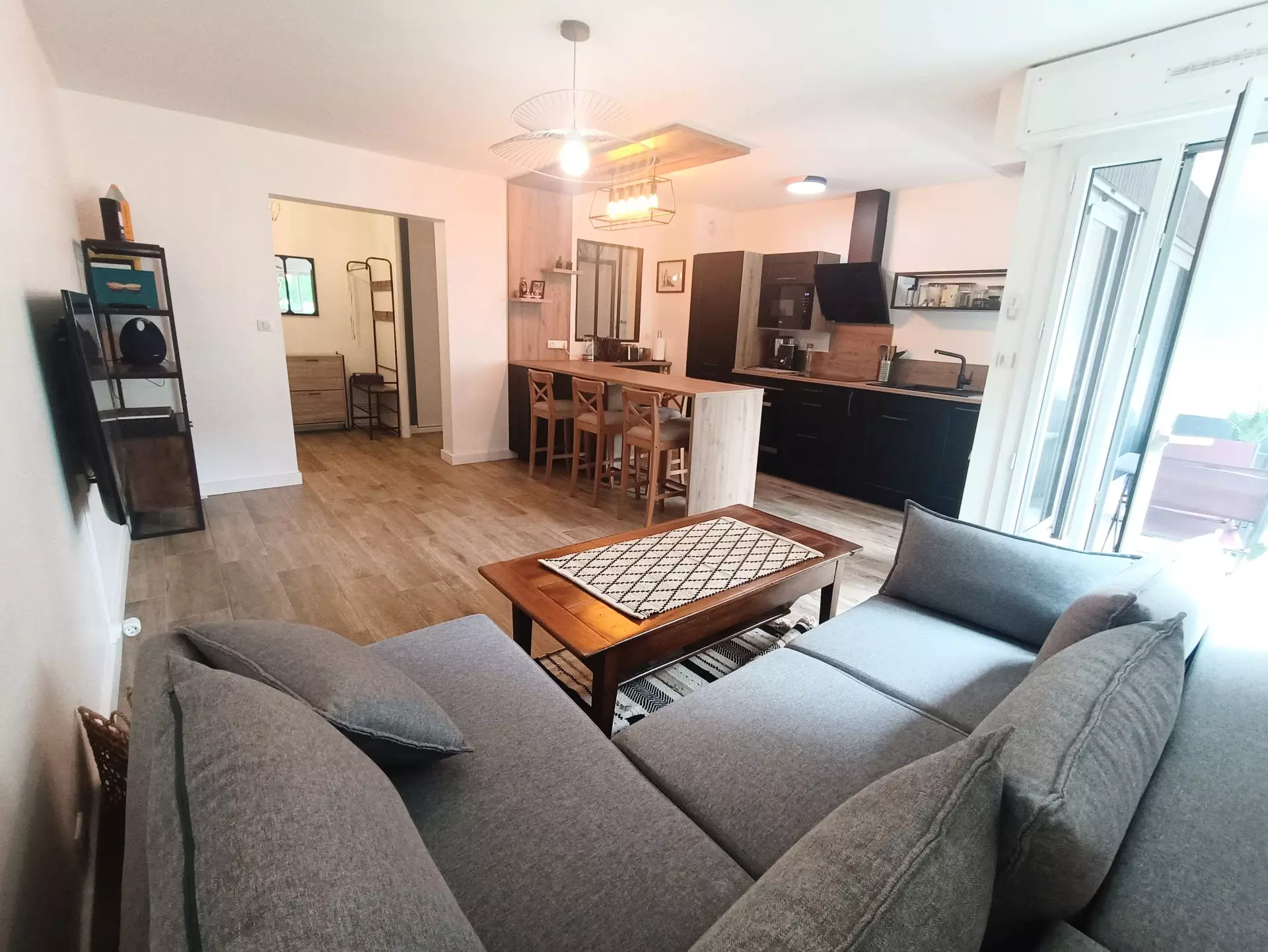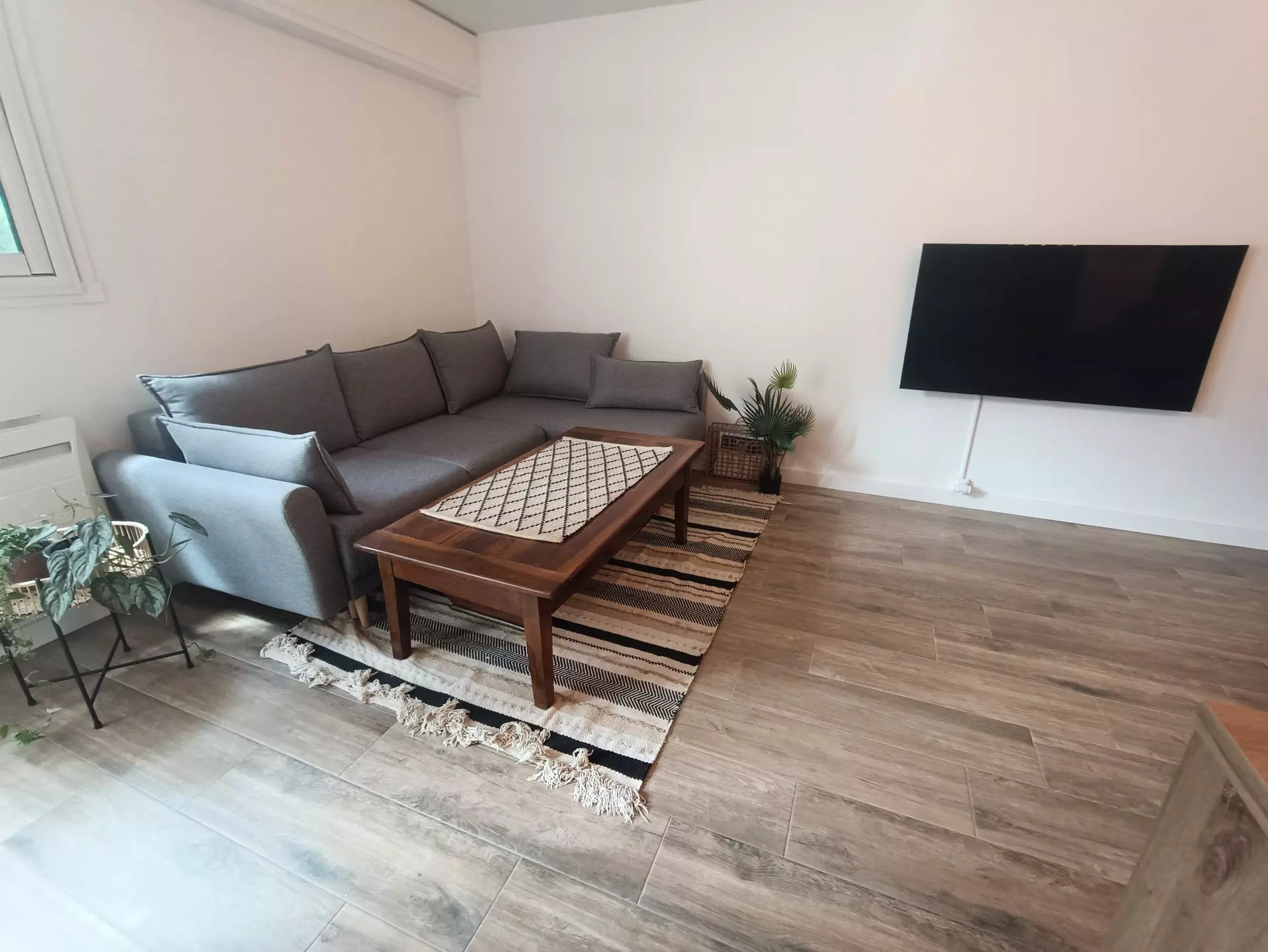 Living room (tiled floor) opening onto balcony: 1 corner sofa (convertible), 1 coffee table, 1 flat screen.