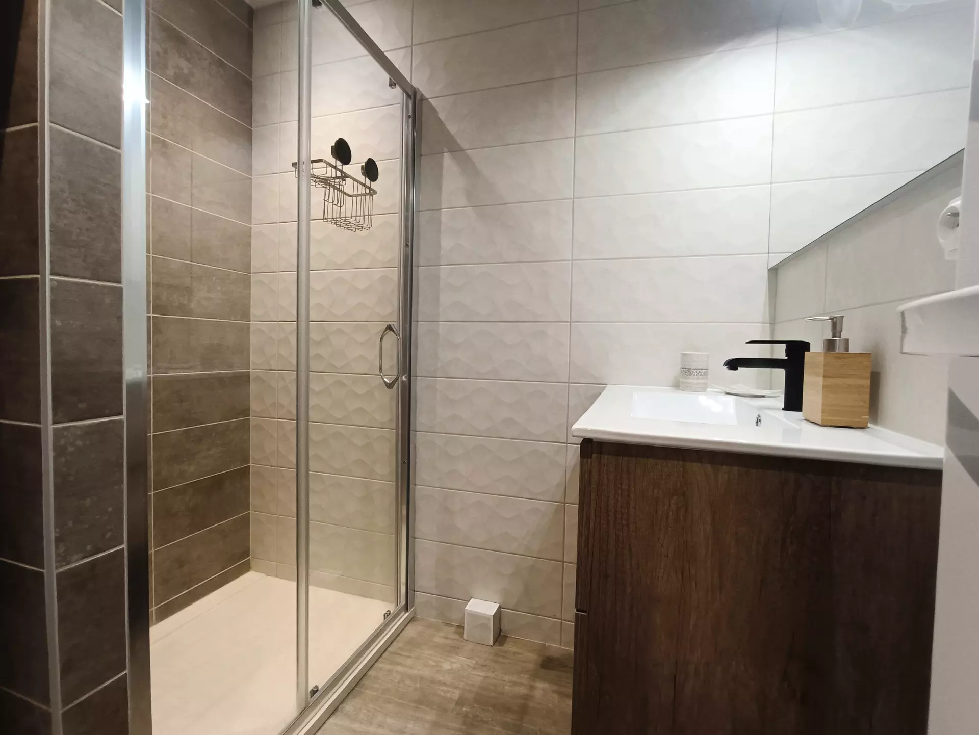 Shower room (tiled): Italian shower, washing machine, vanity unit, electric towel dryer,