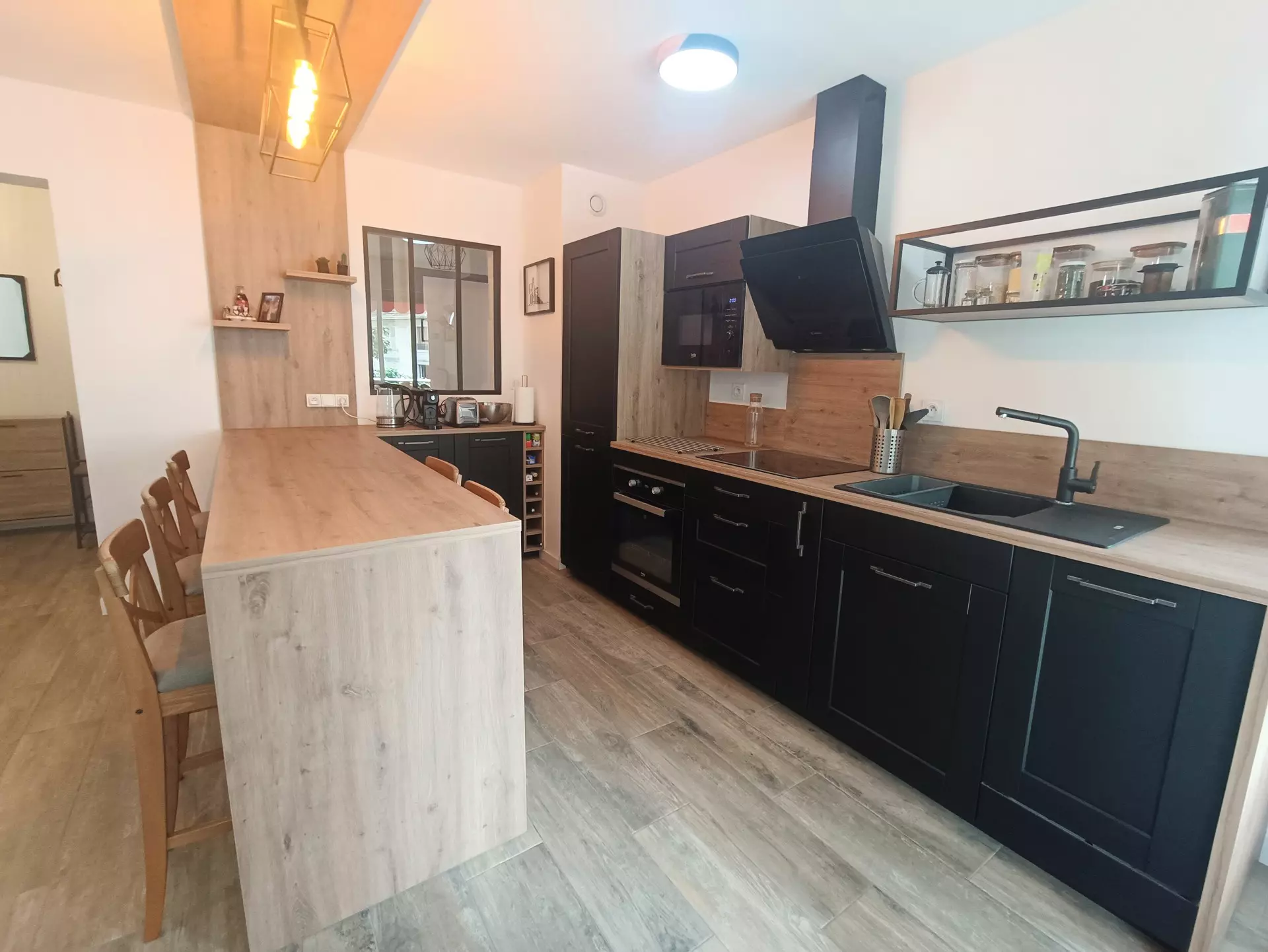 Kitchen open to living room: fridge/freezer, dishwasher, 3 induction hobs, electric oven, microwave, extractor fan, electric coffee maker, kettle, toaster, crockery and cookware.