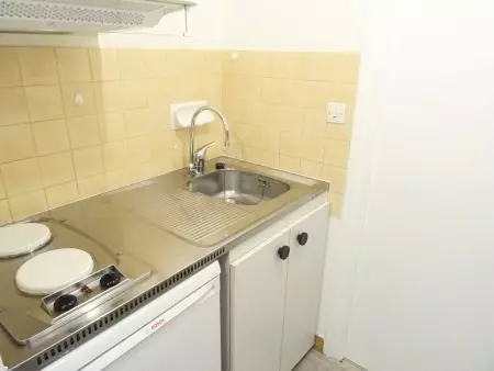 Kitchen unit opening onto entrance (PVC floor): 2 electric hotplates, extractor hood, fridge/freezer, mini oven, microwave, 1 electric coffee maker, extractor hood, toaster, crockery and cookware.