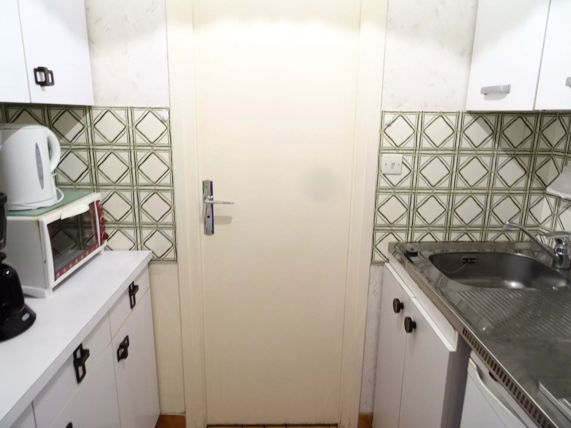 Open kitchen onto entrance (tiled): 2 electric hobs, sink, fridge/freezer compartment, mini oven, microwave, electric coffee maker, kettle, toaster, crockery and cookware.