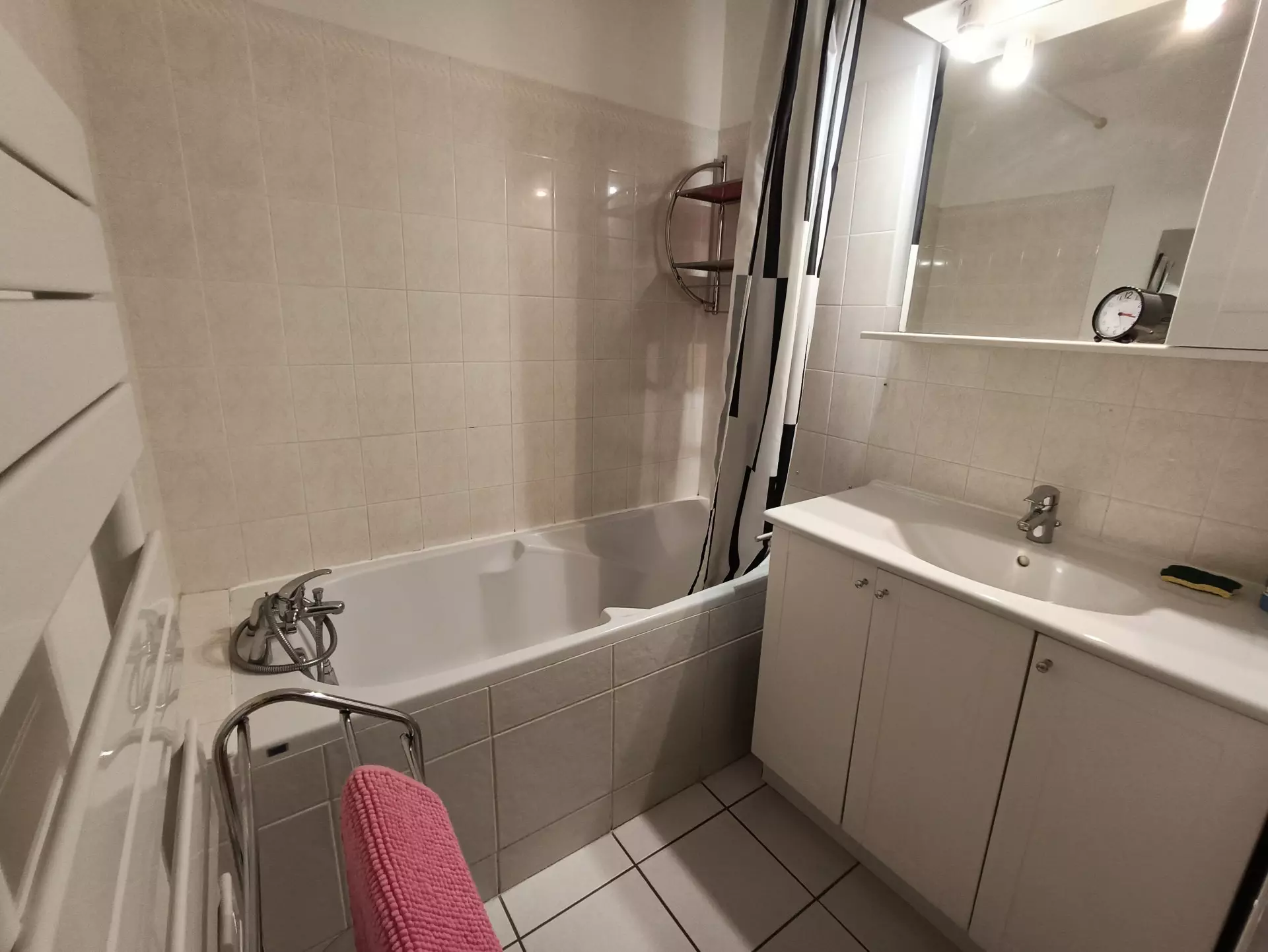 Bathroom (tiled): bathtub (curtain), 1 vanity unit with 4 doors / mirror, 1 towel dryer. Separate WC