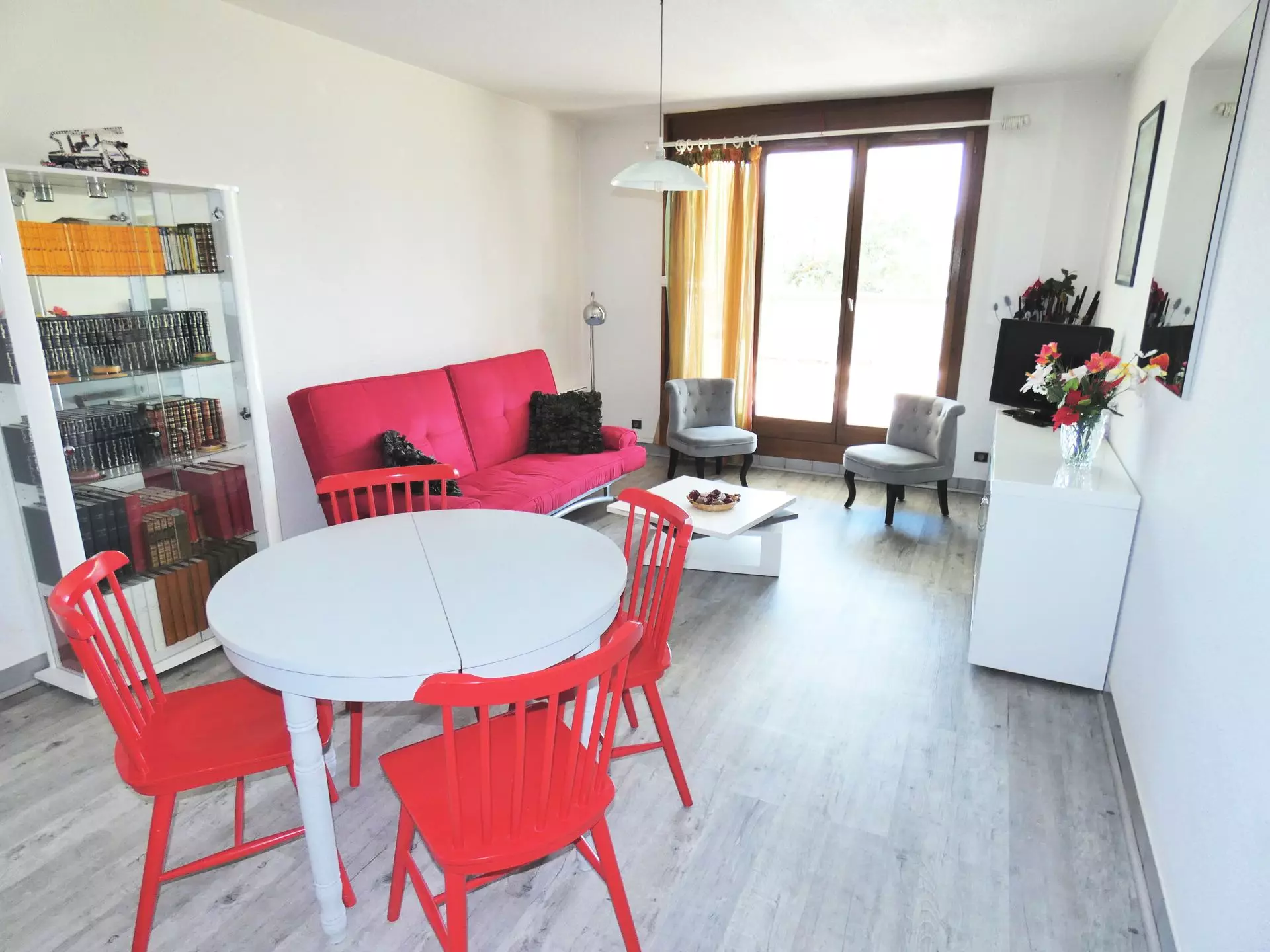 Living room (PVC floor): 1 sofa bed 130cm (1 person), 2 armchairs, 1 coffee table, 1 bookcase, 1 low sideboard, 1 flat screen television