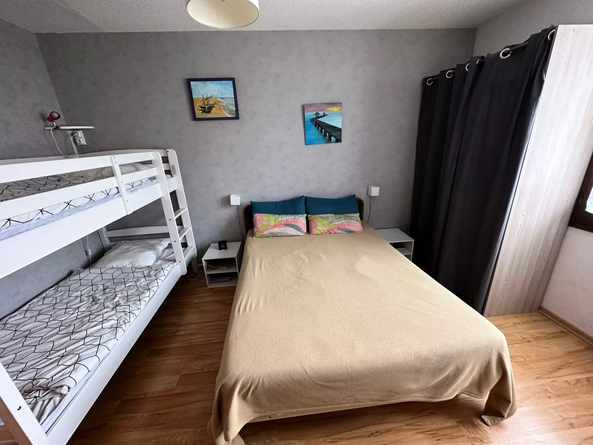 Bedroom with window (PVC floor): 1 double bed, 2 bunk beds (90cm), 2 bedside tables, 2 lamps, 1 chest of drawers with 3 drawers, 1 chair, 1 wardrobe with curtain.