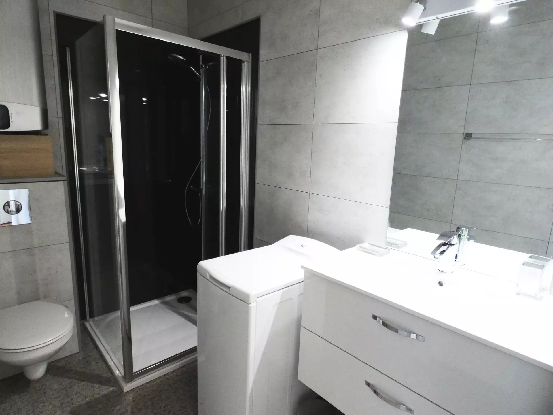 Shower room (tiled) with shower cubicle, vanity unit, washing machine, WC.