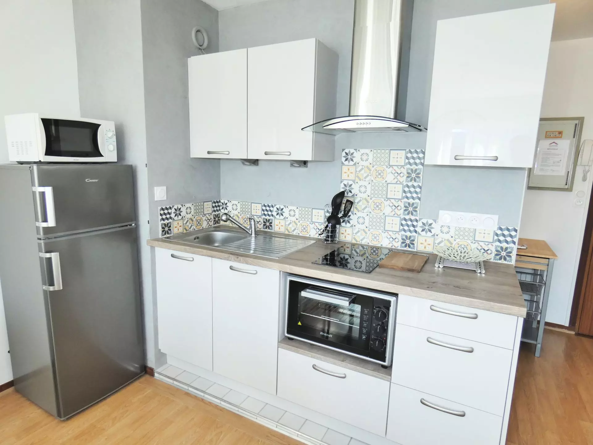 Open kitchen unit (tiled): 2 induction hobs, sink, 1 oven, 1 microwave,