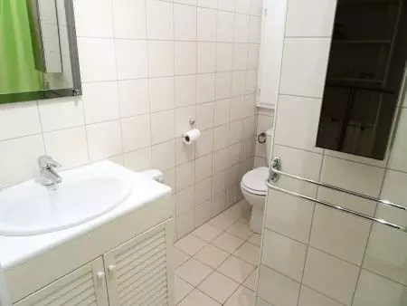 Shower room (tiled): Italian shower, vanity unit, toilet, 1 fan, bathroom cabinet
