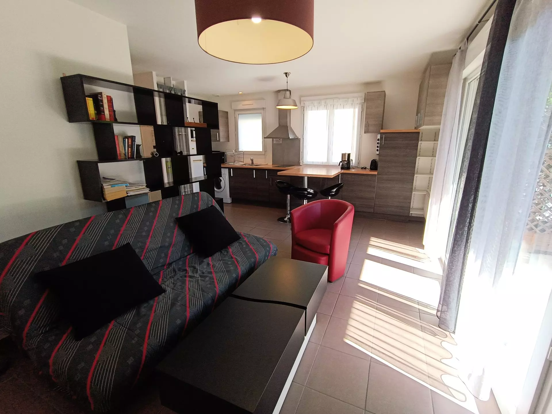 Open kitchen (tiled): fridge/freezer, 2 induction hobs, extractor hood, multifunction oven, mini dishwasher (6 place settings), washing machine with dryer, high table, 3 high chairs, electric coffee maker, toaster, kettle, crockery and cookware.